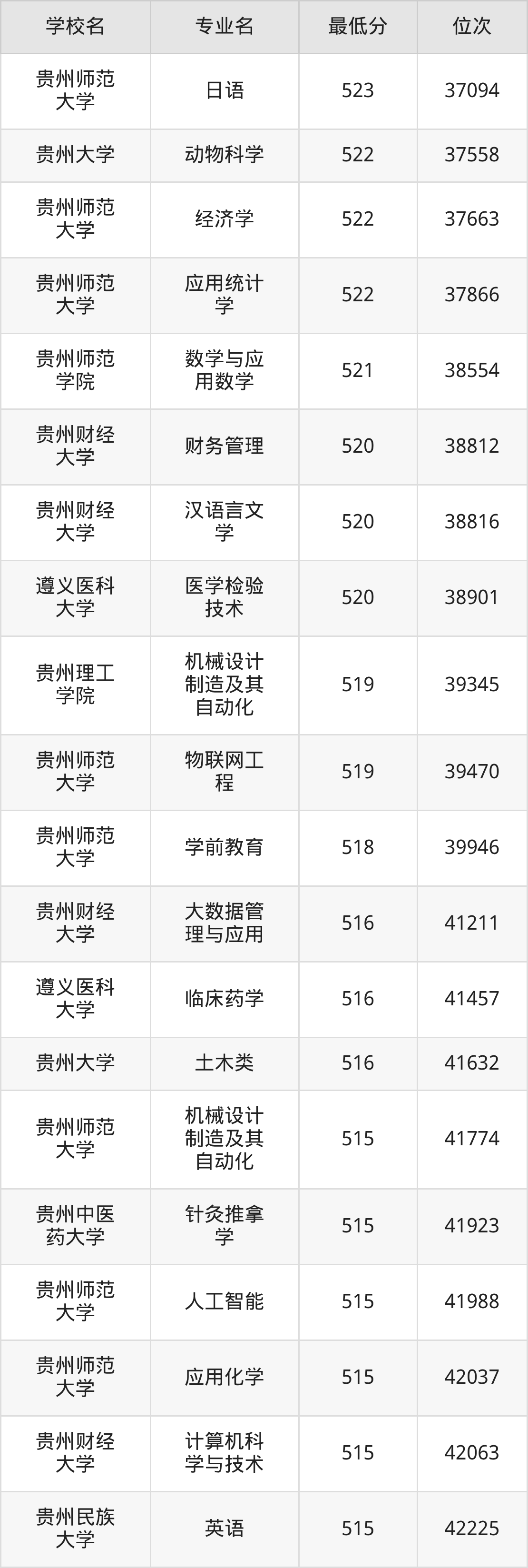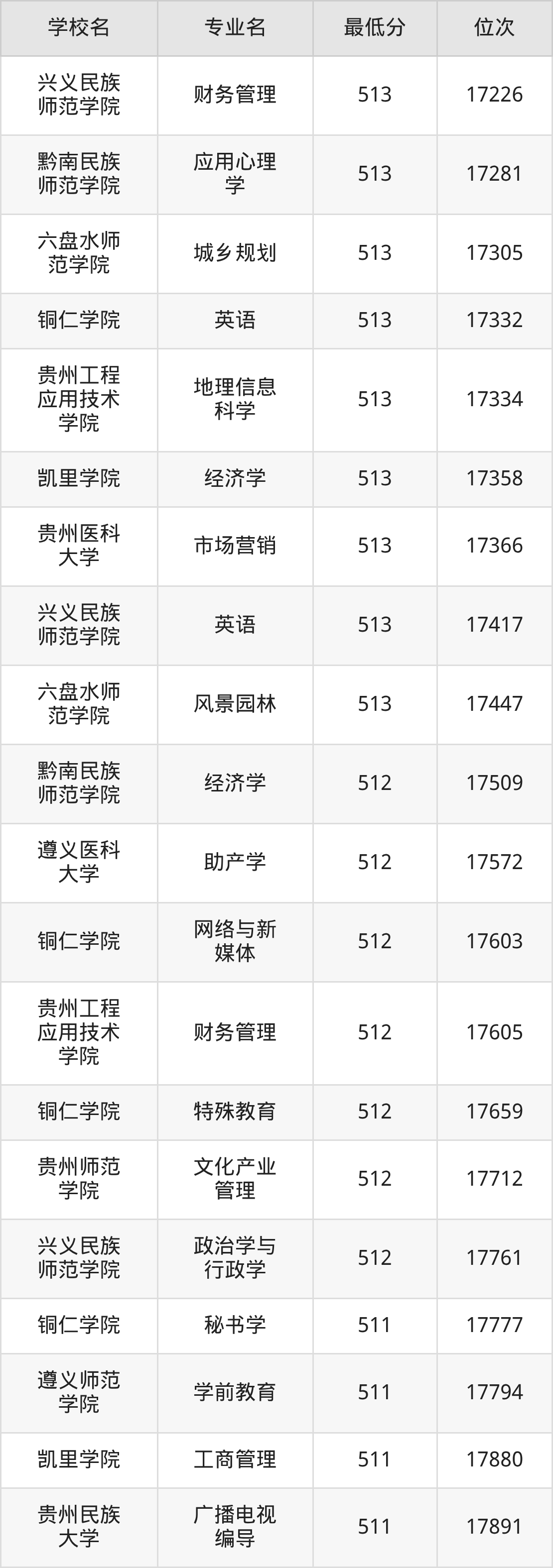 (4)遵义师范学院:2025年公办本科分数线433分到514分,位次区间是114224名到42803名,招生专业有30个,最低为英语、最高为汉语言文学。