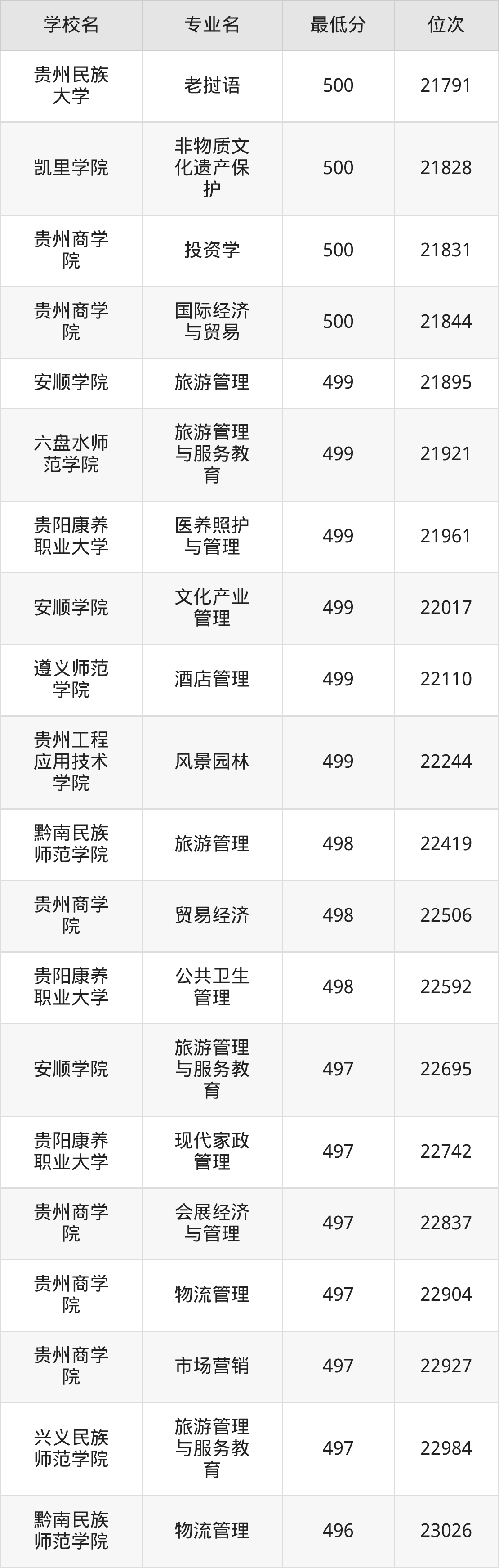 (5)安顺学院:2025年公办本科分数线494分到521分,位次区间是23763名到14968名,招生专业有12个,最低为酒店管理、最高为汉语言文学。