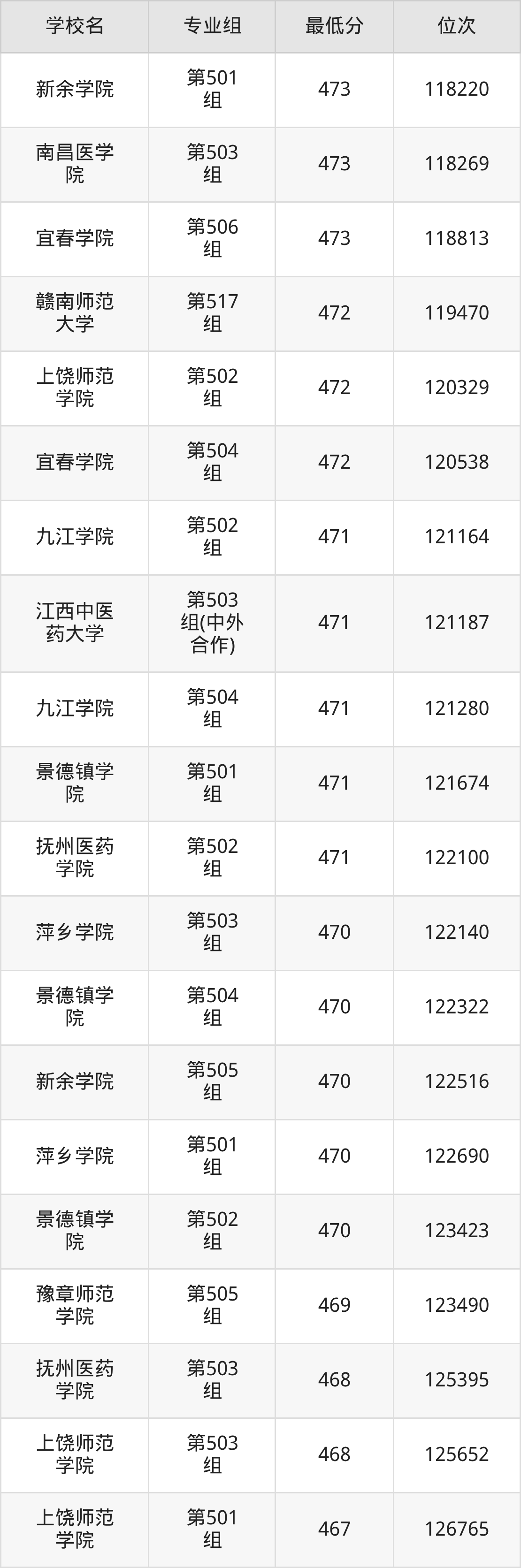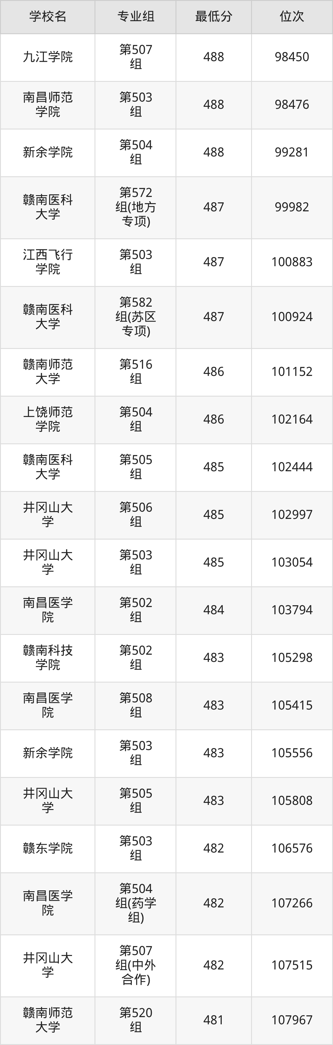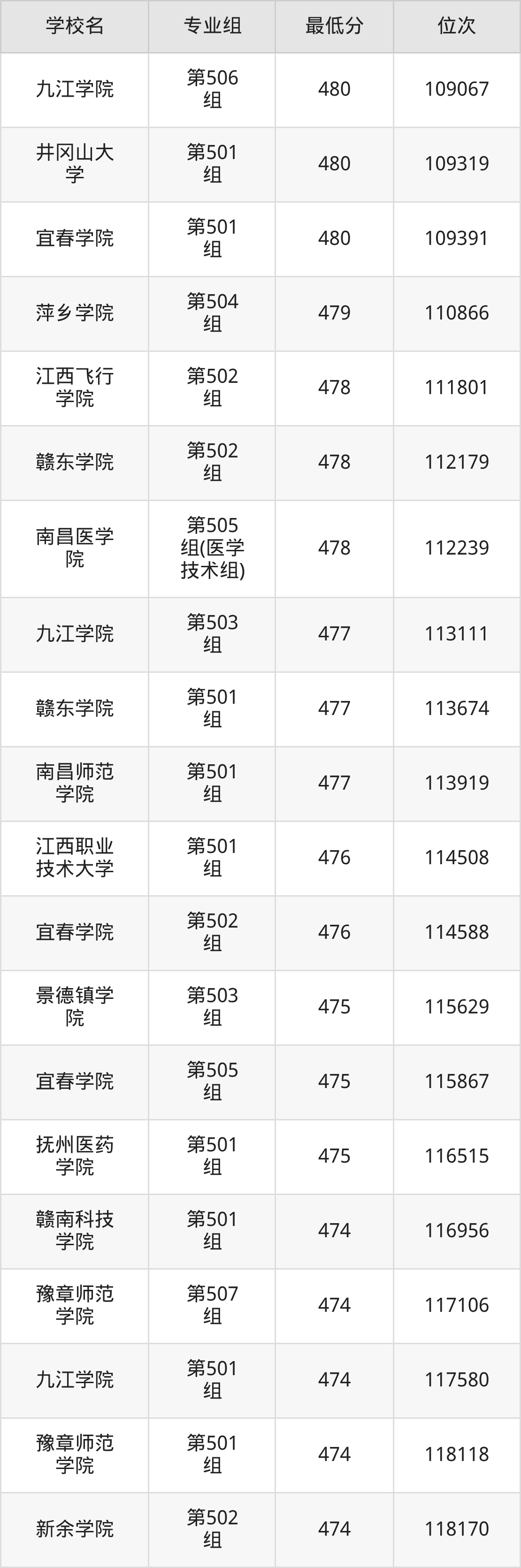 (4)赣东学院:2025年公办本科分数线477分到482分,位次区间是113674名到106576名,招生专业组有3个,最低为第501组、最高为第503组。