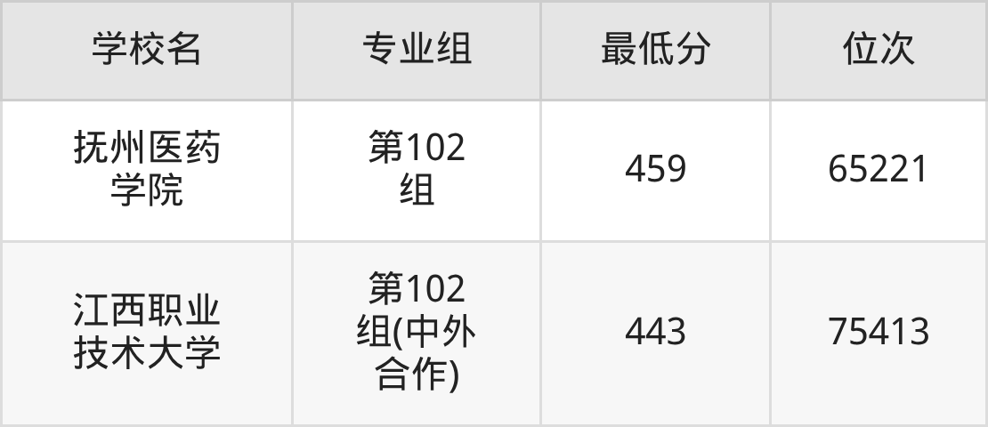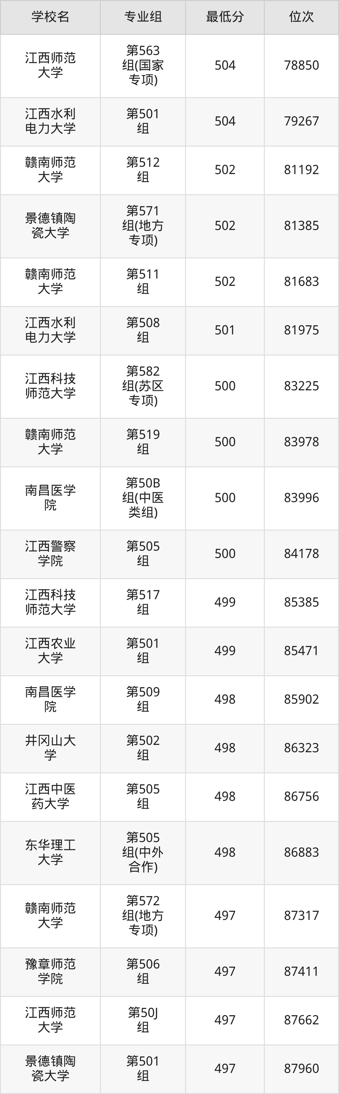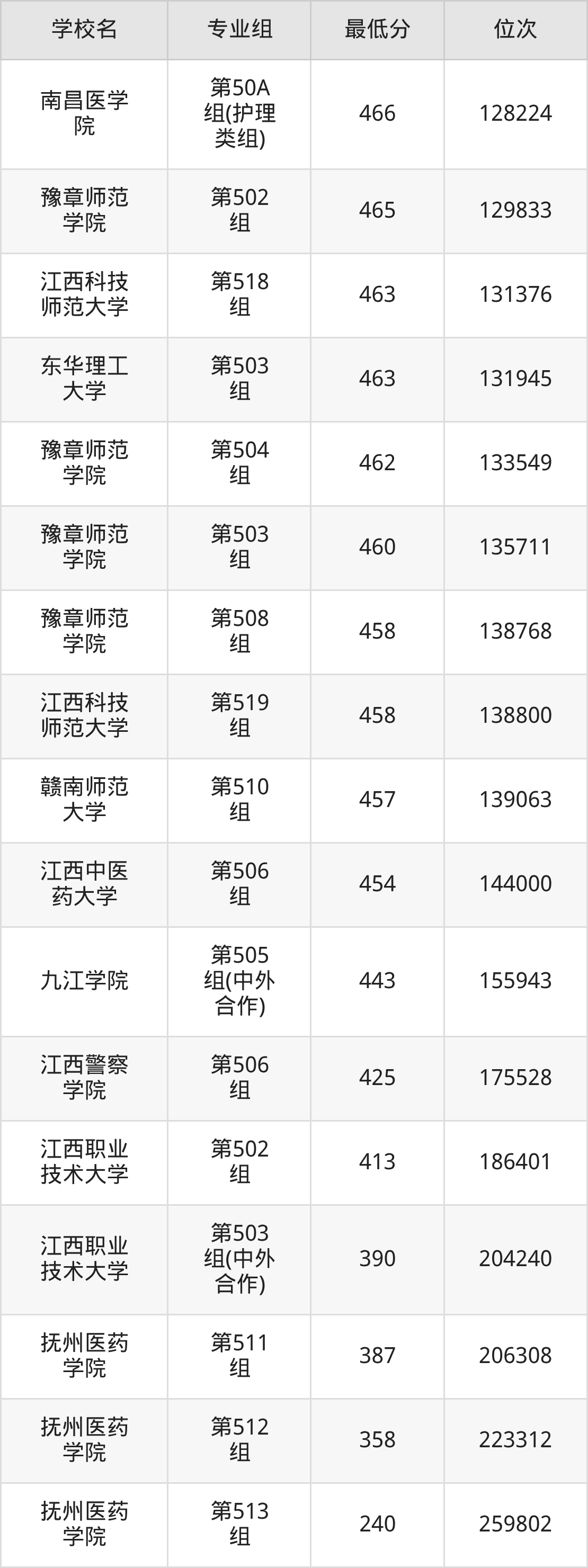 (4)赣东学院:2025年公办本科分数线477分到482分,位次区间是113674名到106576名,招生专业组有3个,最低为第501组、最高为第503组。