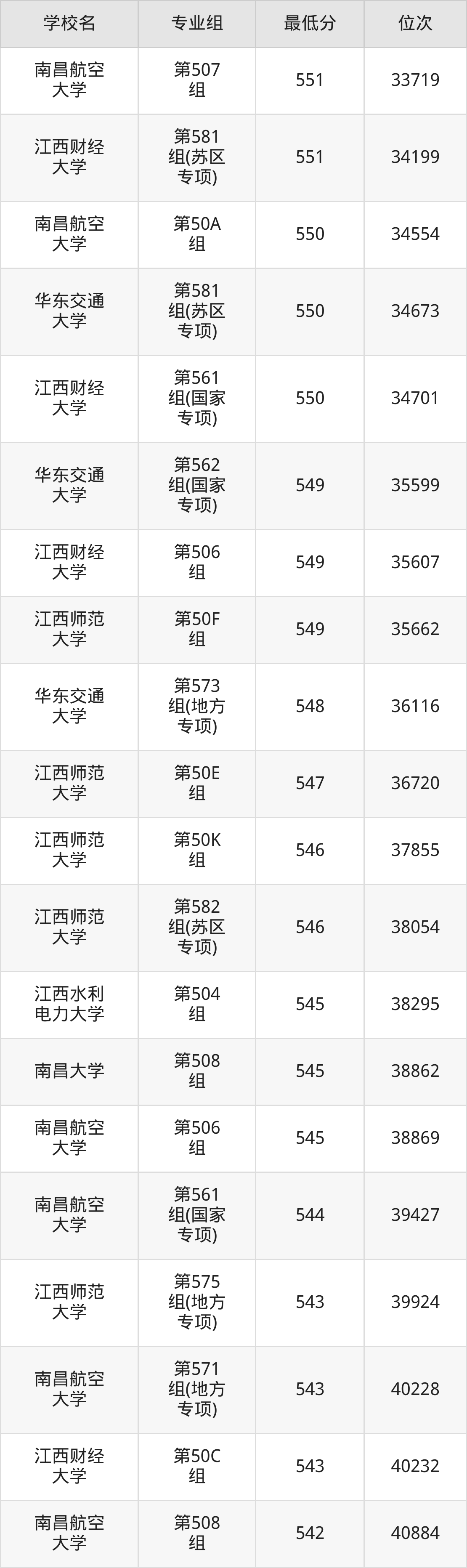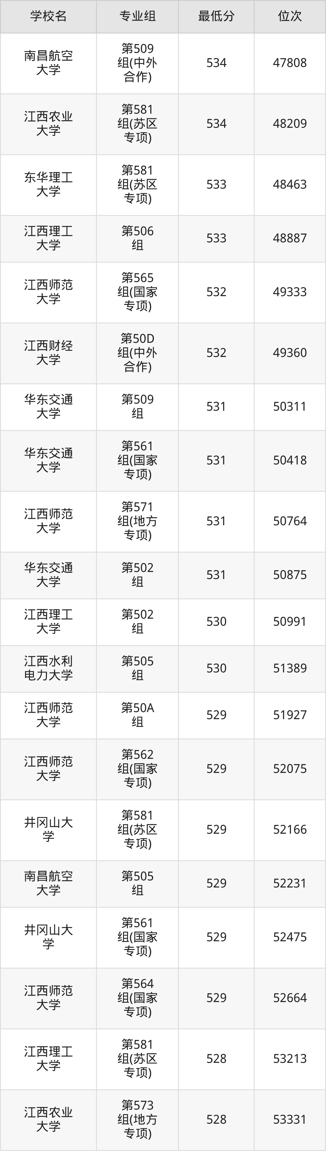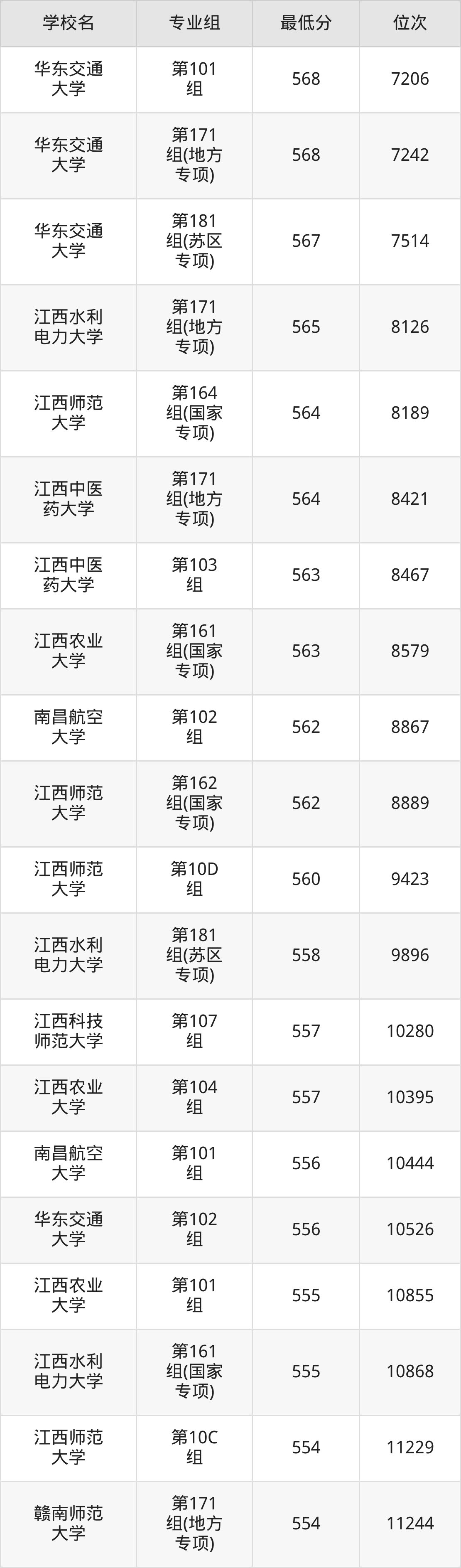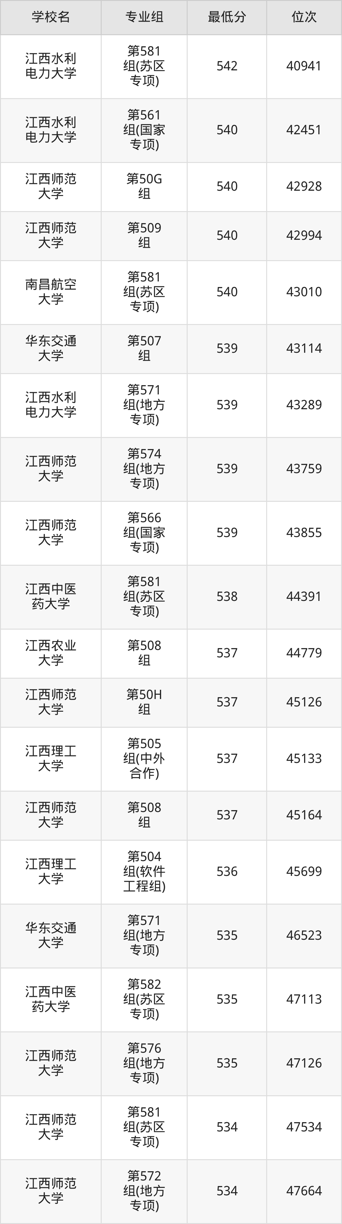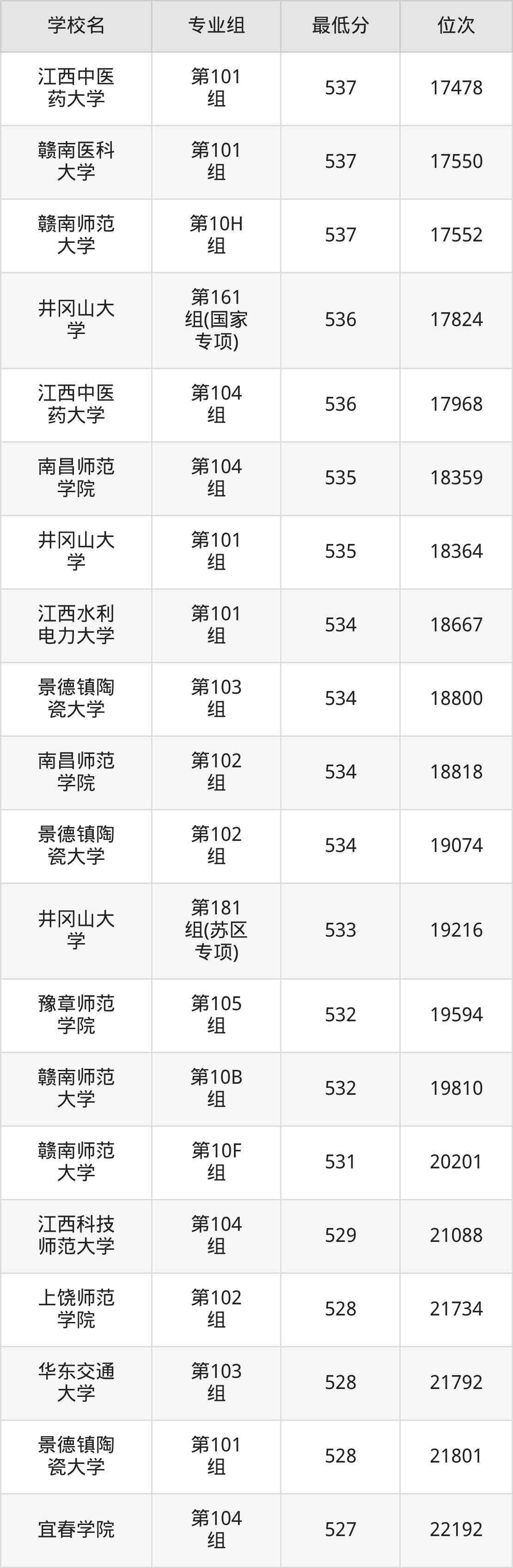 (1)江西水利电力大学:2025年公办本科分数线534分到565分,位次区间是18667名到8126名,招生专业组有4个,最低为第101组、最高为第171组(地方专项)。