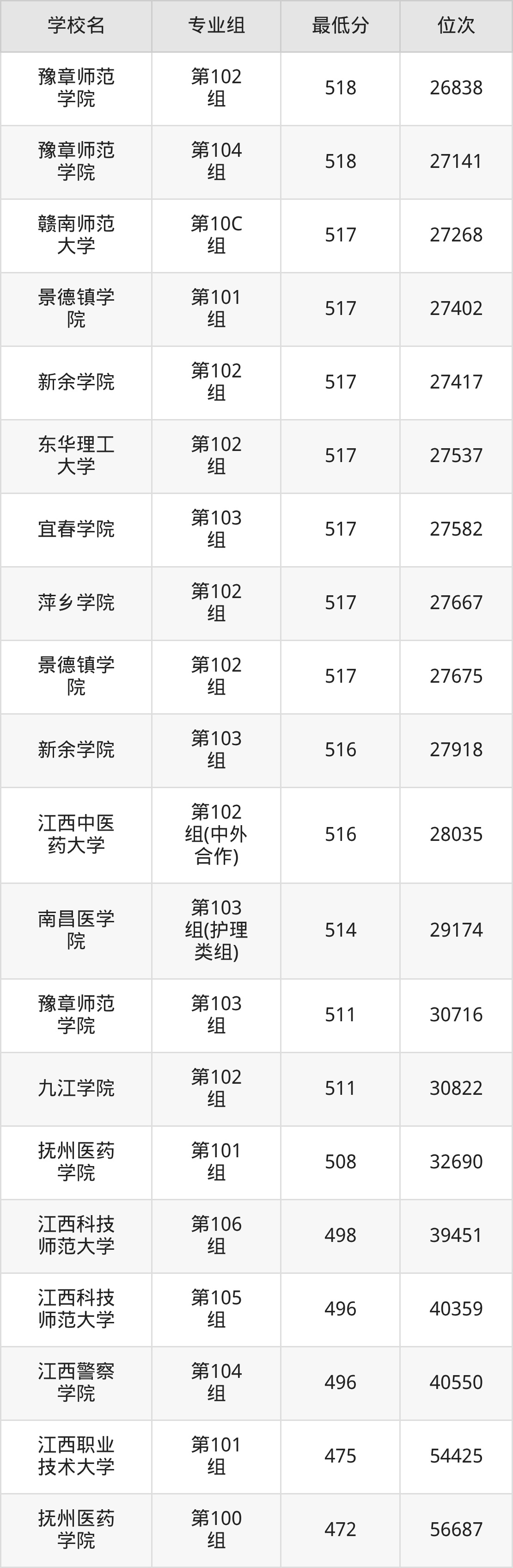 (6)宜春学院:2025年公办本科分数线517分到527分,位次区间是27582名到22192名,招生专业组有4个,最低为第103组、最高为第104组。