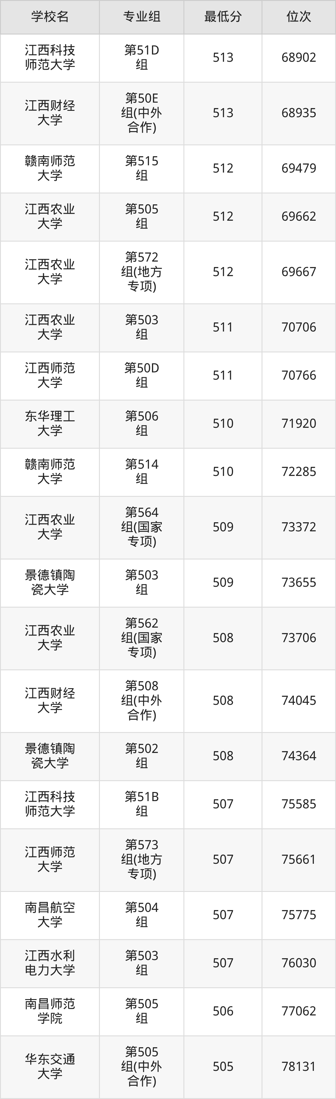 (5)江西财经大学:2025年公办本科分数线508分到580分,位次区间是74045名到16807名,招生专业组有20个,最低为第508组(中外合作)、最高为第509组。