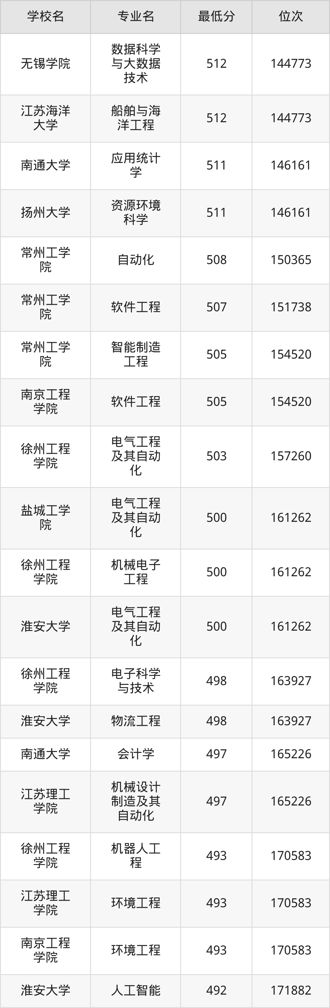 (2)淮安大学:2025年中外合作办学分数线488分到500分,位次区间是177019名到161262名,招生专业有4个,最低为数据科学与大数据技术、最高为电气工程及其自动化。