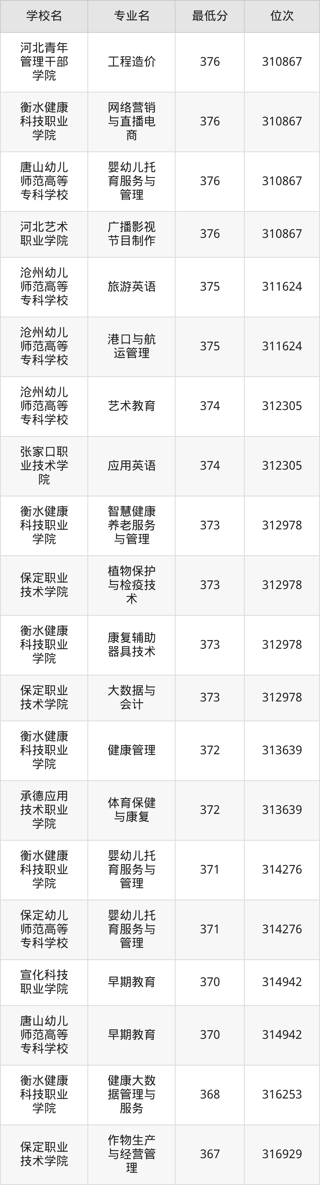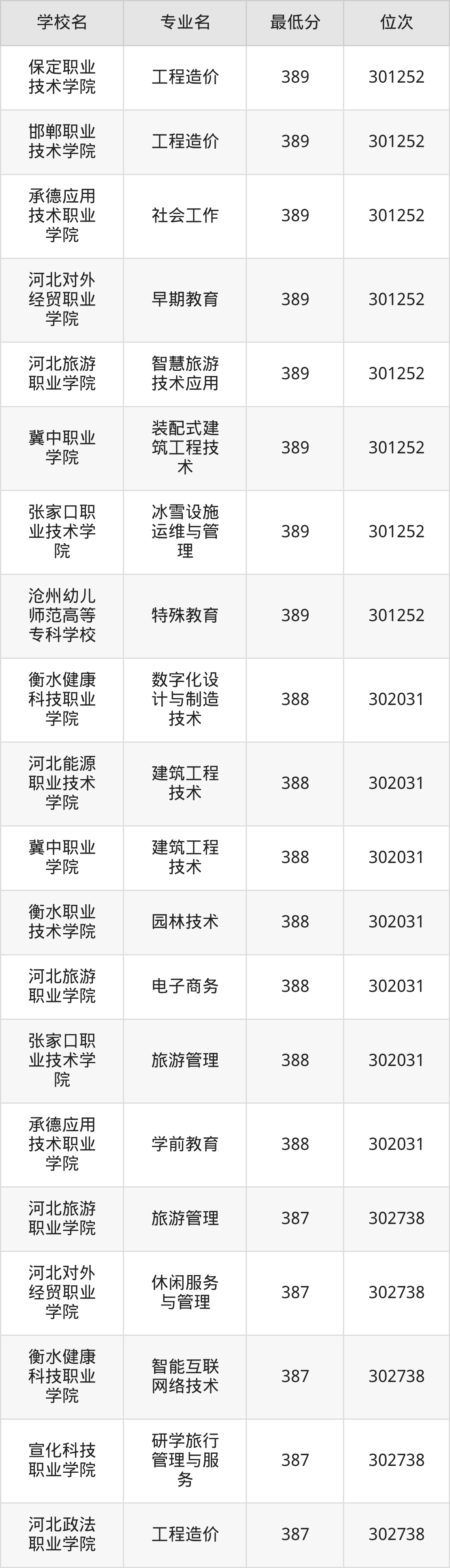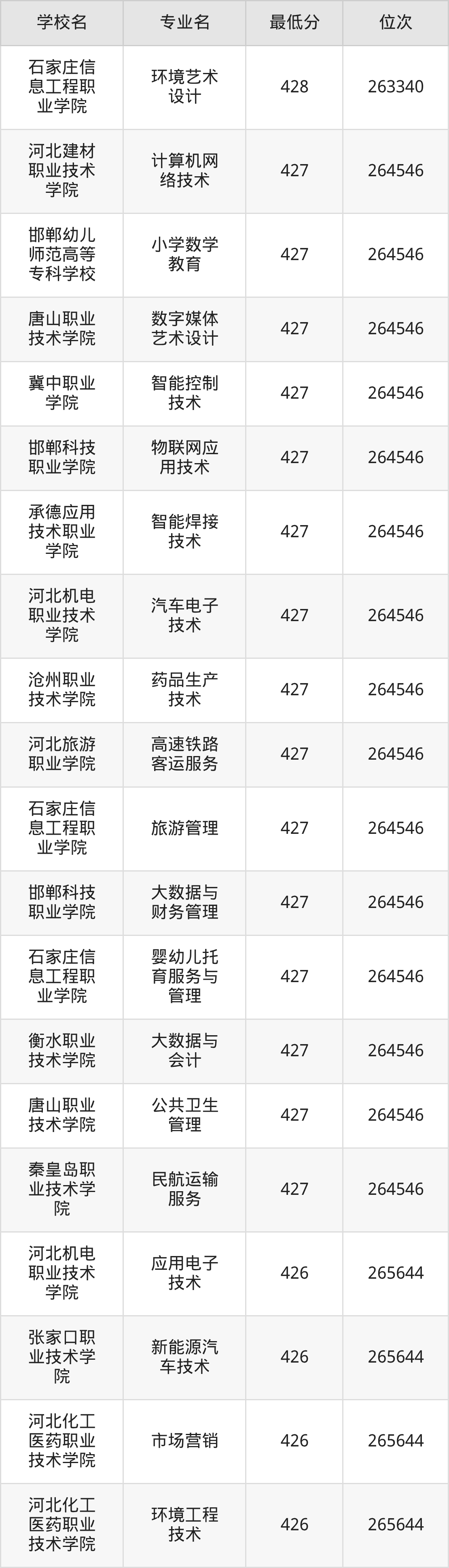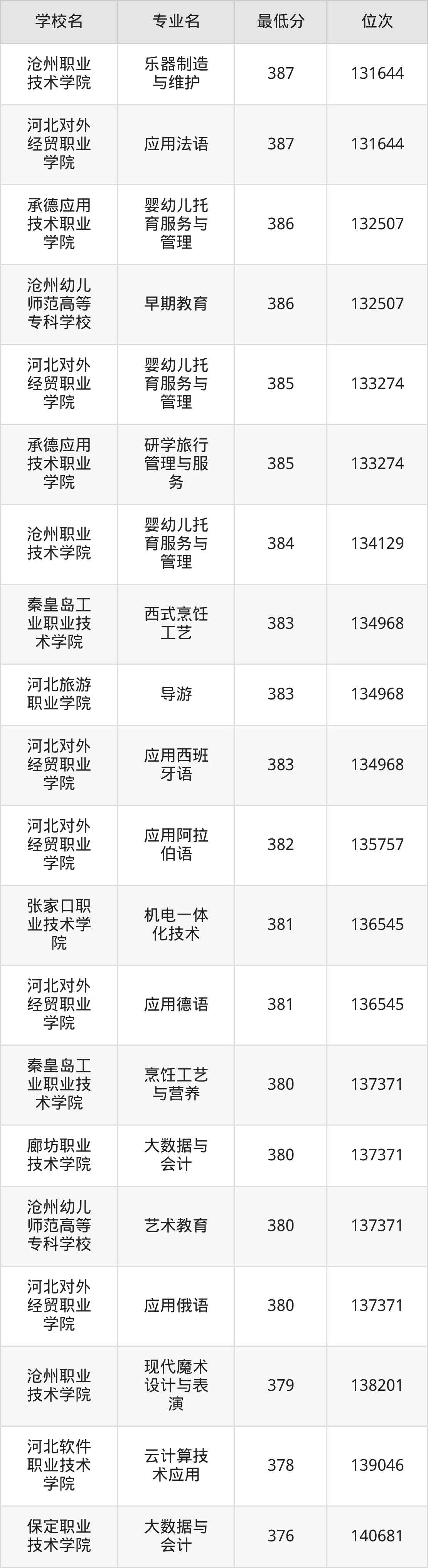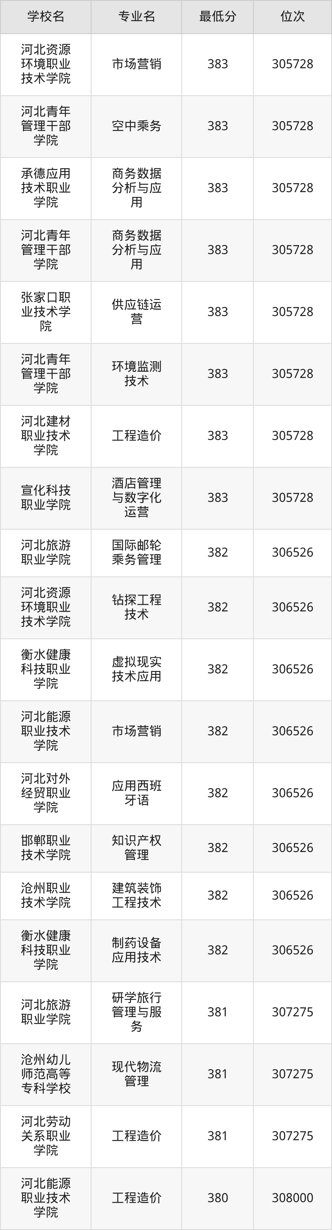 (3)河北建材职业技术学院:2025年公办大专分数线383分到451分,位次区间是305728名到235189名,招生专业有17个,最低为工程造价、最高为机电一体化技术。