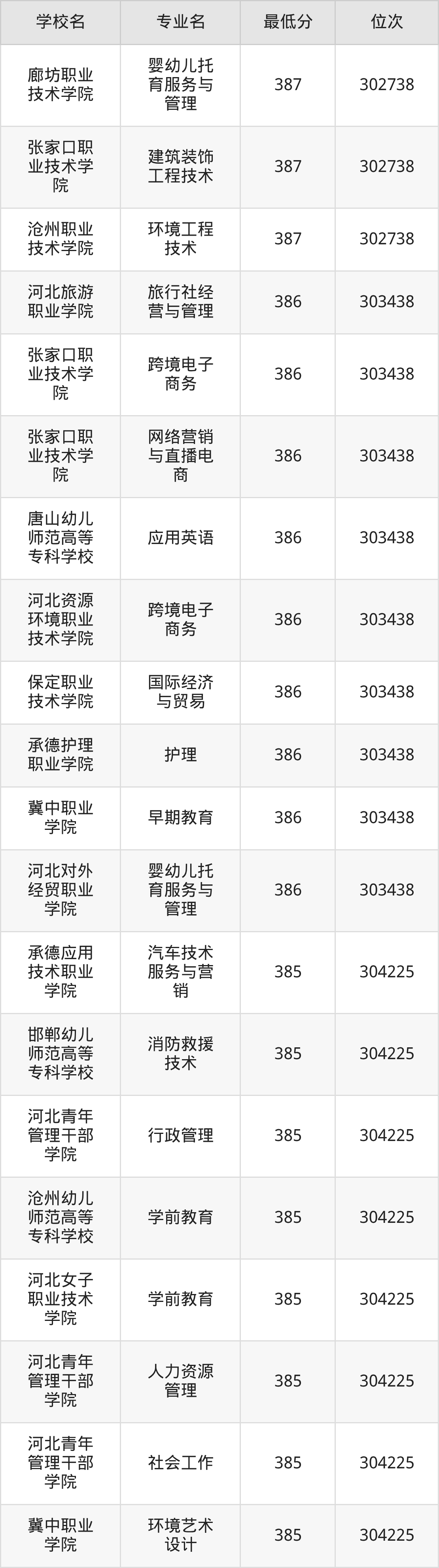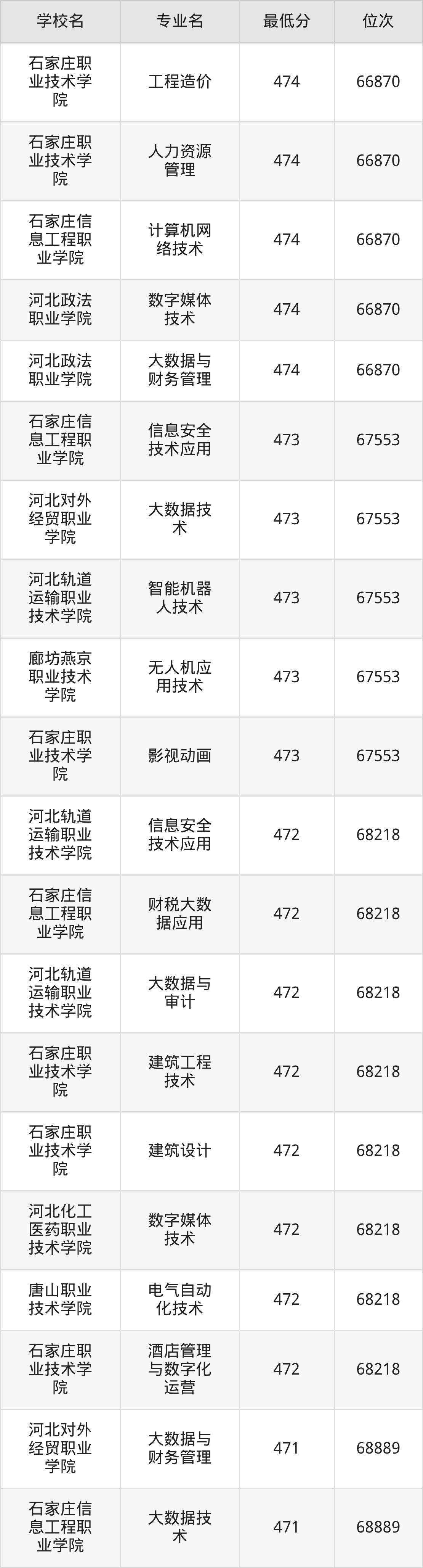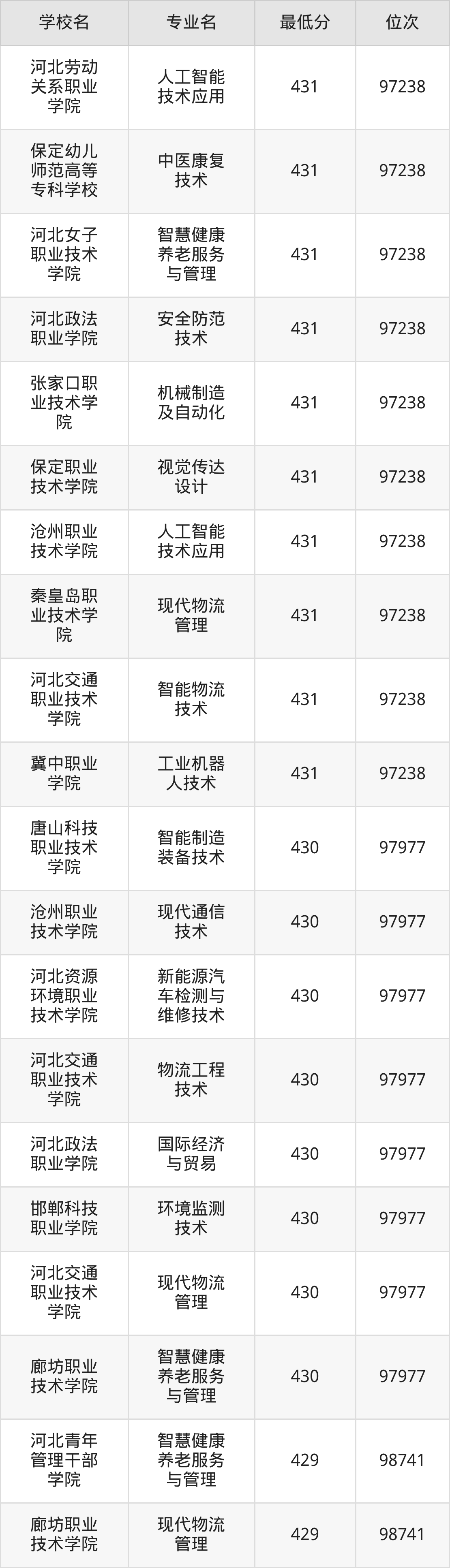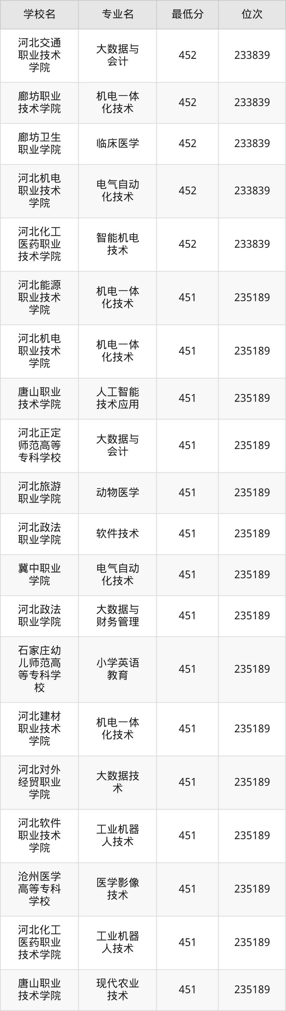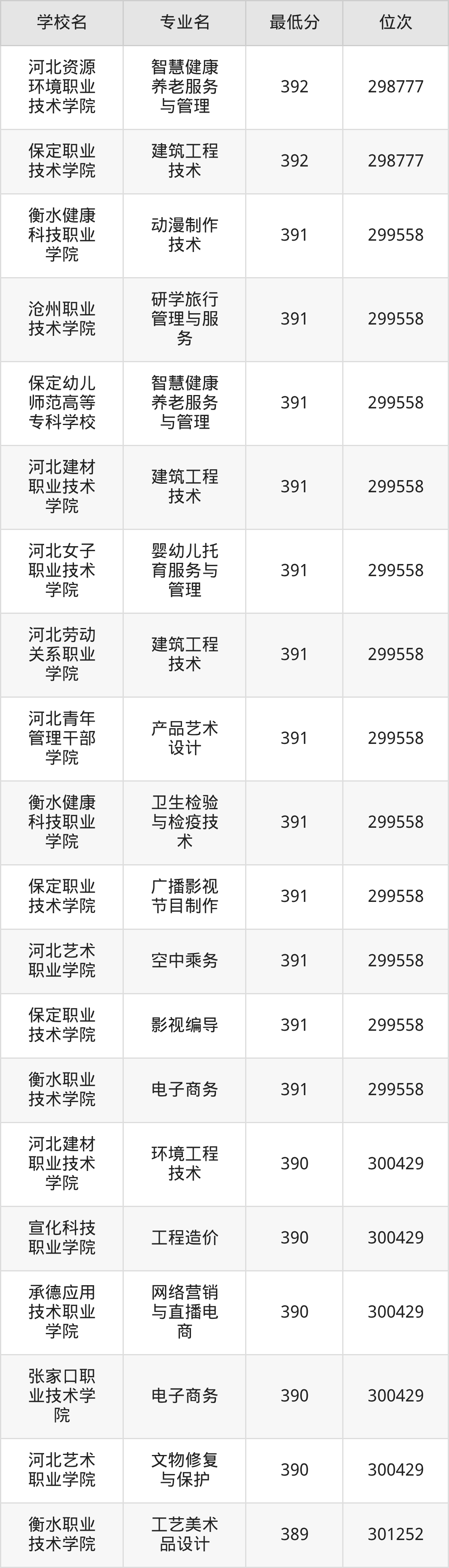 (3)河北建材职业技术学院:2025年公办大专分数线383分到451分,位次区间是305728名到235189名,招生专业有17个,最低为工程造价、最高为机电一体化技术。