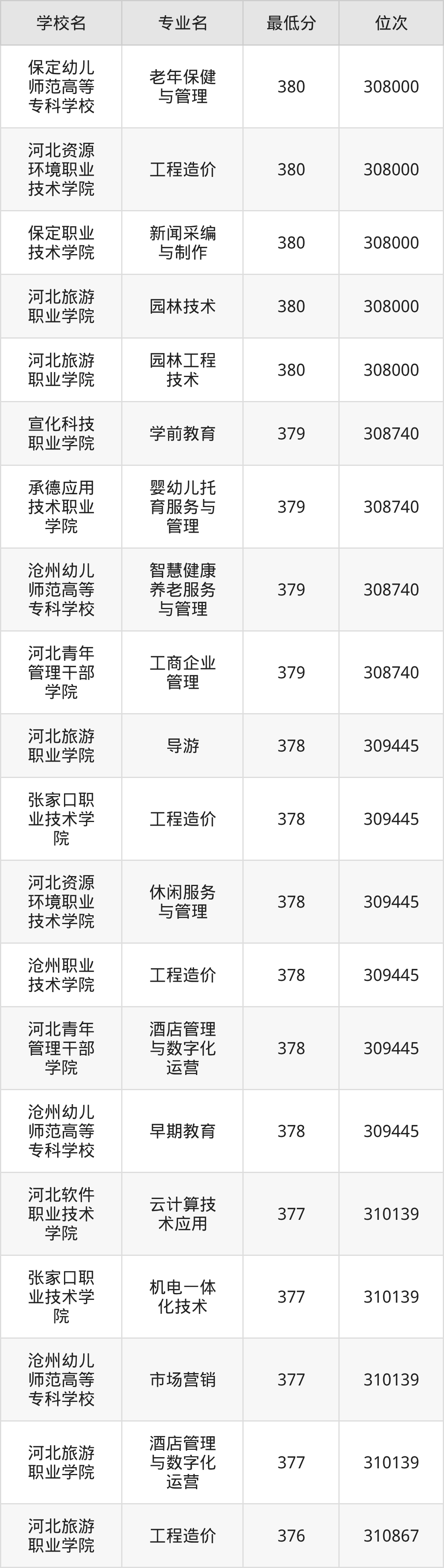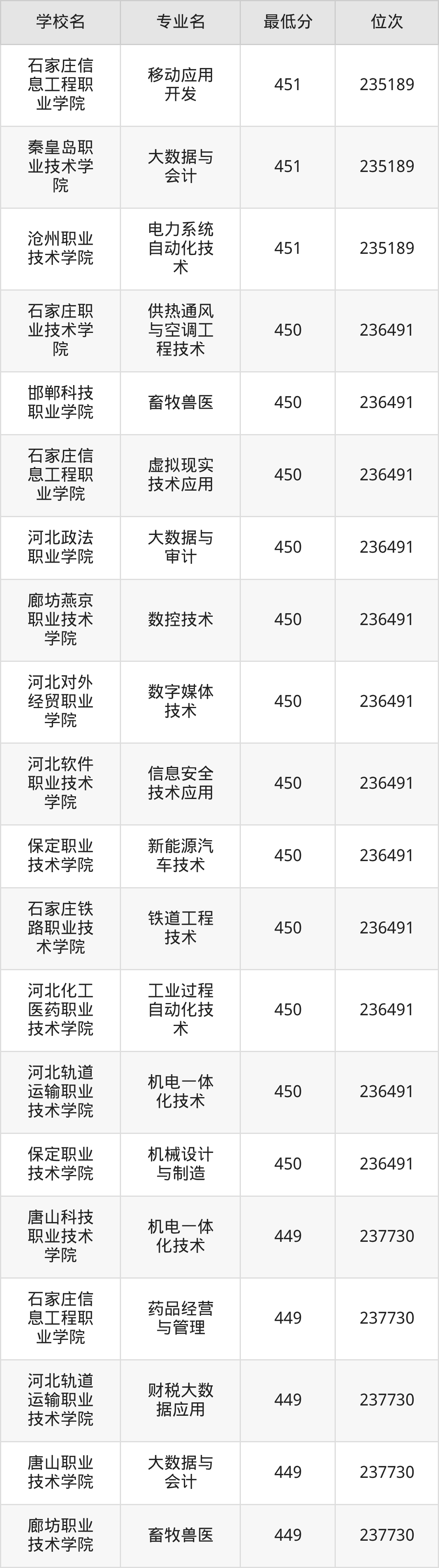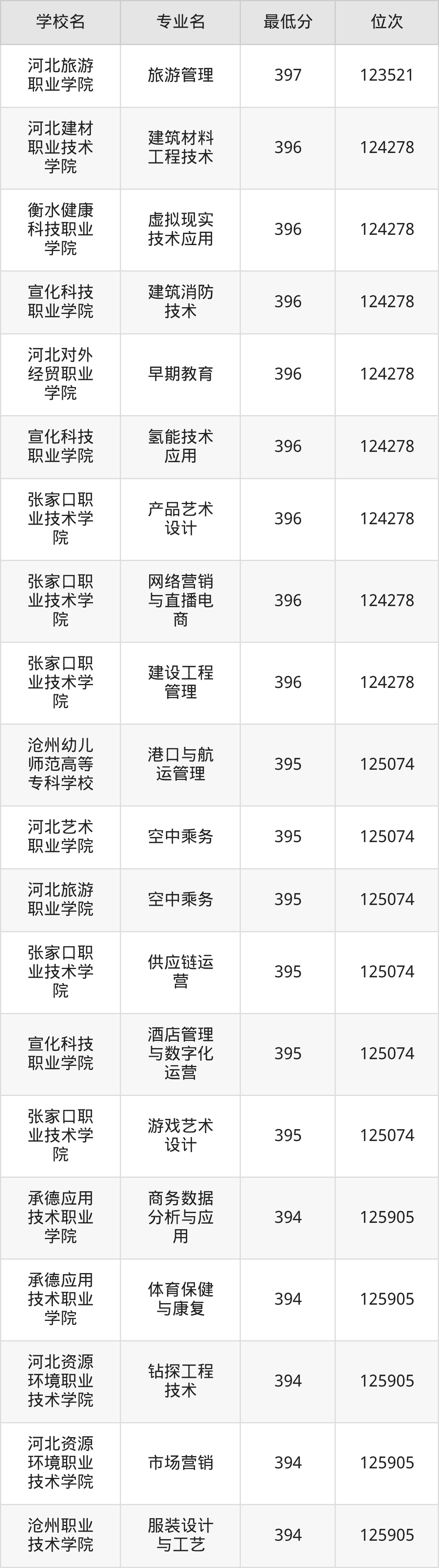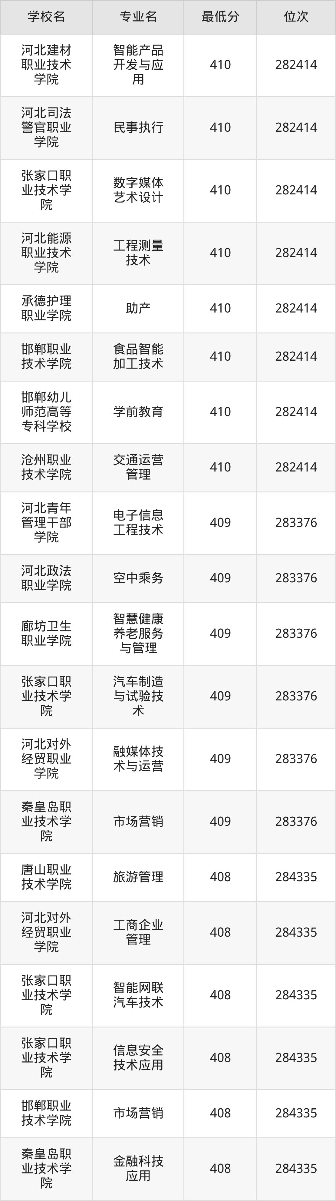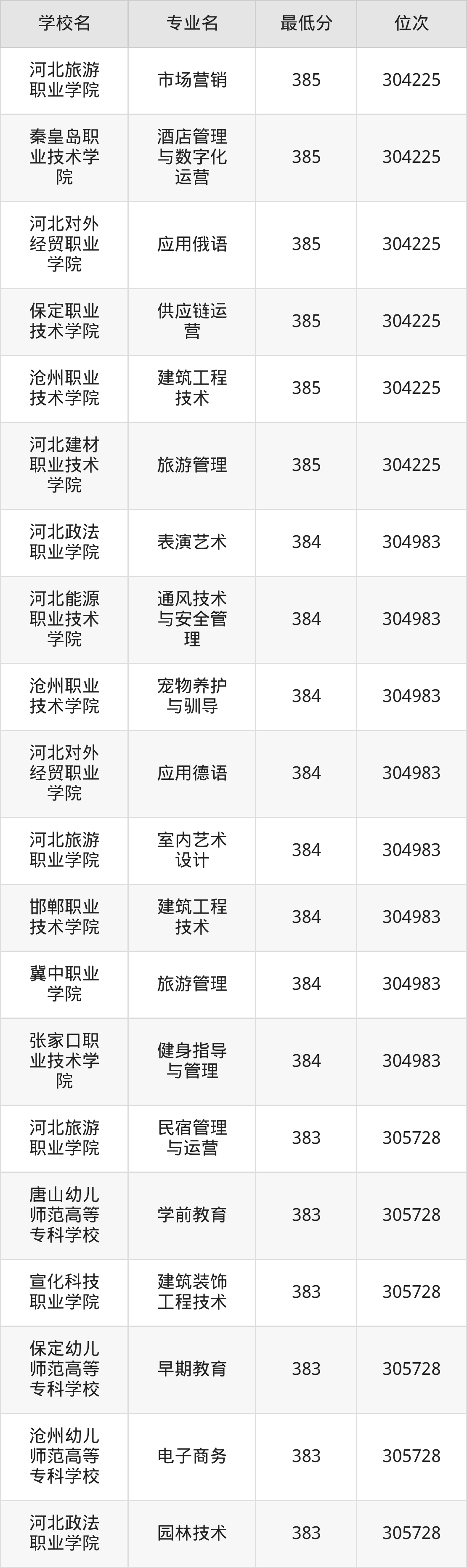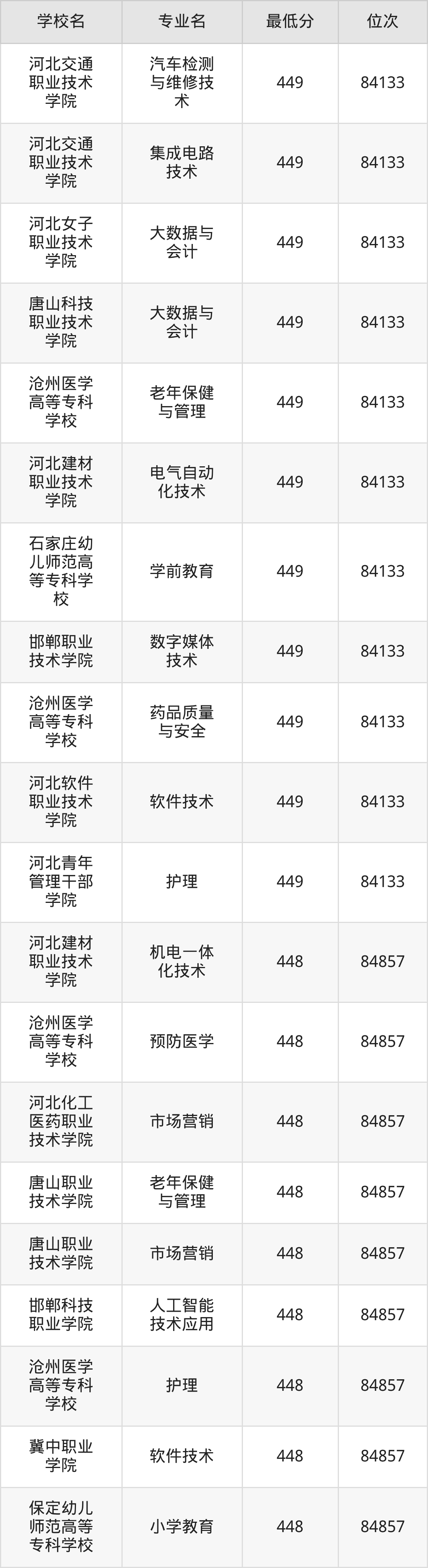 (3)河北建材职业技术学院:2025年公办大专分数线383分到451分,位次区间是305728名到235189名,招生专业有17个,最低为工程造价、最高为机电一体化技术。