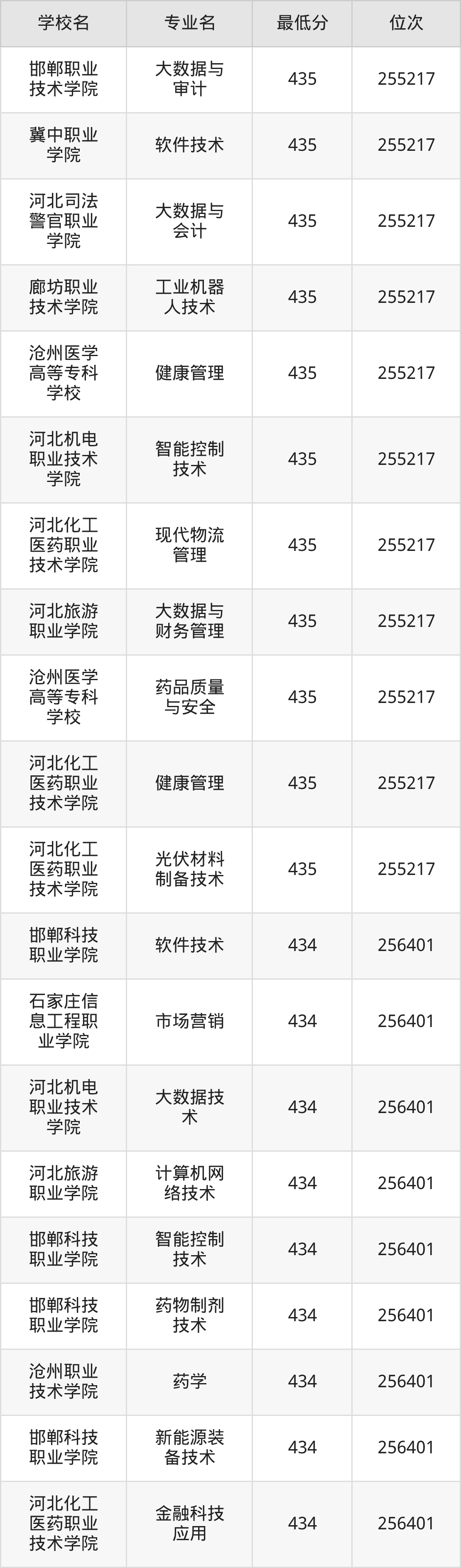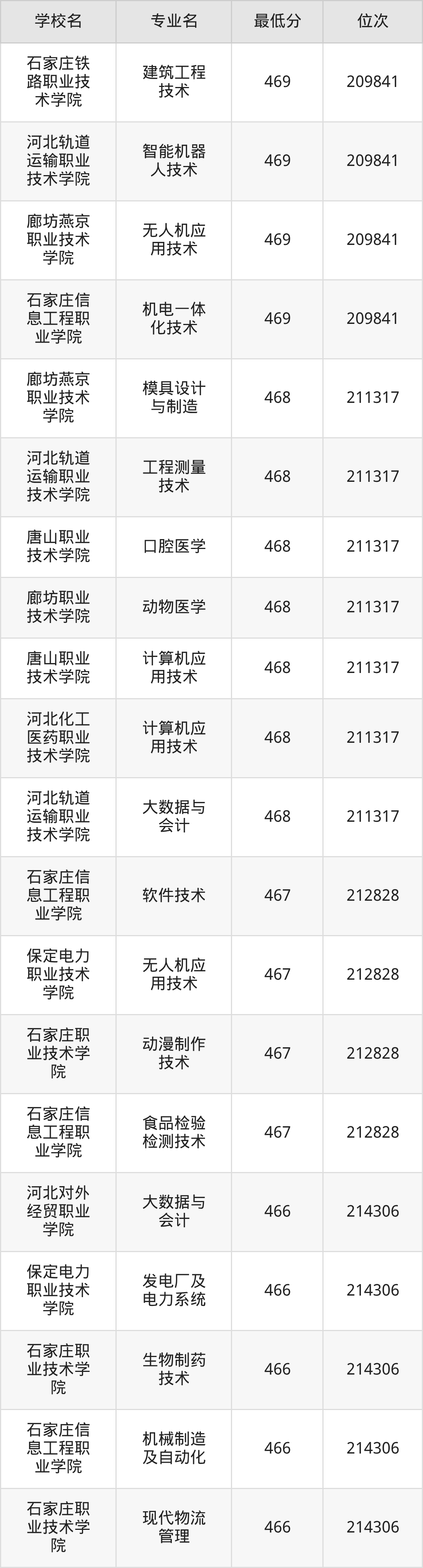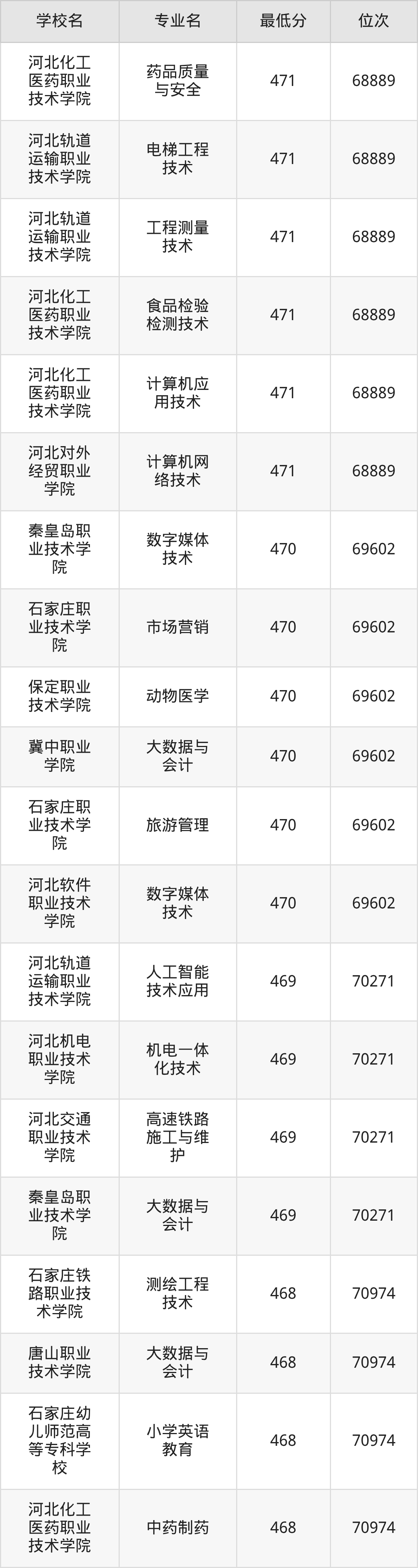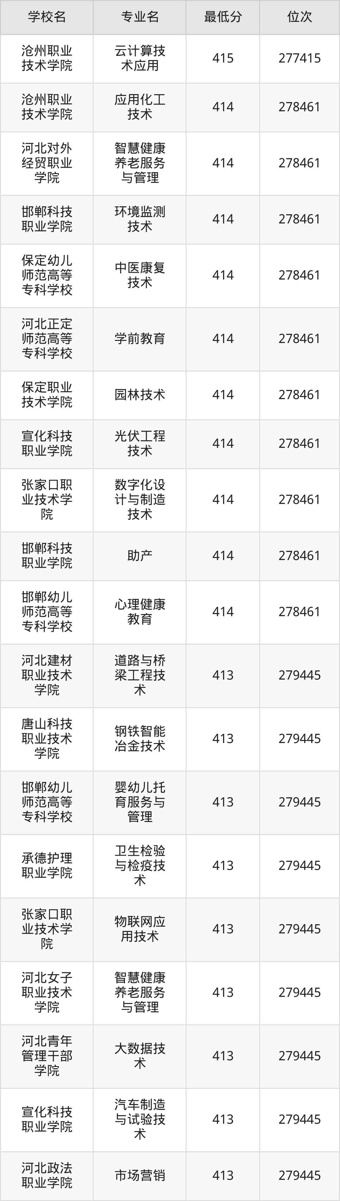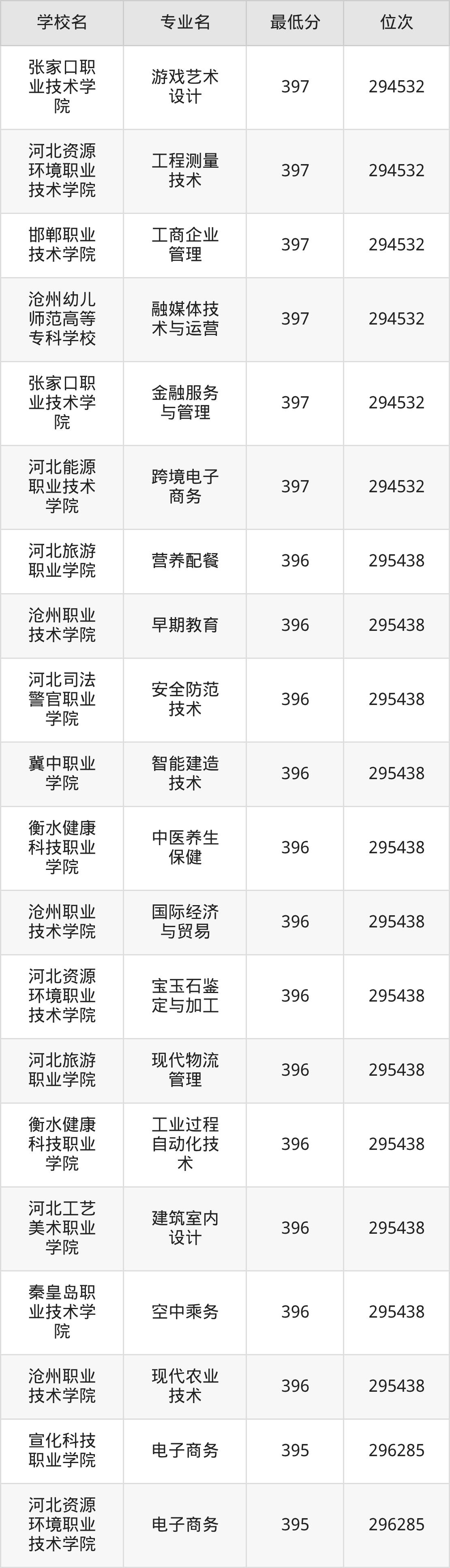 (3)河北建材职业技术学院:2025年公办大专分数线383分到451分,位次区间是305728名到235189名,招生专业有17个,最低为工程造价、最高为机电一体化技术。