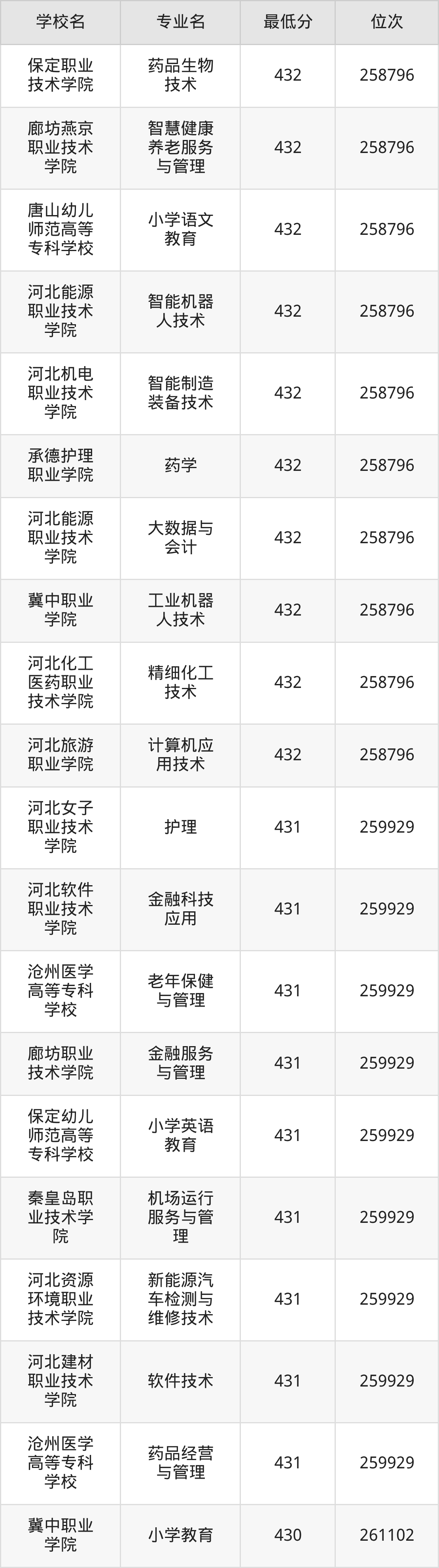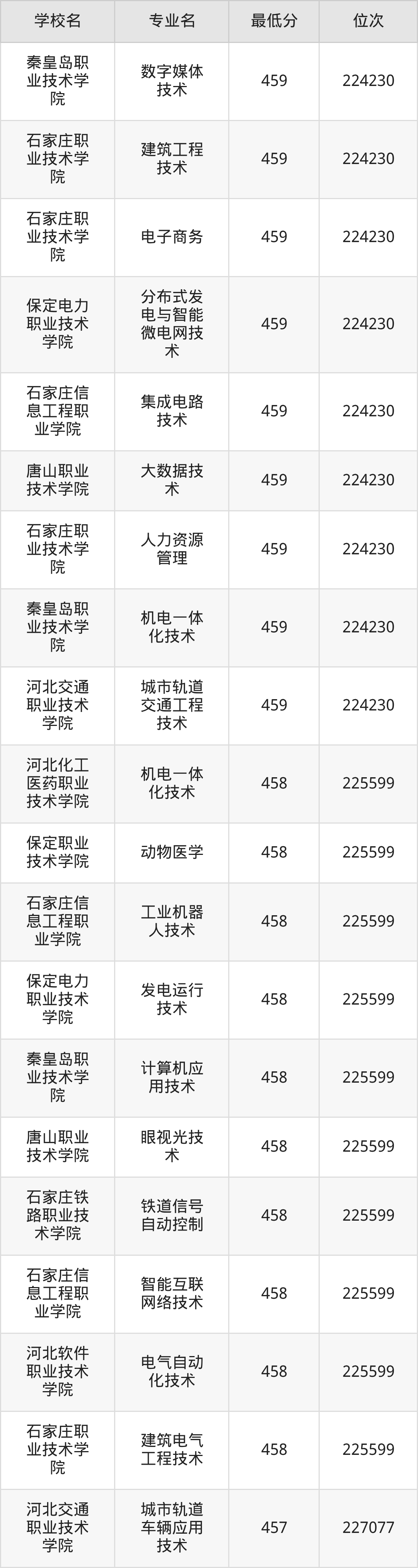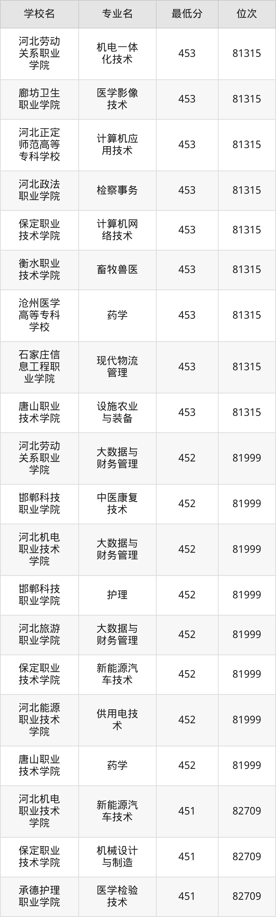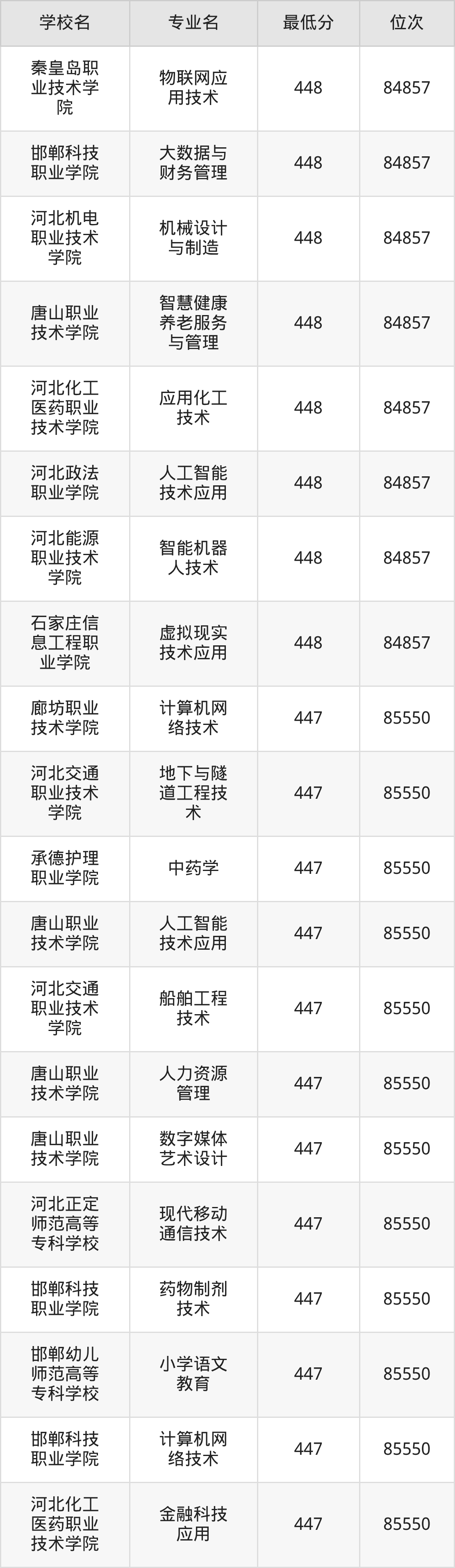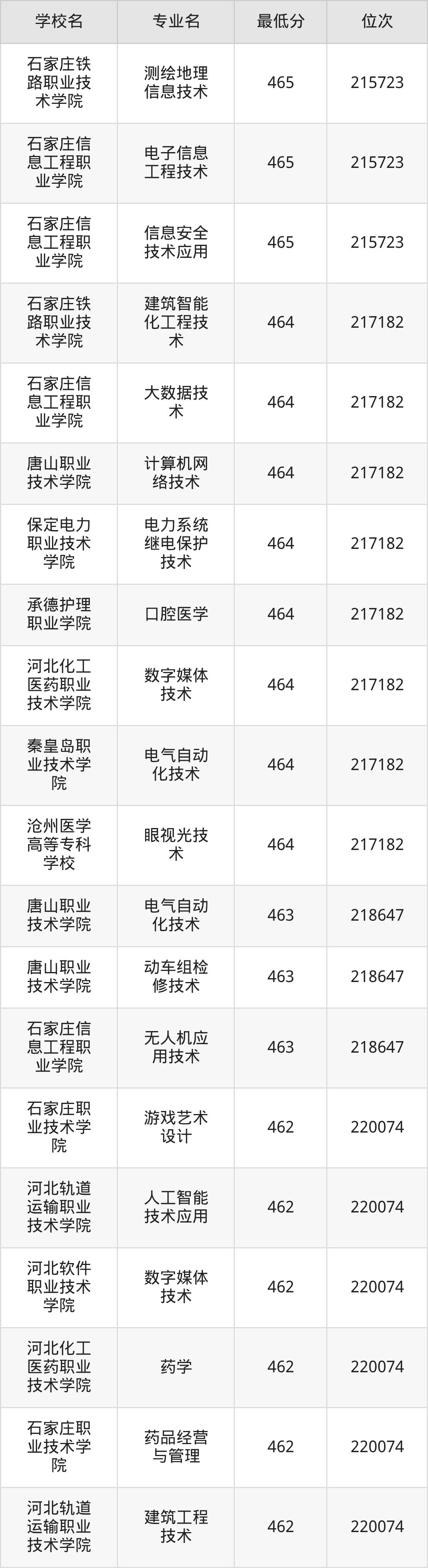 (3)河北建材职业技术学院:2025年公办大专分数线383分到451分,位次区间是305728名到235189名,招生专业有17个,最低为工程造价、最高为机电一体化技术。