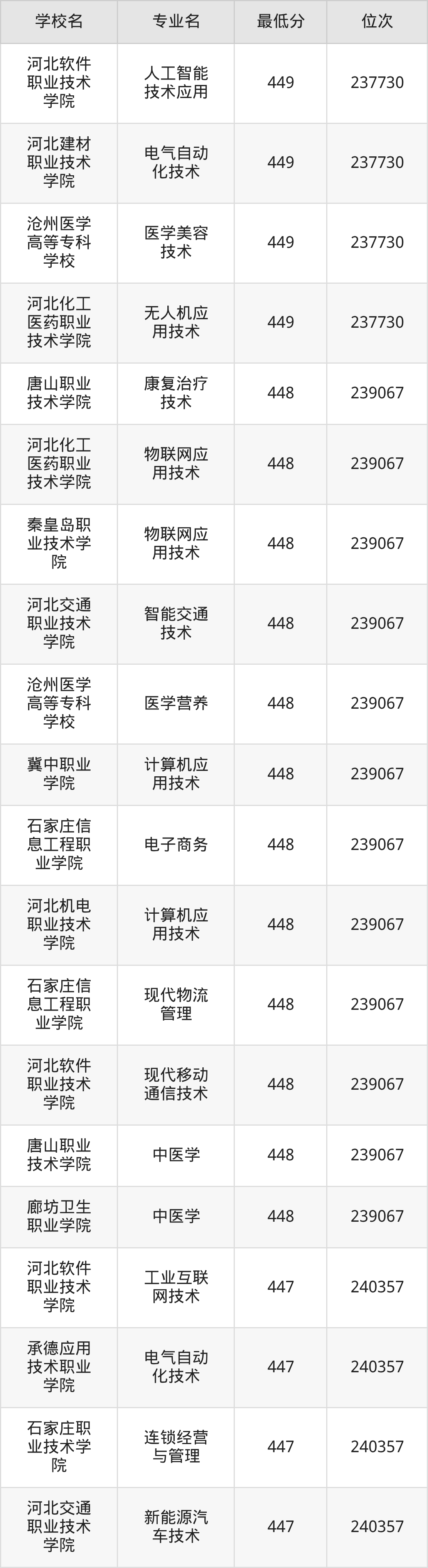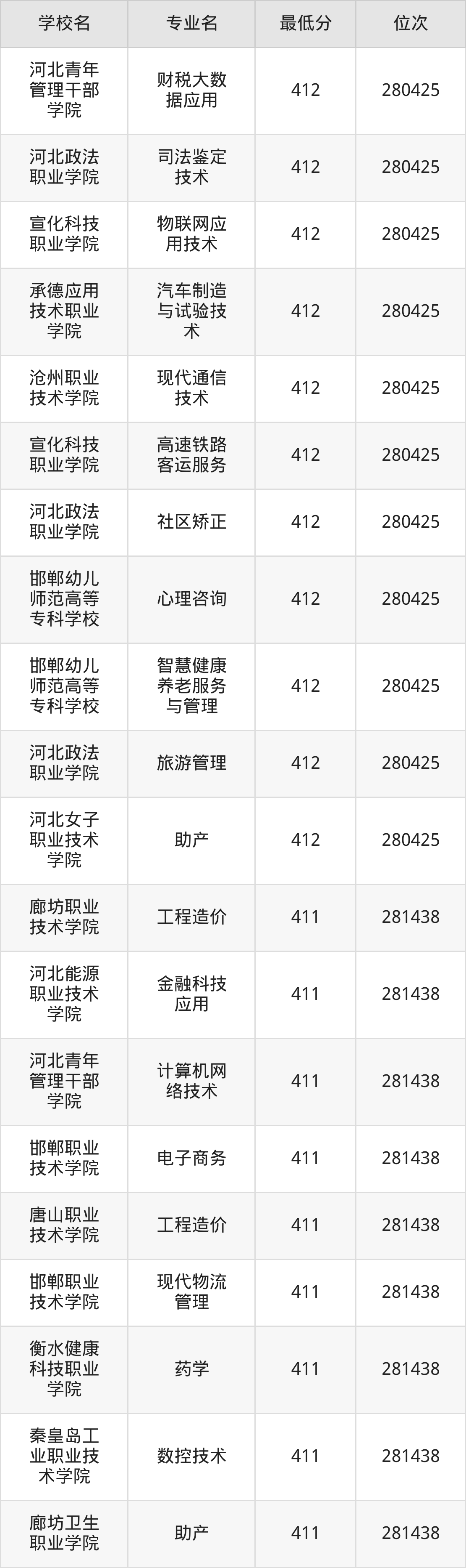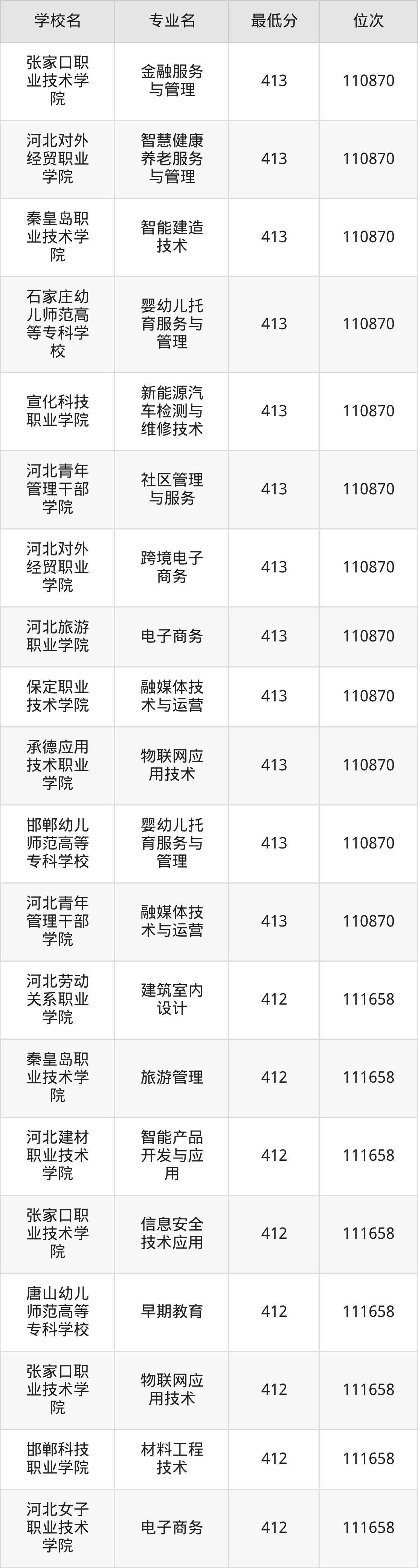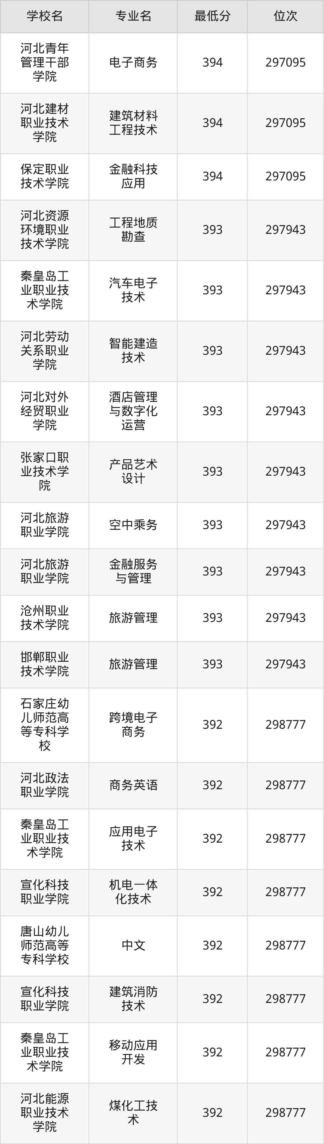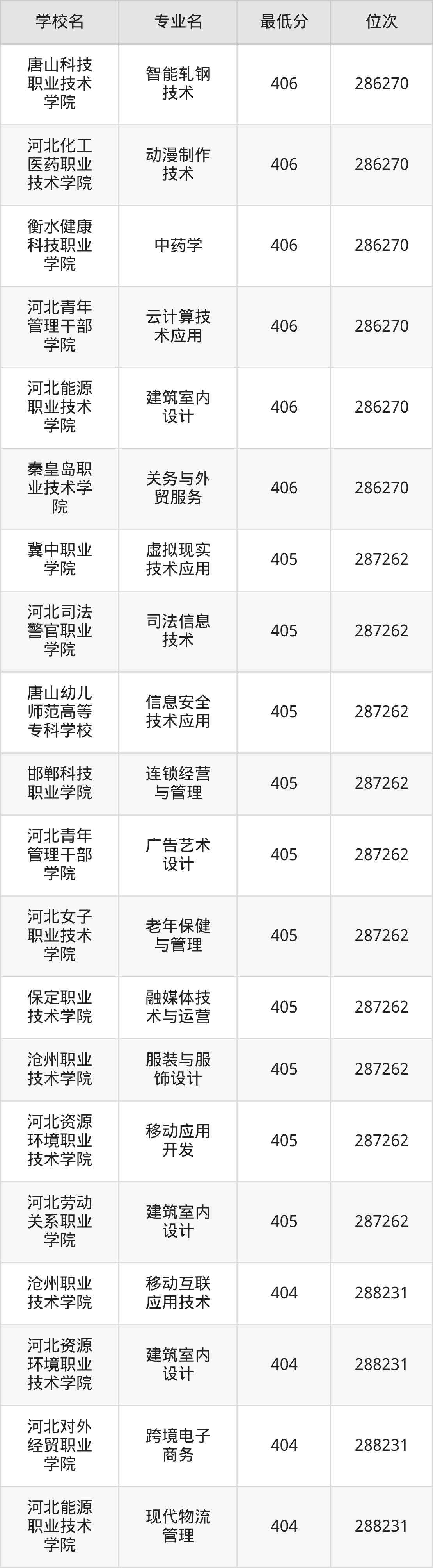 (3)河北建材职业技术学院:2025年公办大专分数线383分到451分,位次区间是305728名到235189名,招生专业有17个,最低为工程造价、最高为机电一体化技术。