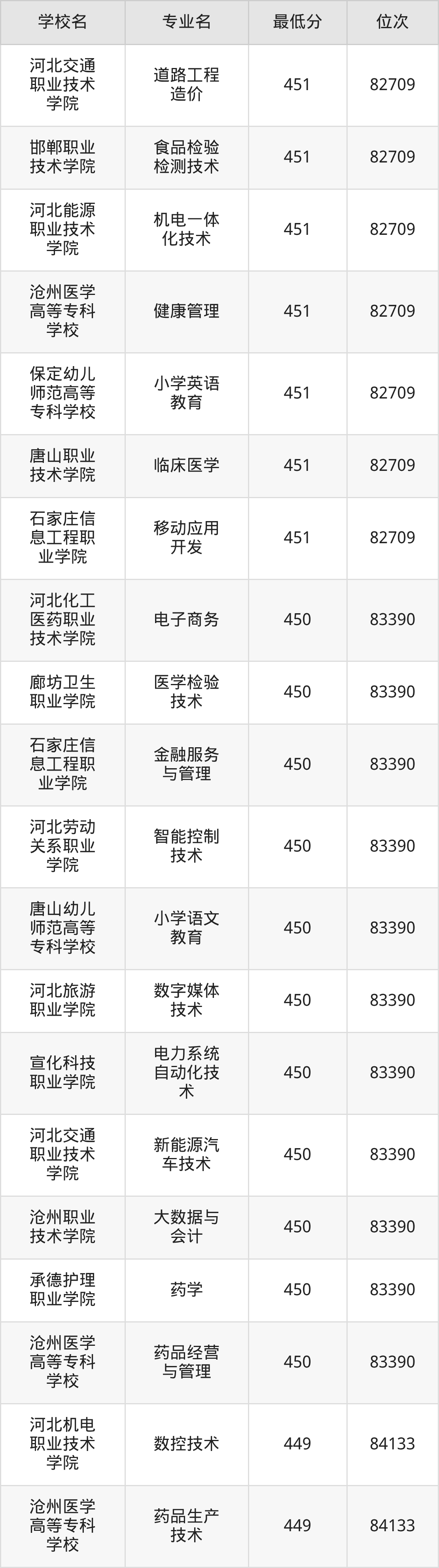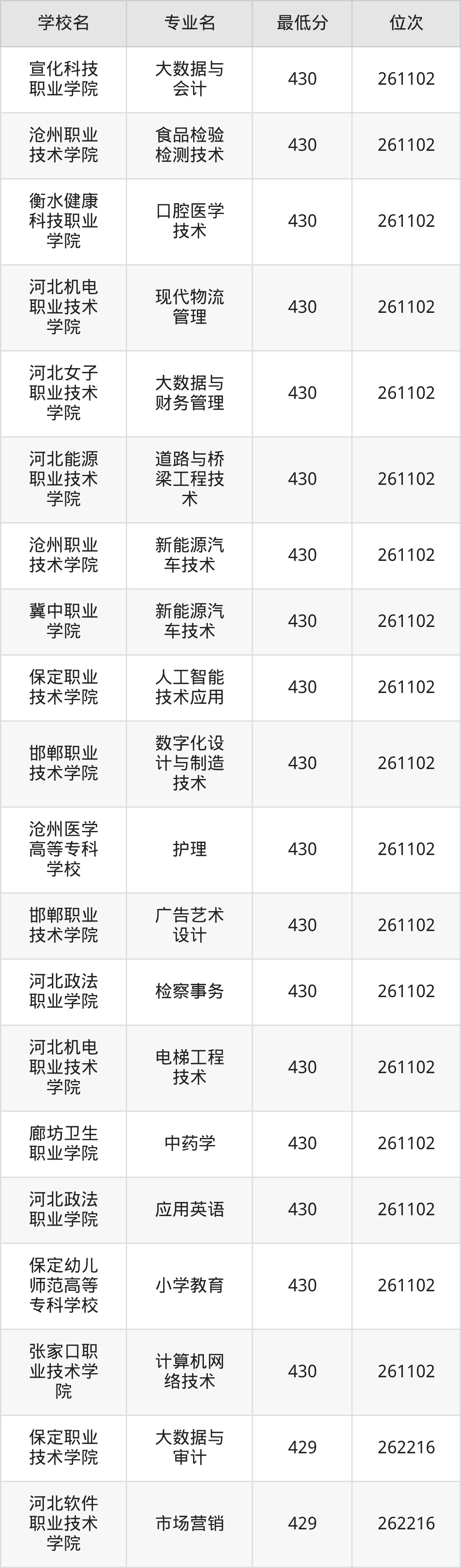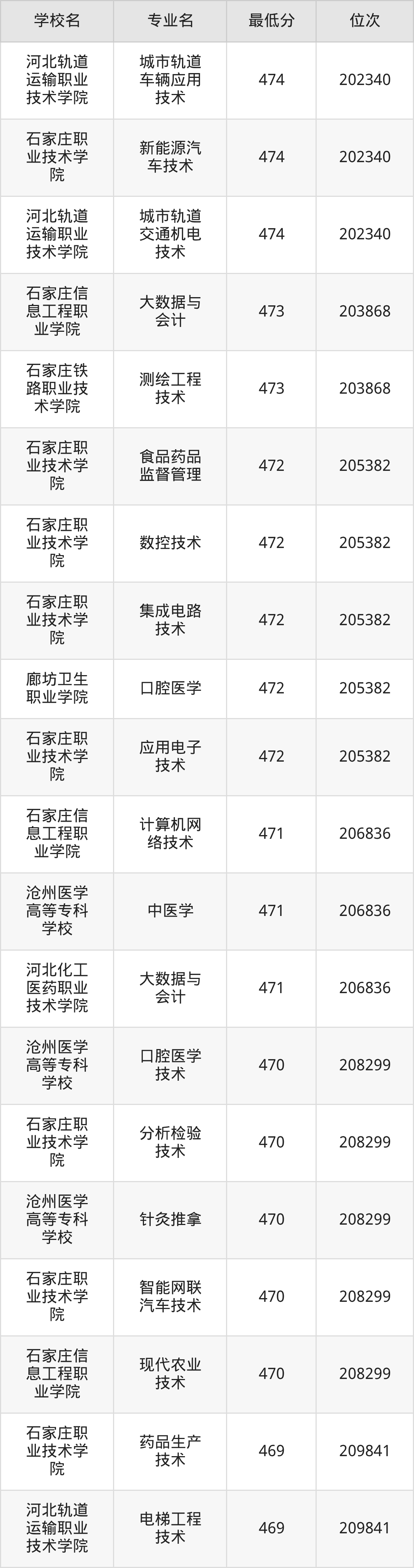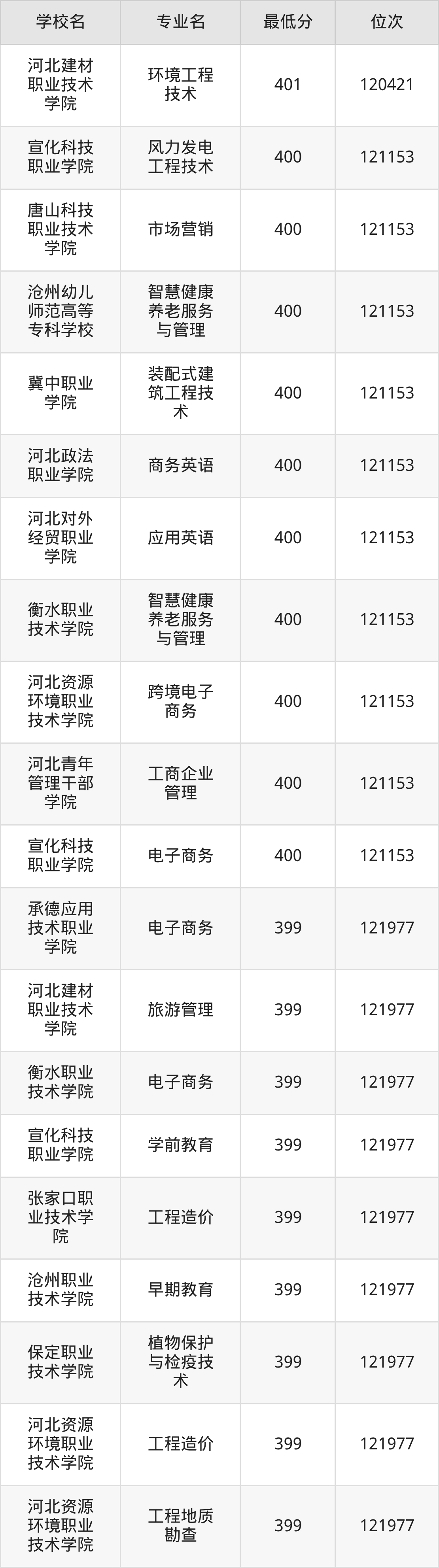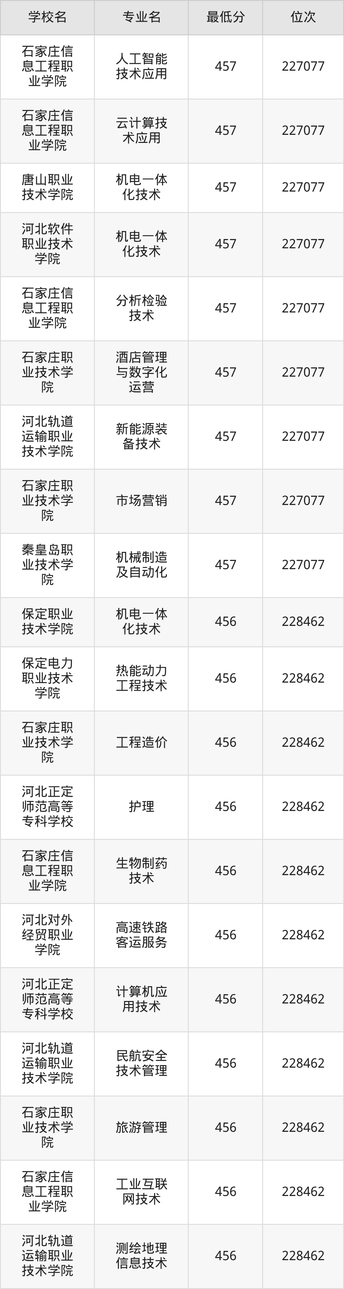(3)河北建材职业技术学院:2025年公办大专分数线383分到451分,位次区间是305728名到235189名,招生专业有17个,最低为工程造价、最高为机电一体化技术。