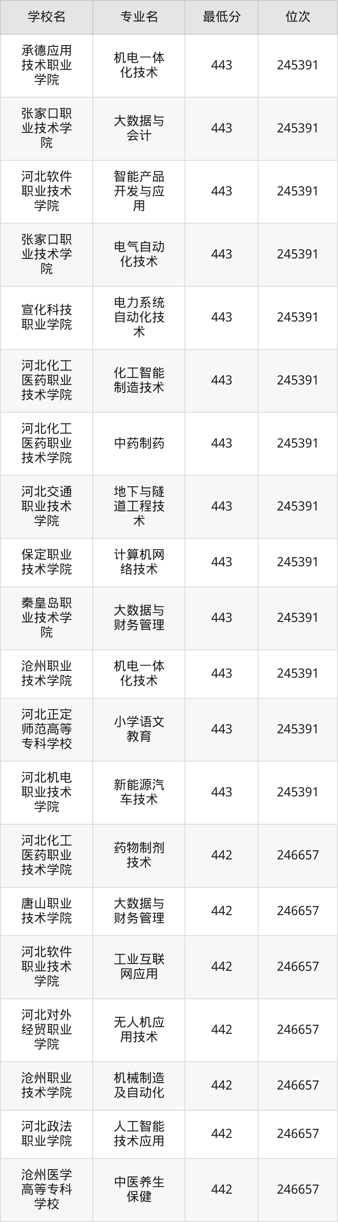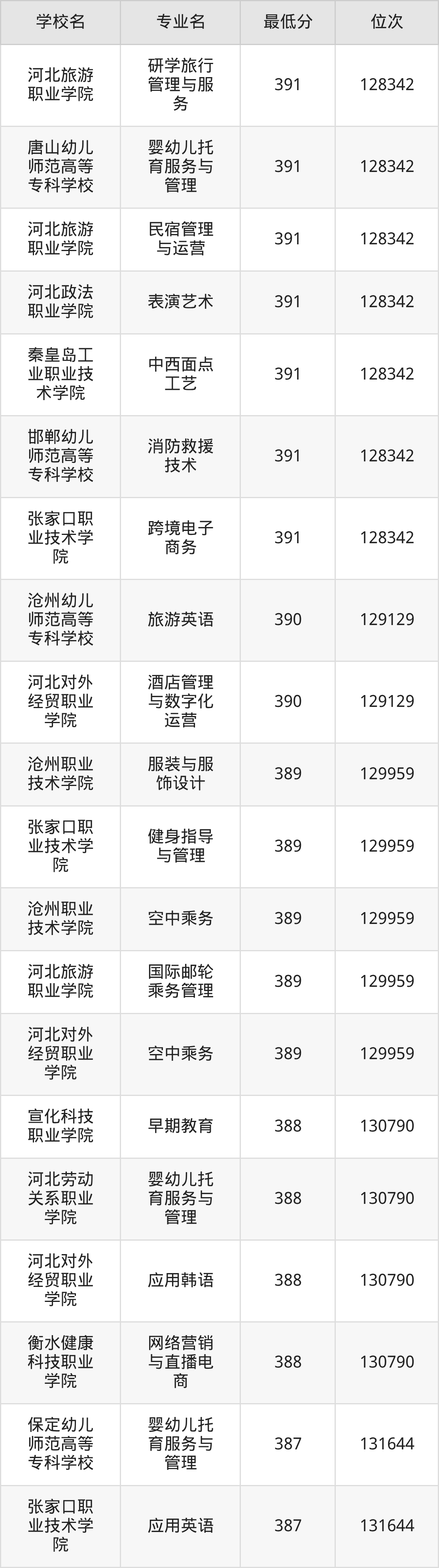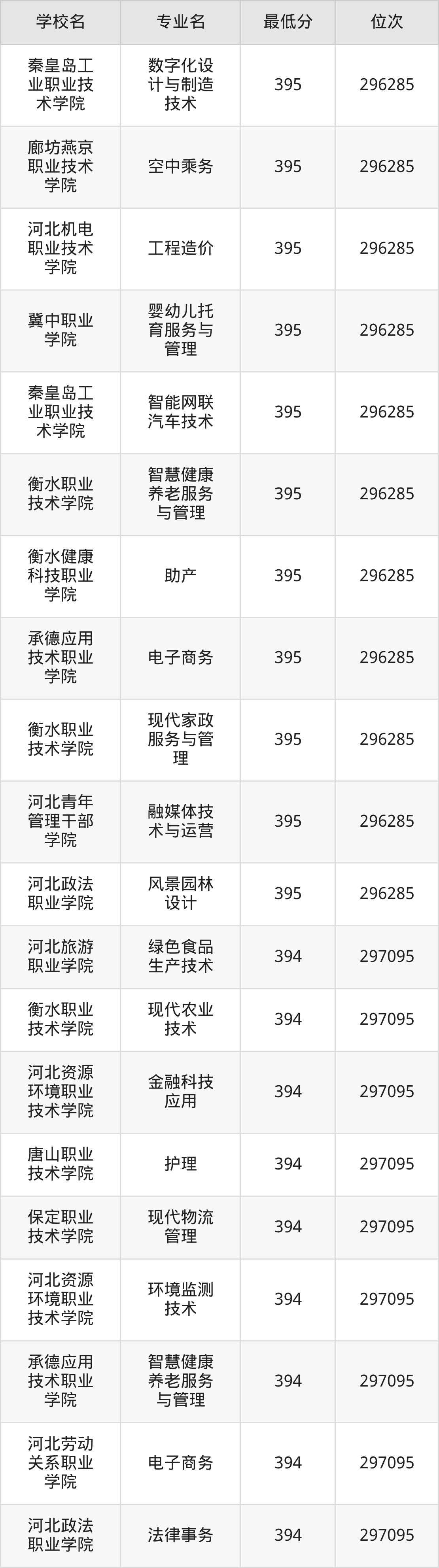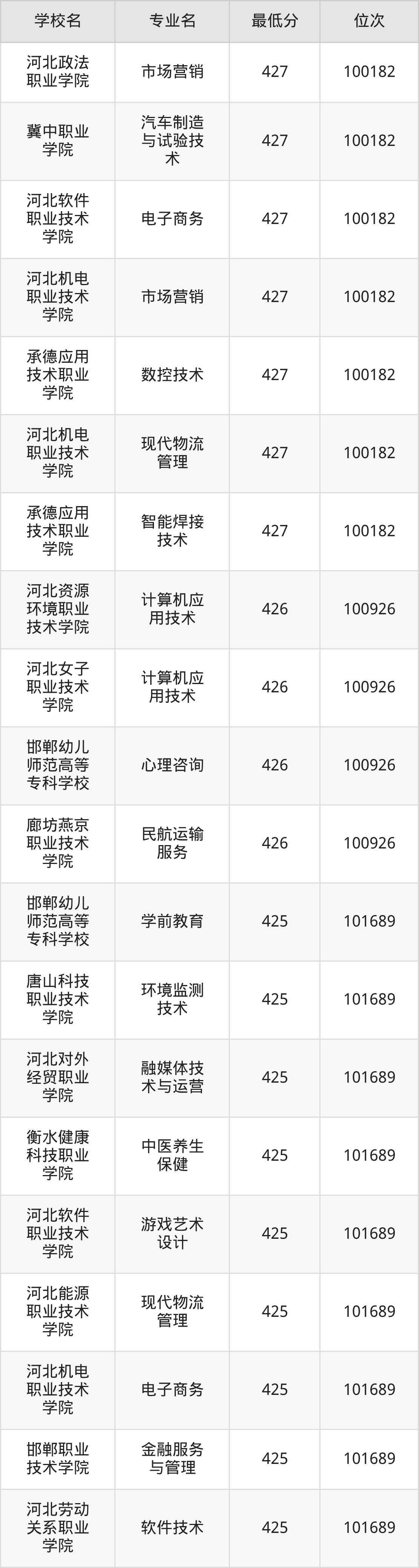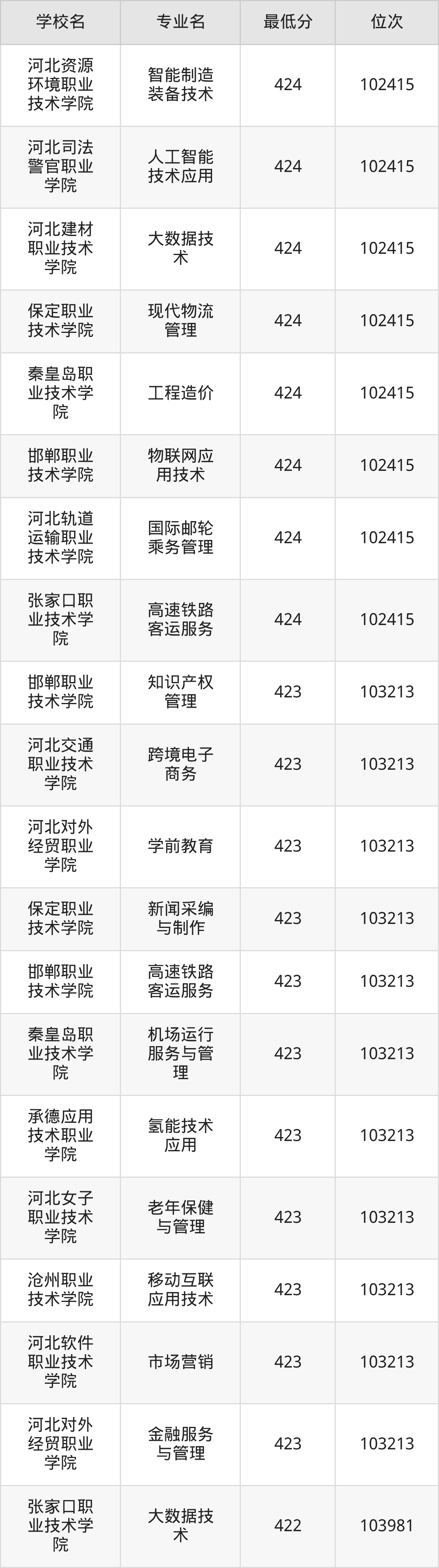 (3)河北建材职业技术学院:2025年公办大专分数线383分到451分,位次区间是305728名到235189名,招生专业有17个,最低为工程造价、最高为机电一体化技术。