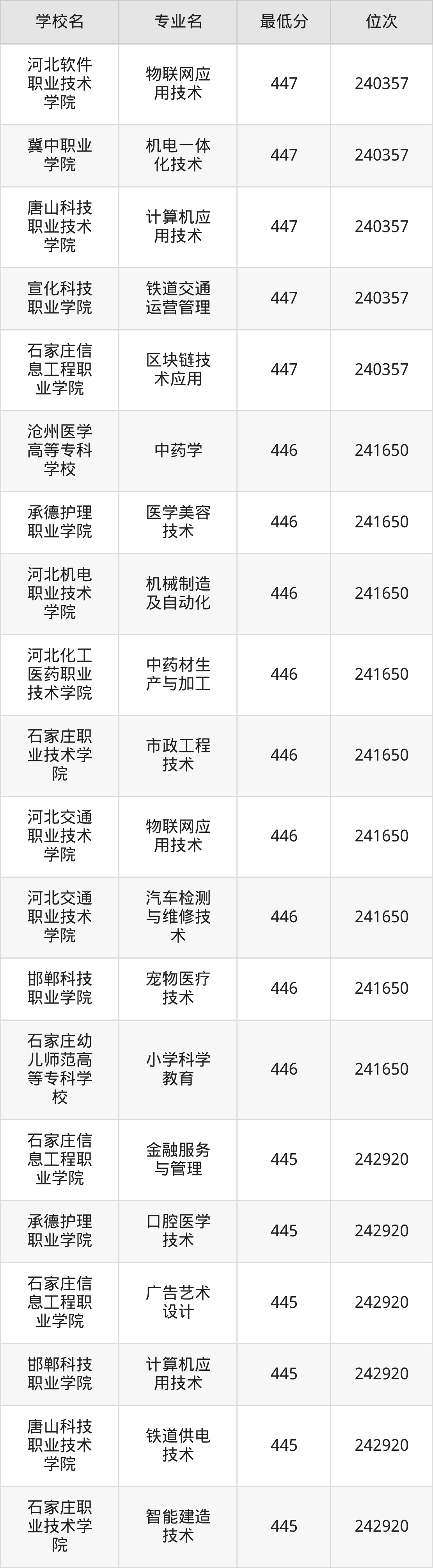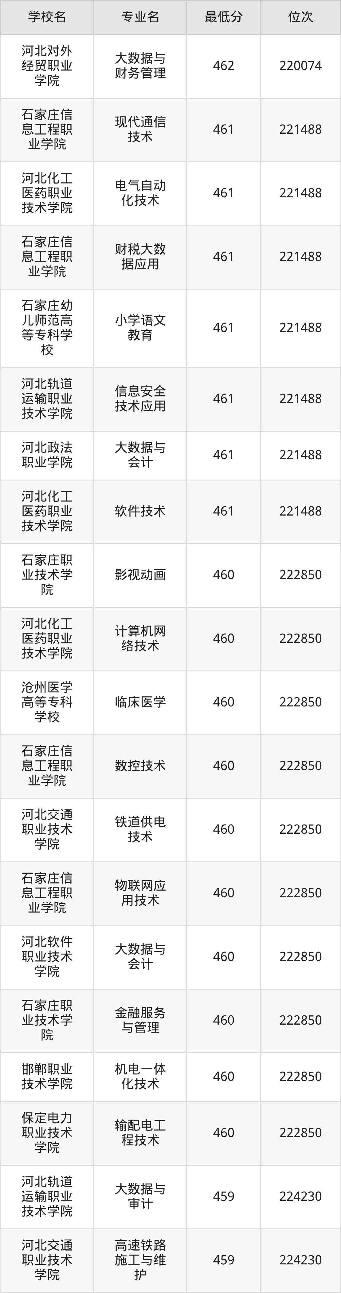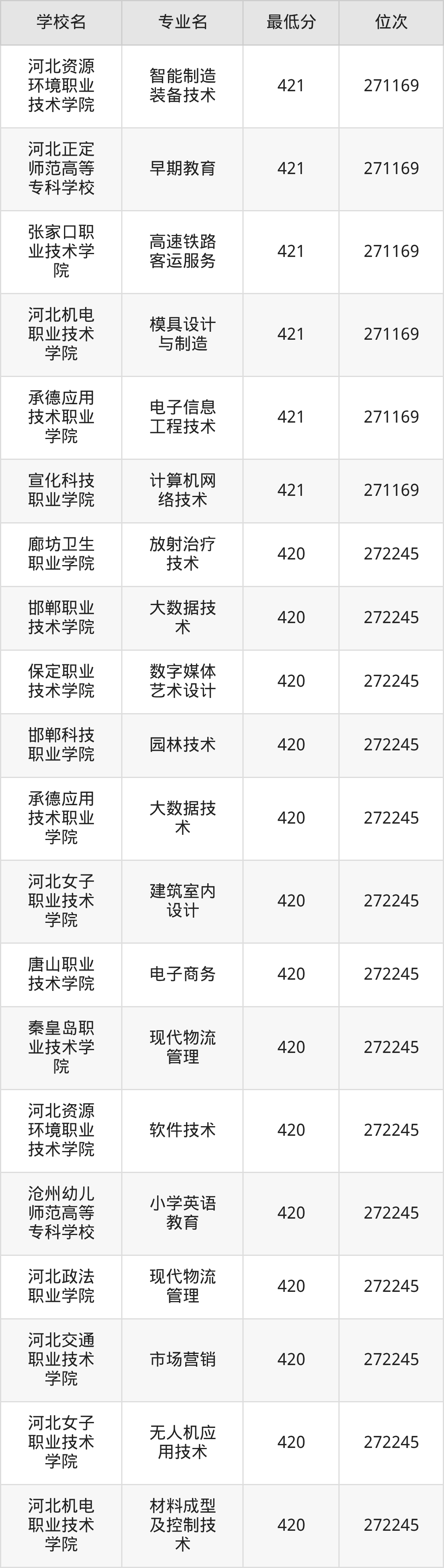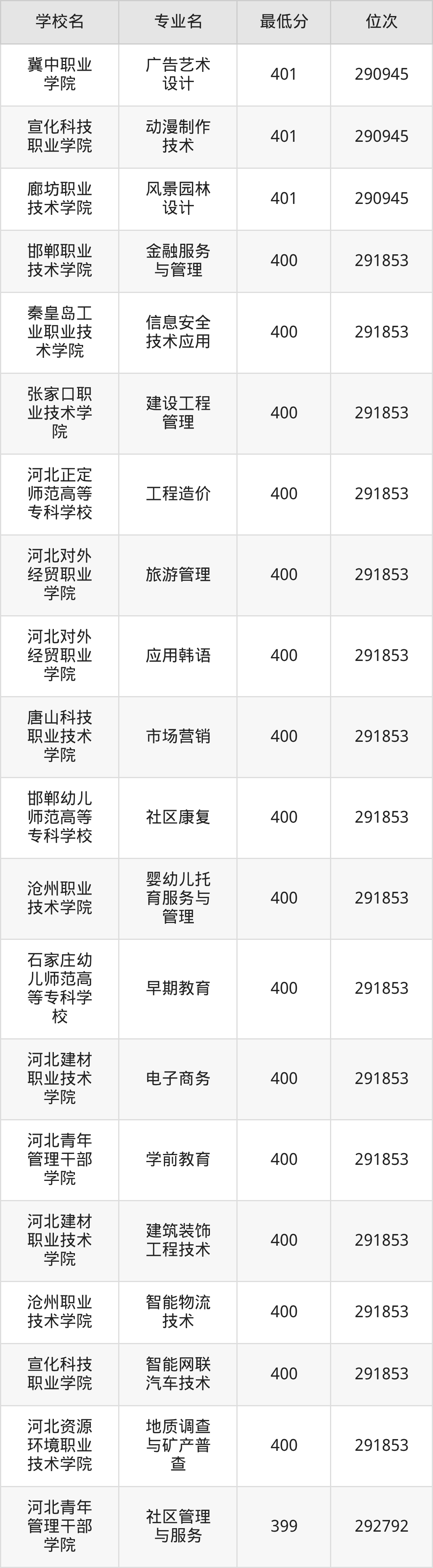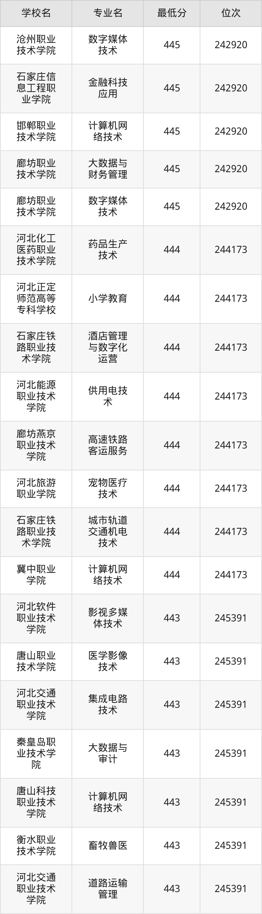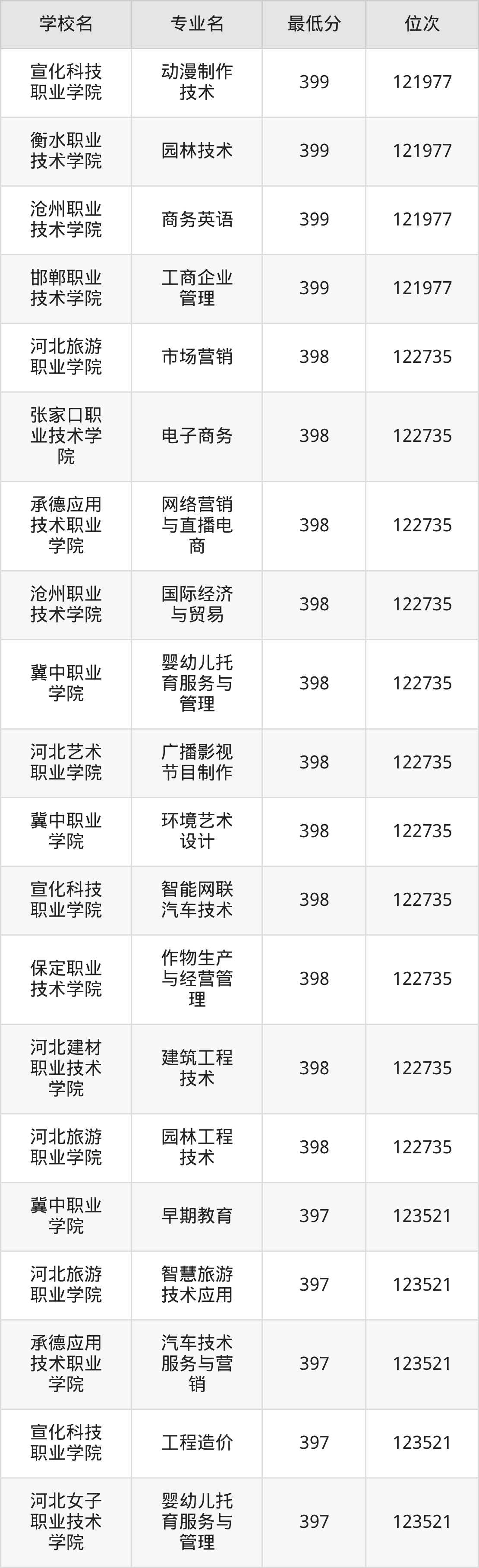 (3)河北建材职业技术学院:2025年公办大专分数线383分到451分,位次区间是305728名到235189名,招生专业有17个,最低为工程造价、最高为机电一体化技术。