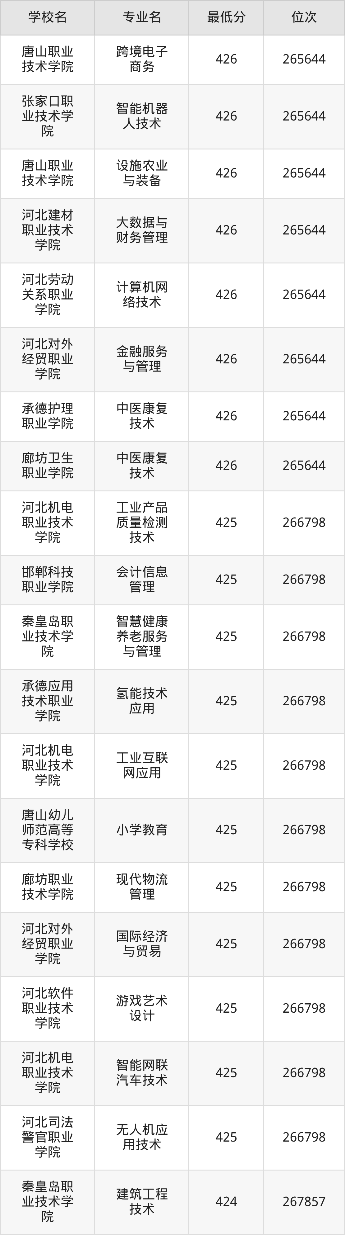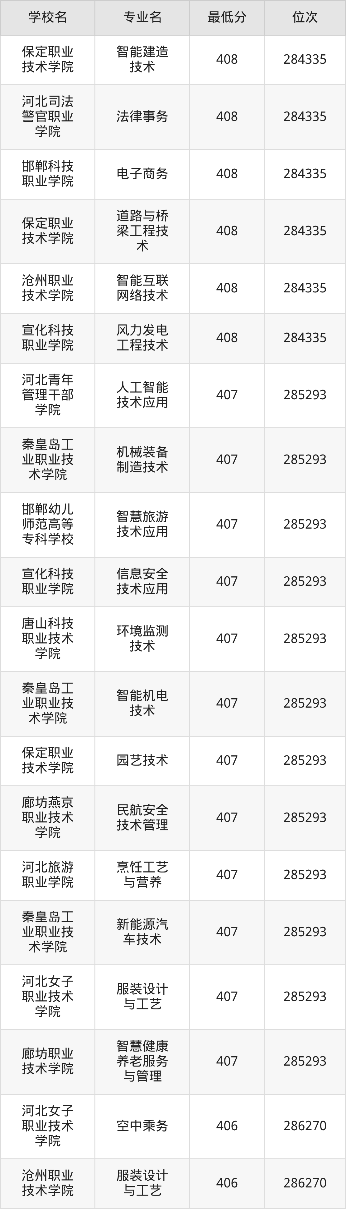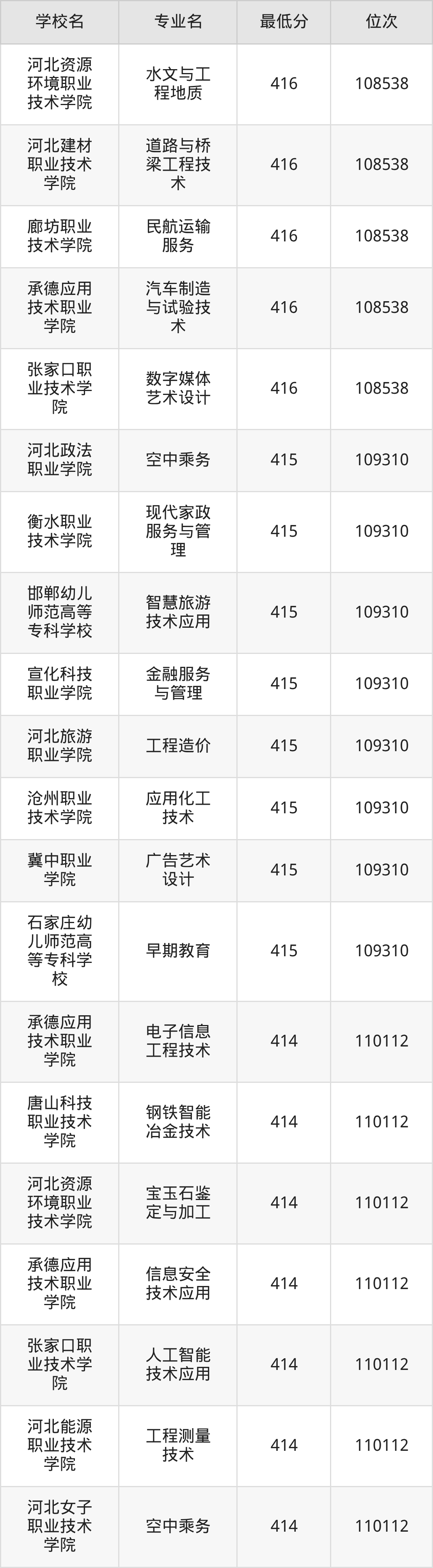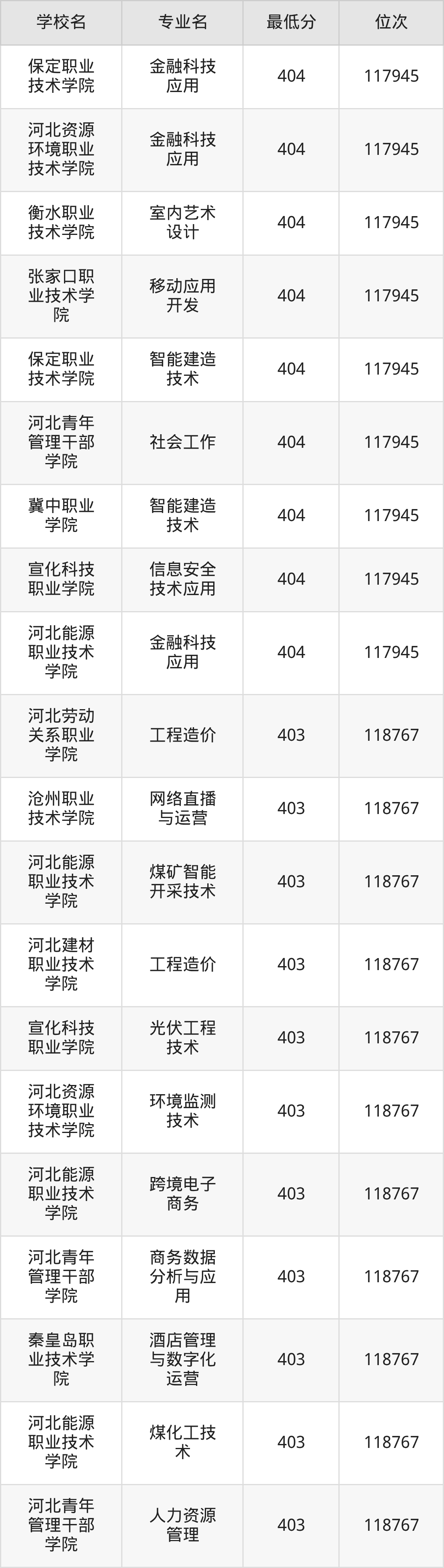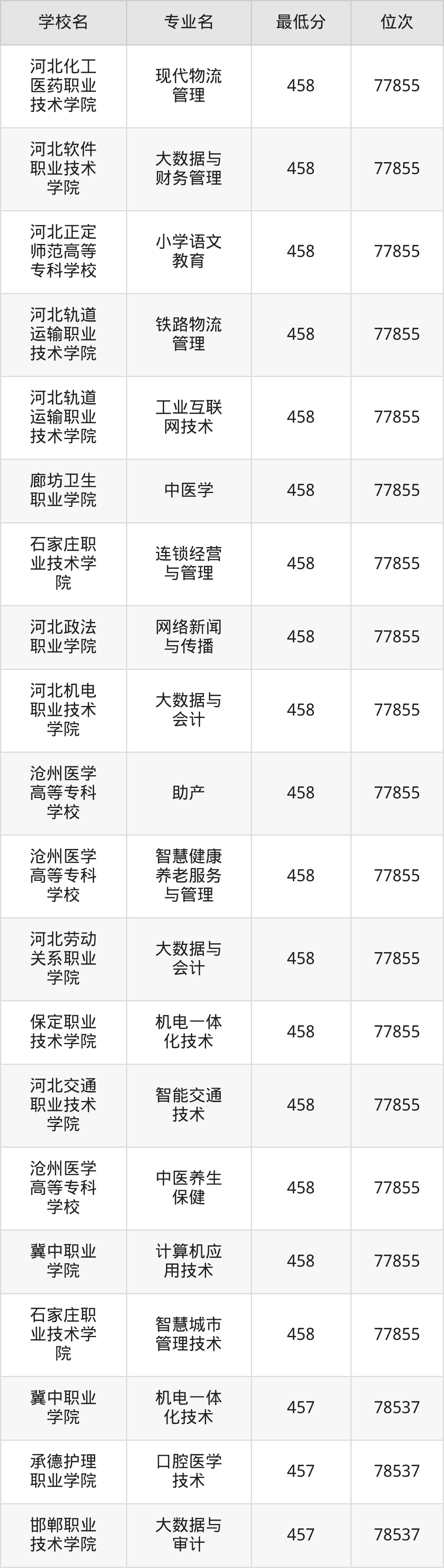 (3)河北建材职业技术学院:2025年公办大专分数线383分到451分,位次区间是305728名到235189名,招生专业有17个,最低为工程造价、最高为机电一体化技术。