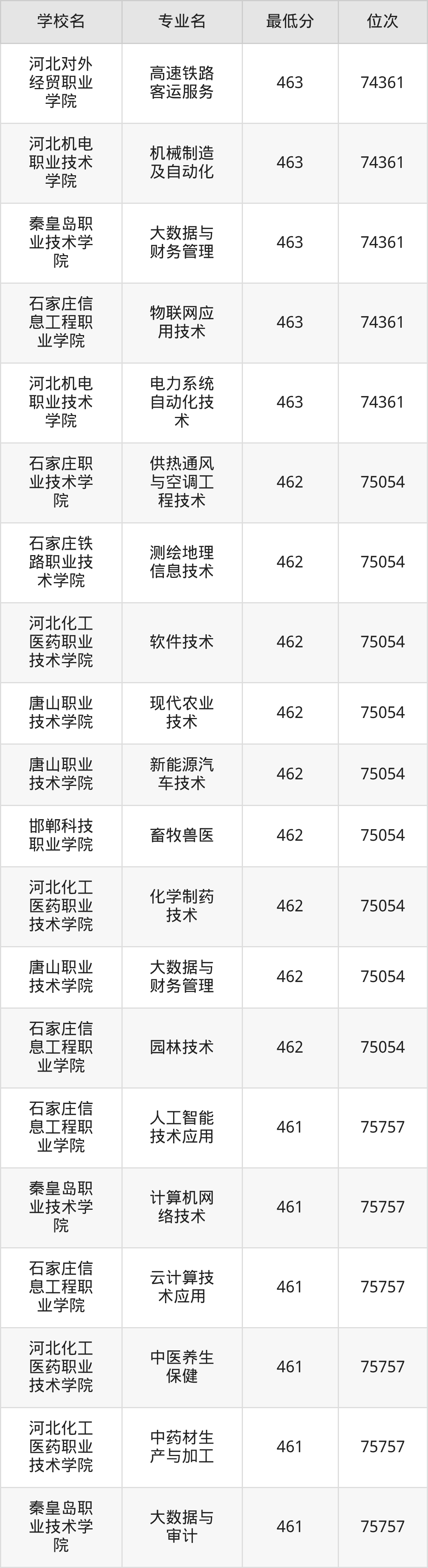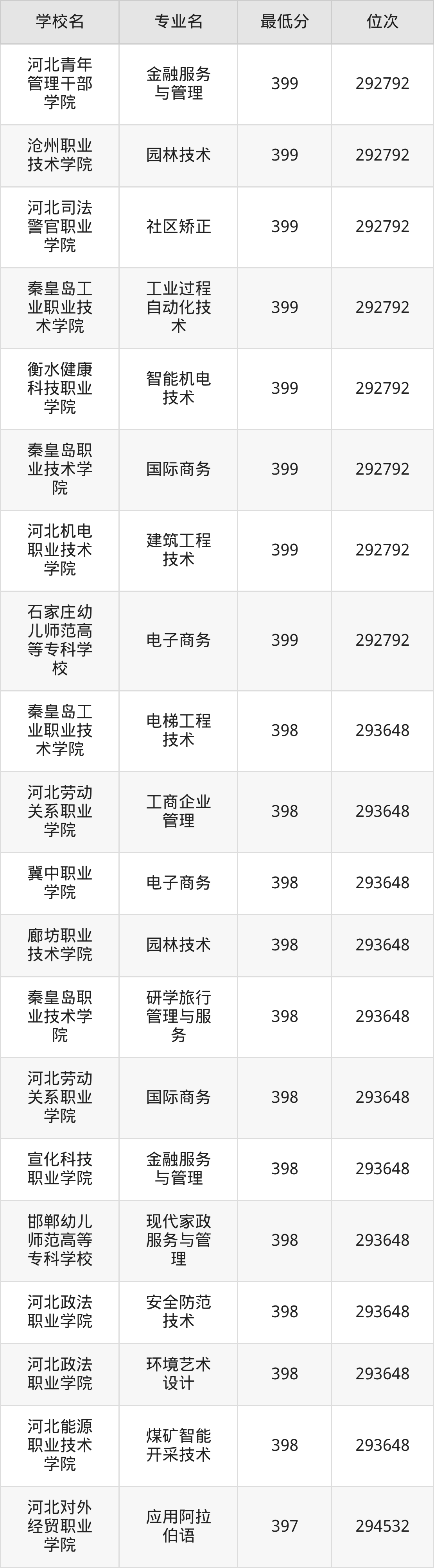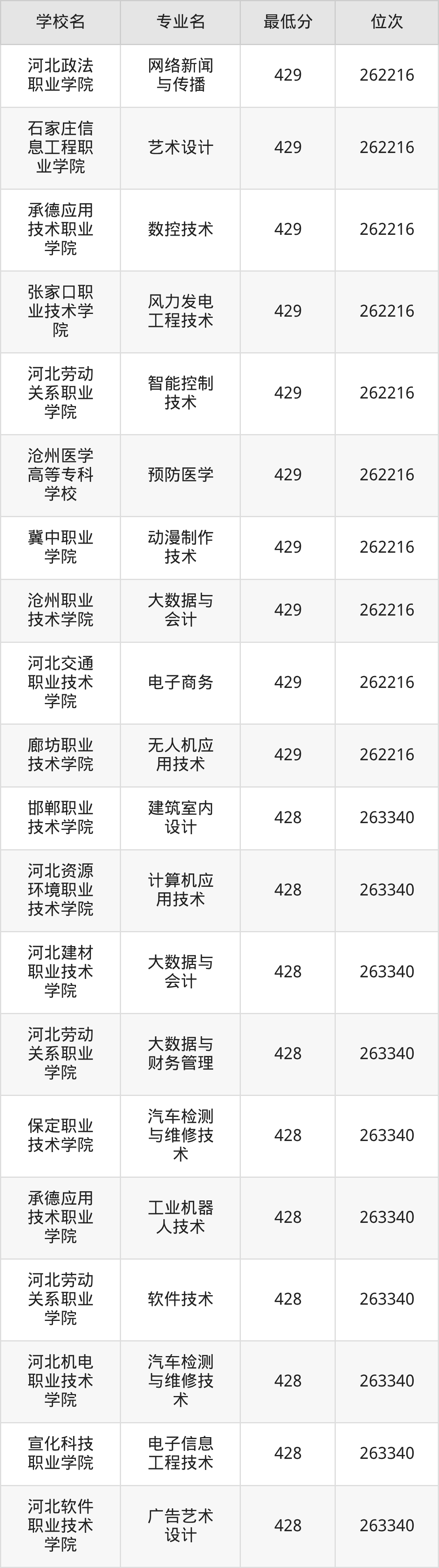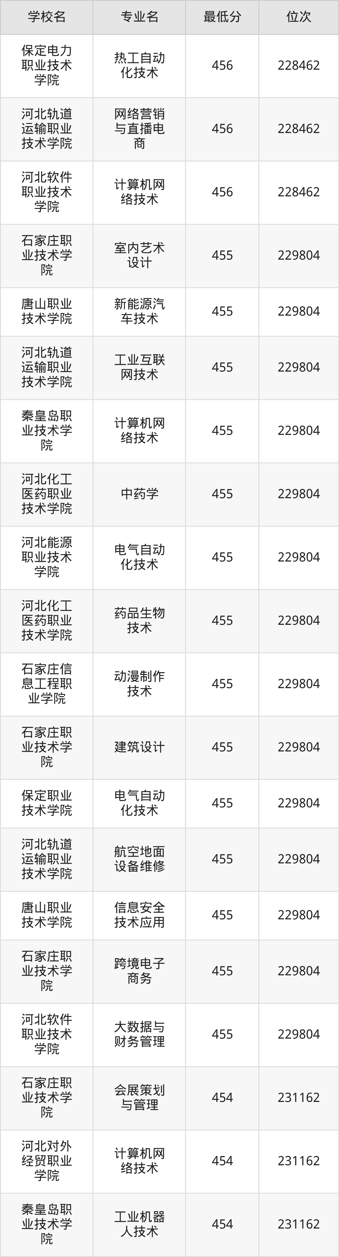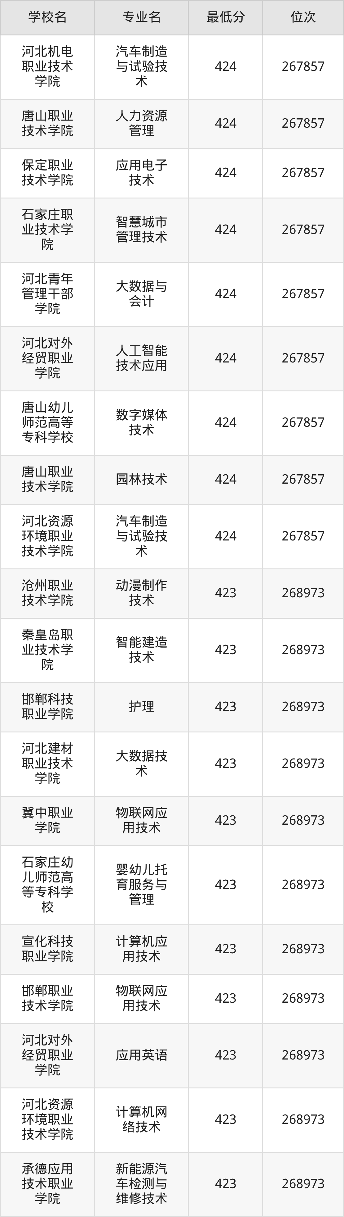 (3)河北建材职业技术学院:2025年公办大专分数线383分到451分,位次区间是305728名到235189名,招生专业有17个,最低为工程造价、最高为机电一体化技术。