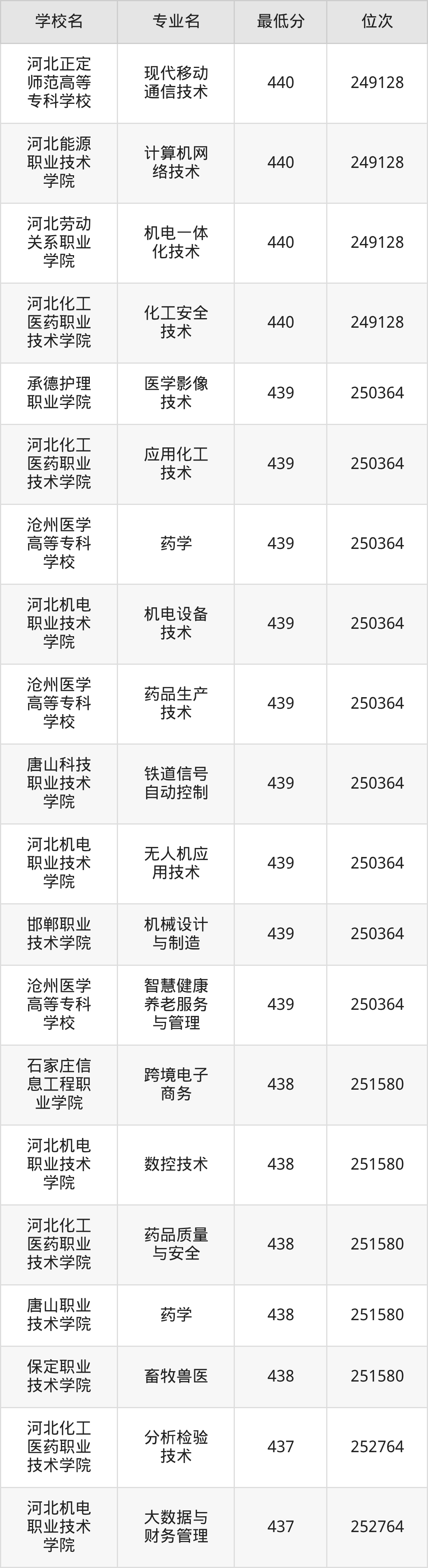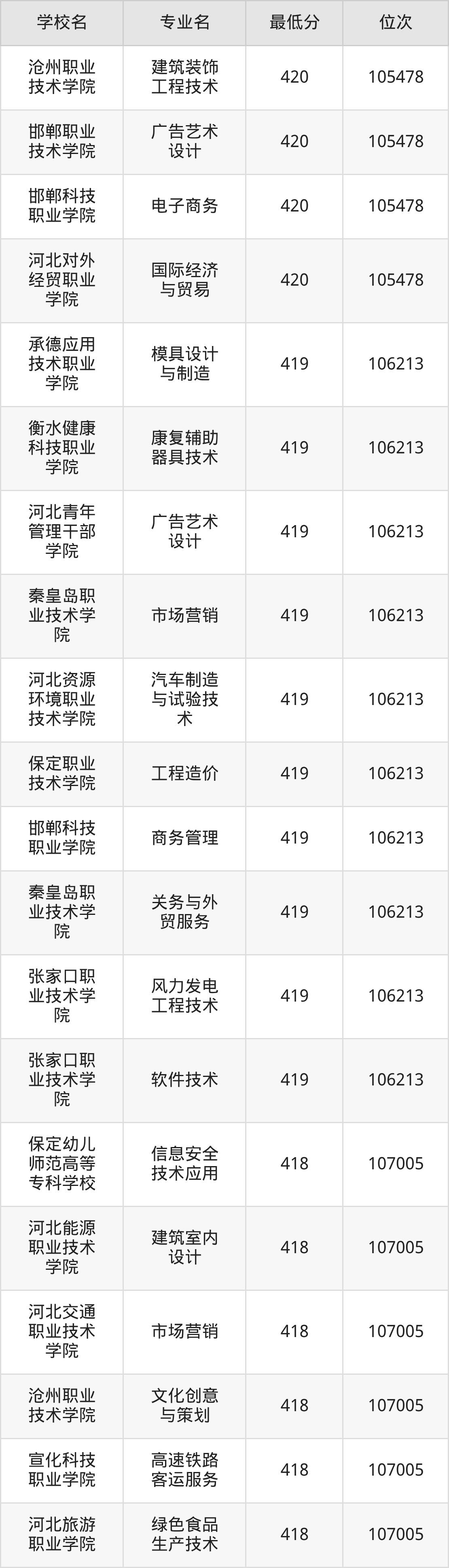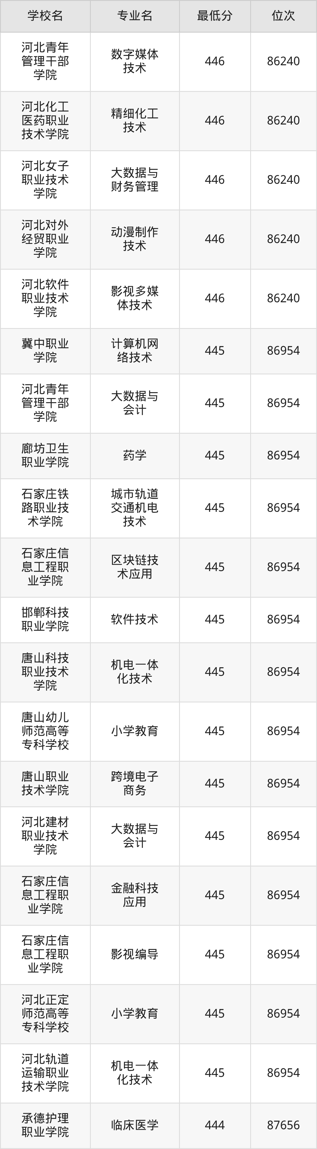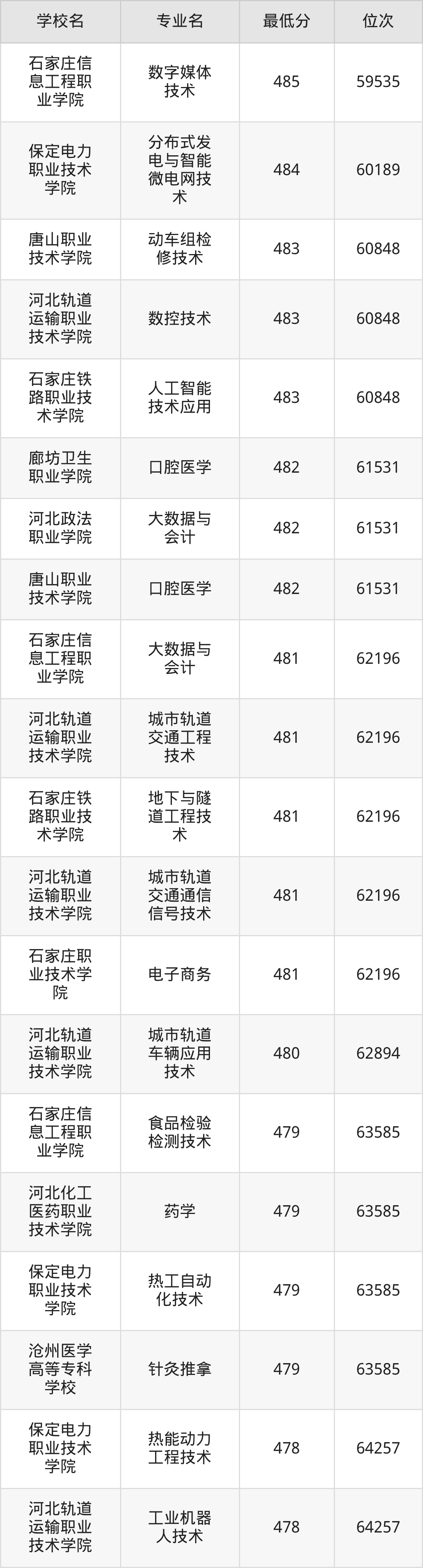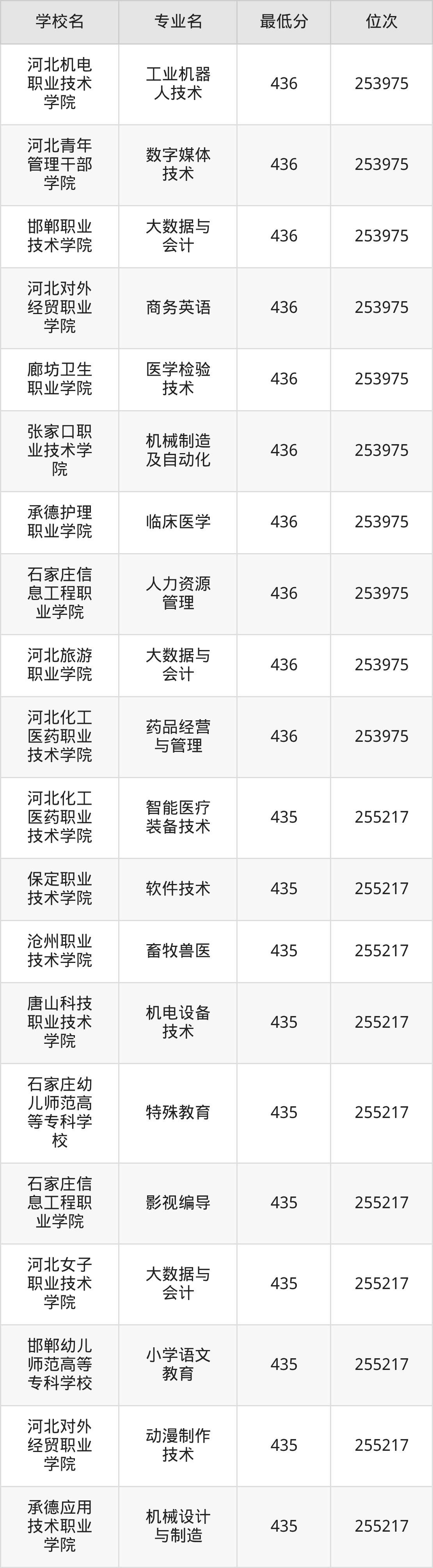 (3)河北建材职业技术学院:2025年公办大专分数线383分到451分,位次区间是305728名到235189名,招生专业有17个,最低为工程造价、最高为机电一体化技术。