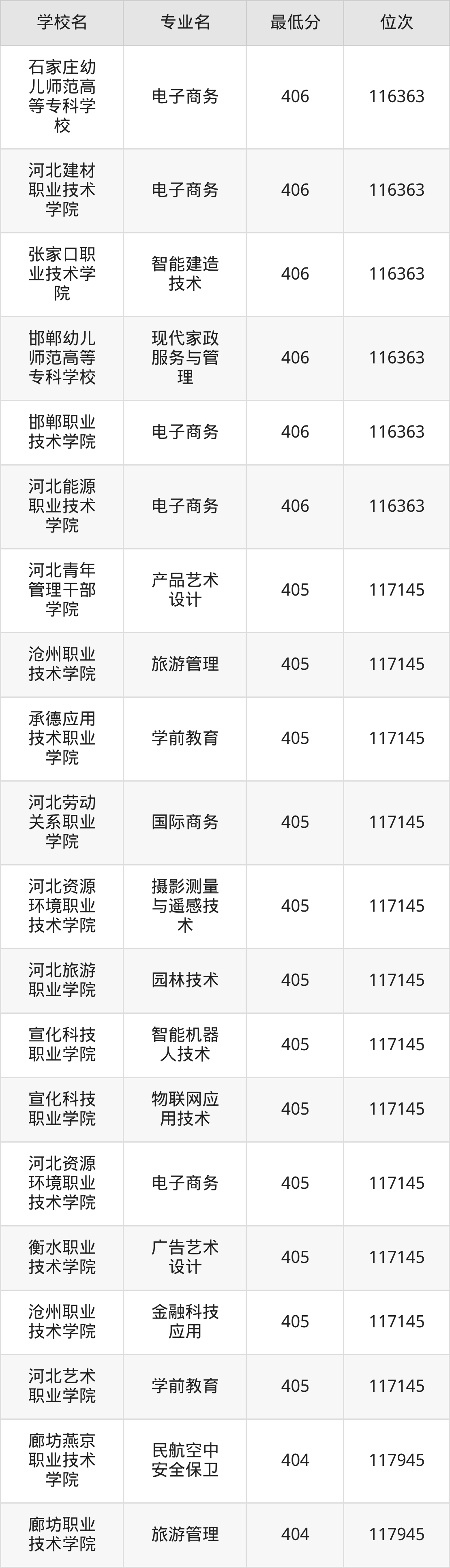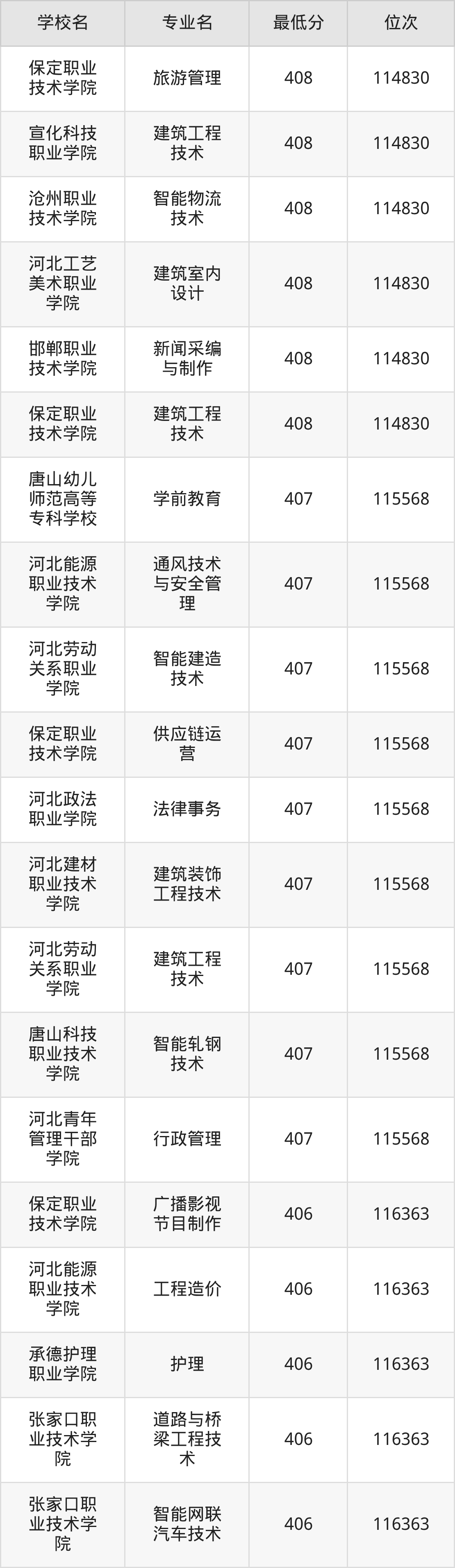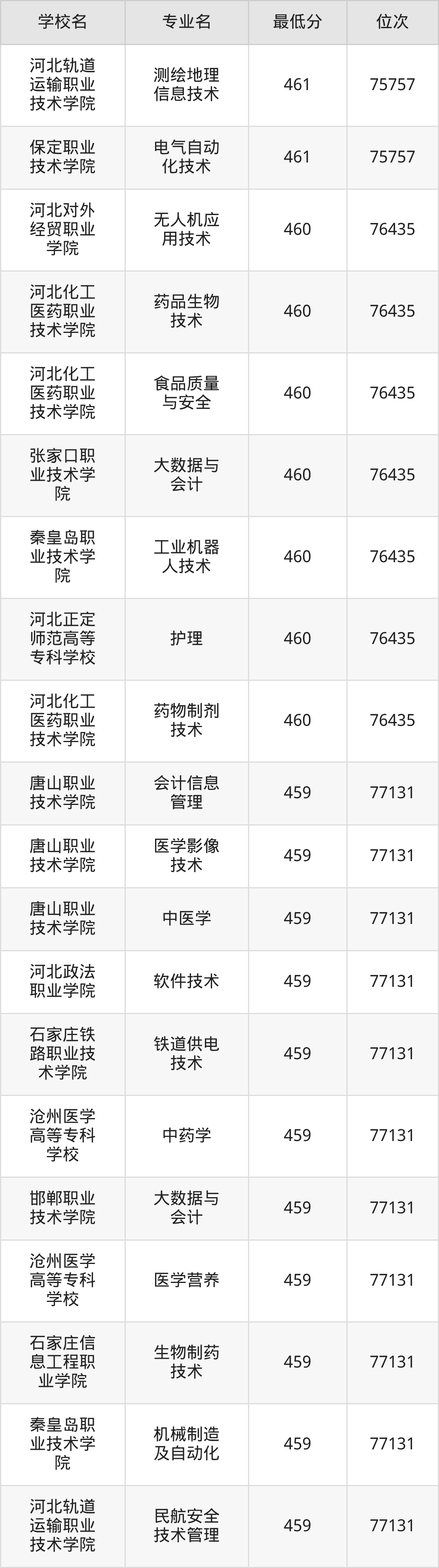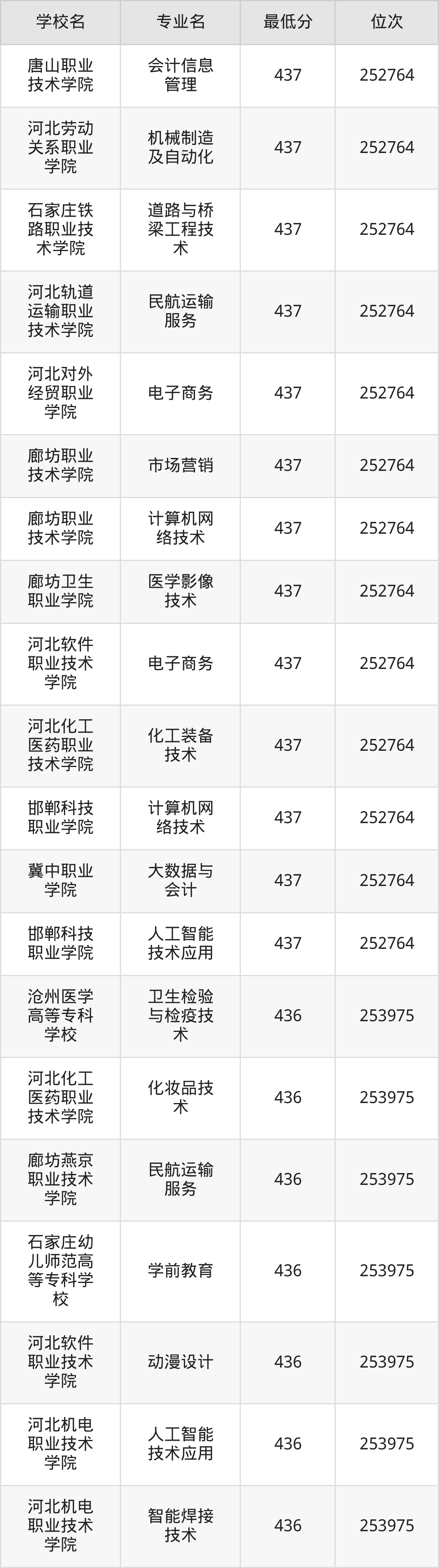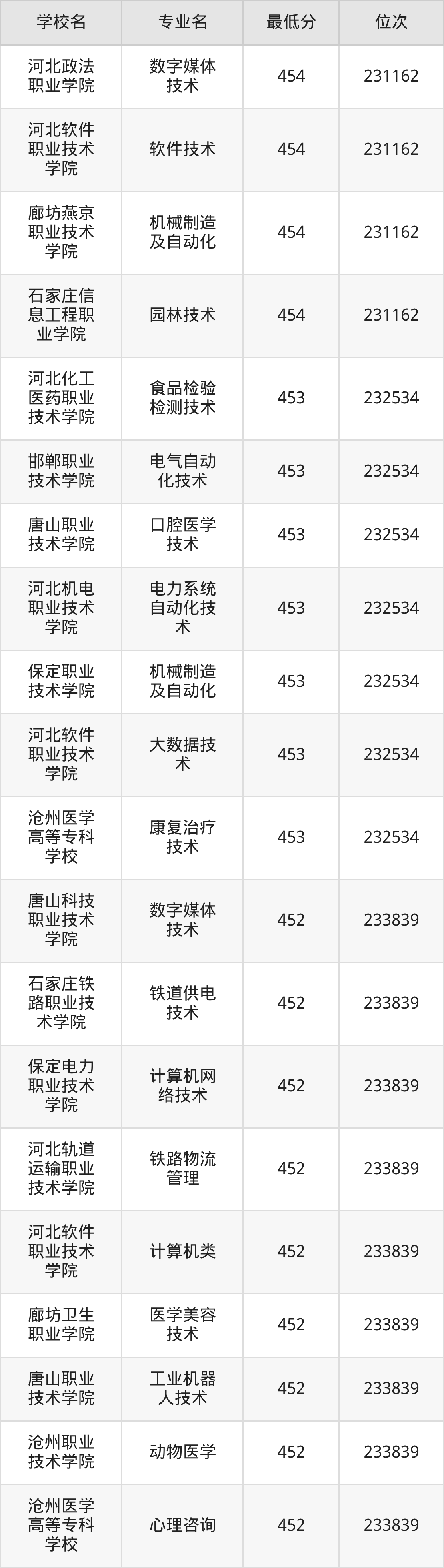 (3)河北建材职业技术学院:2025年公办大专分数线383分到451分,位次区间是305728名到235189名,招生专业有17个,最低为工程造价、最高为机电一体化技术。