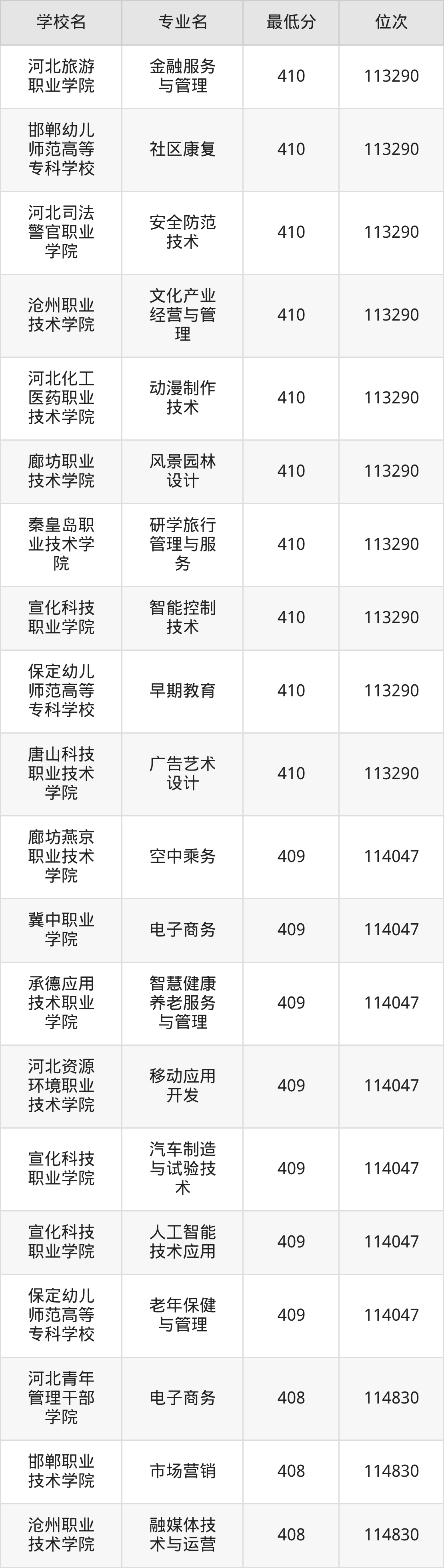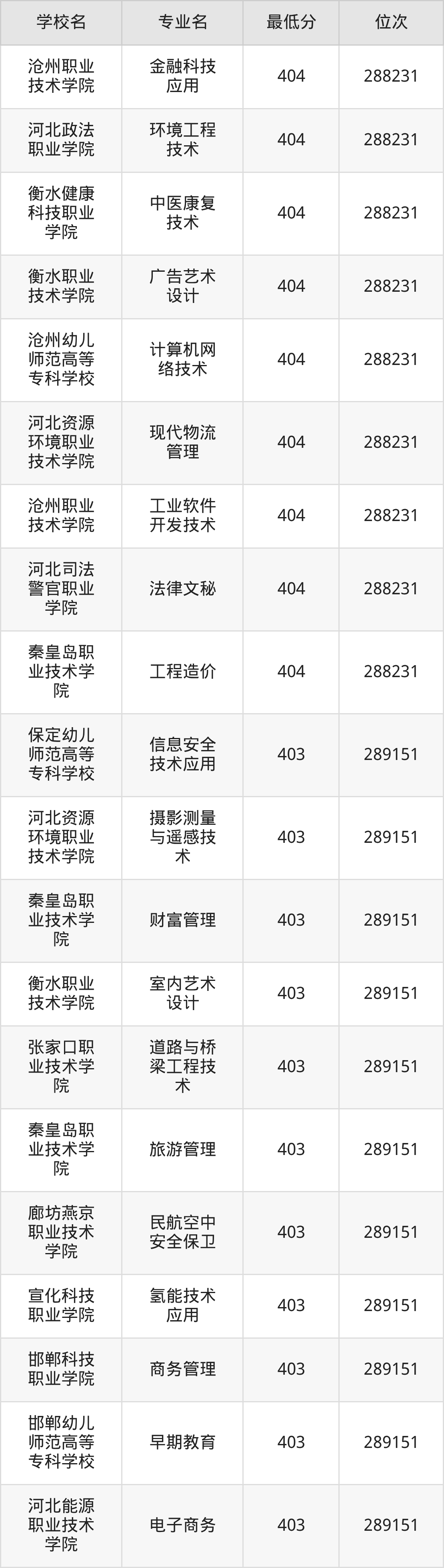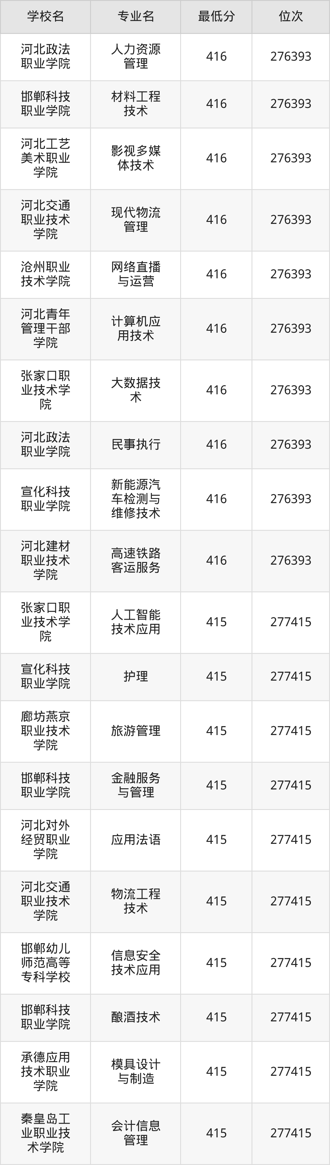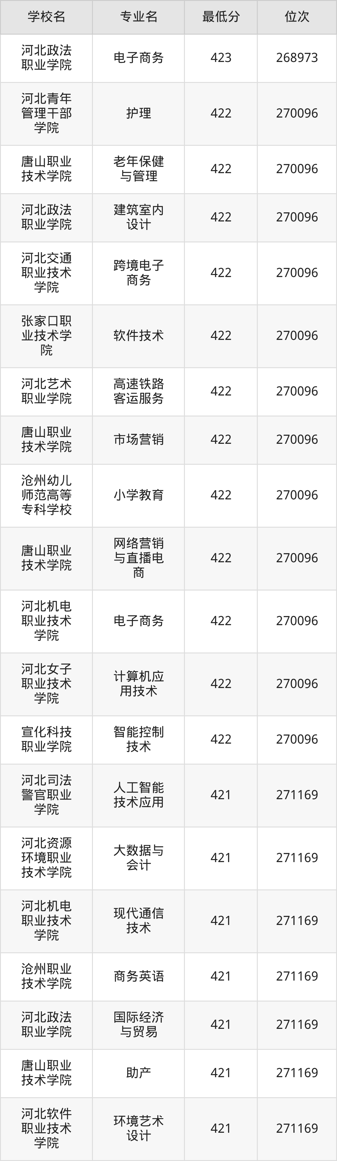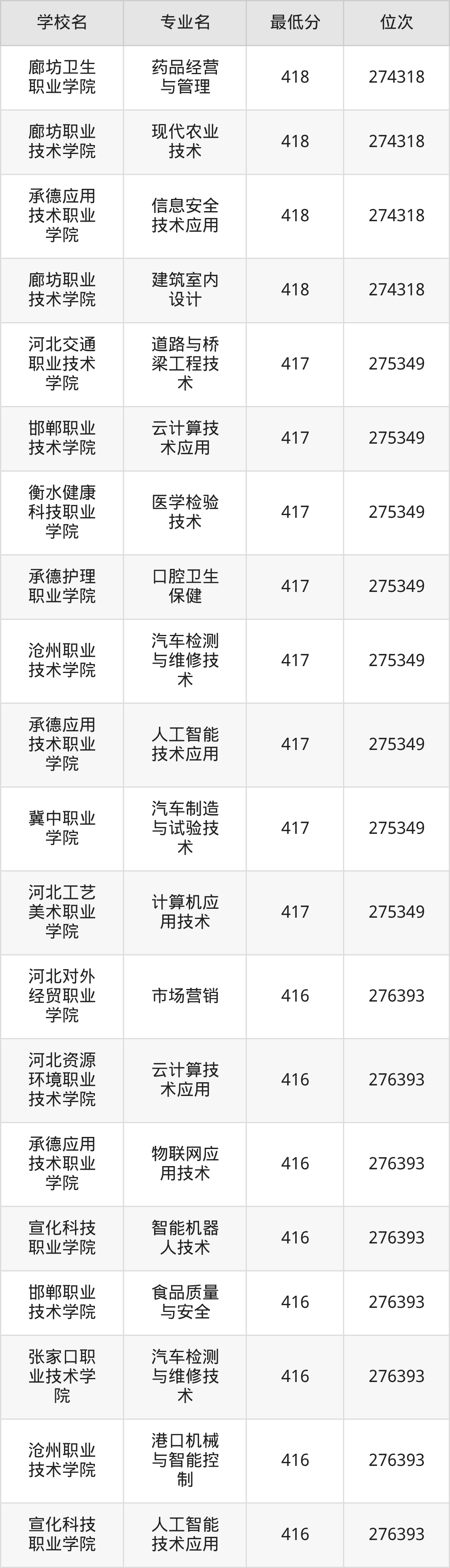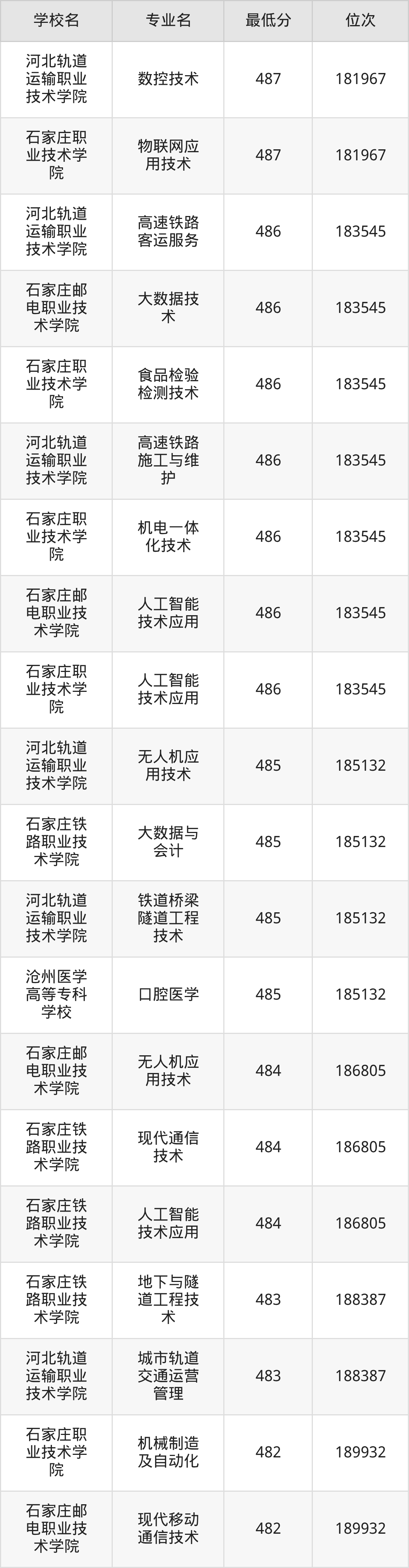(3)河北建材职业技术学院:2025年公办大专分数线383分到451分,位次区间是305728名到235189名,招生专业有17个,最低为工程造价、最高为机电一体化技术。