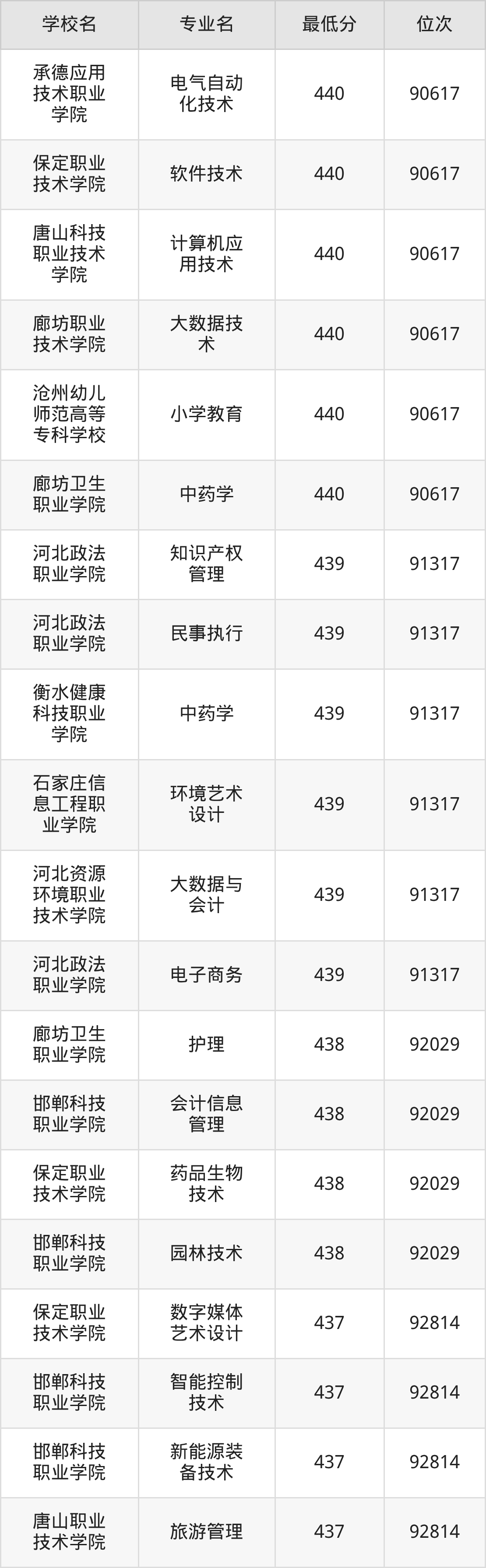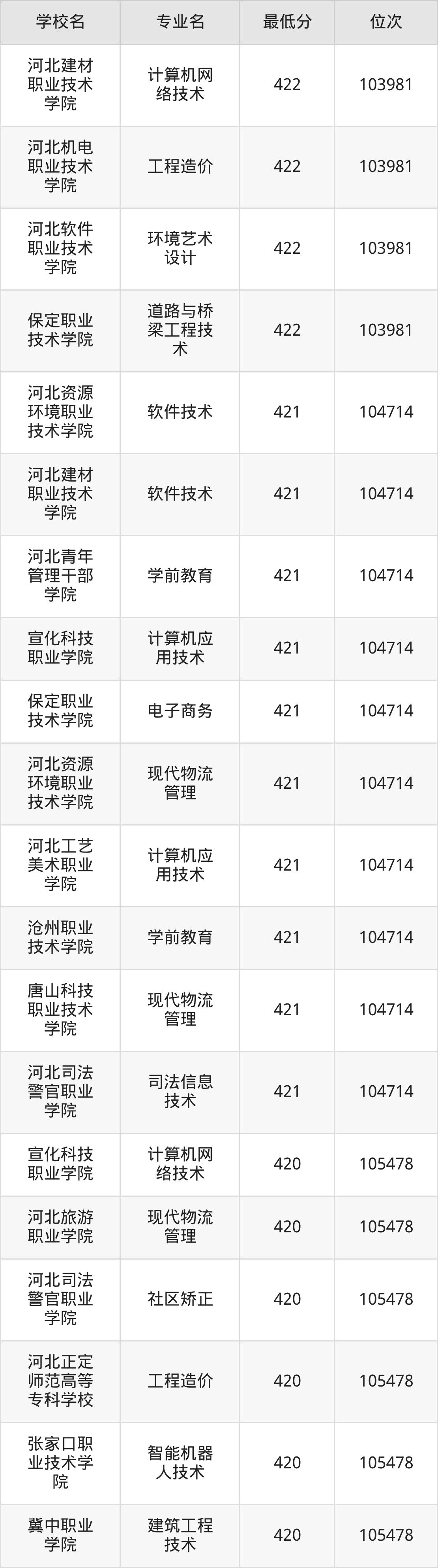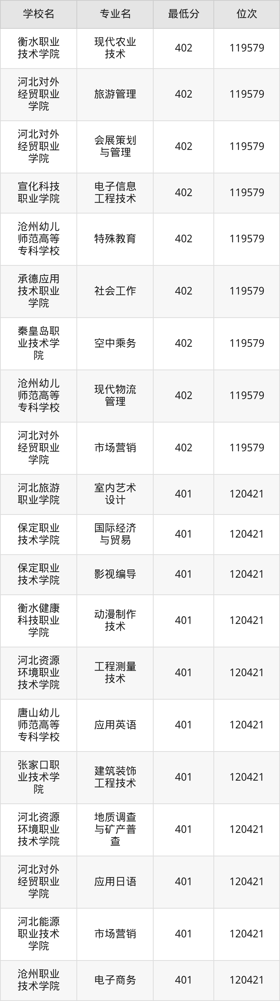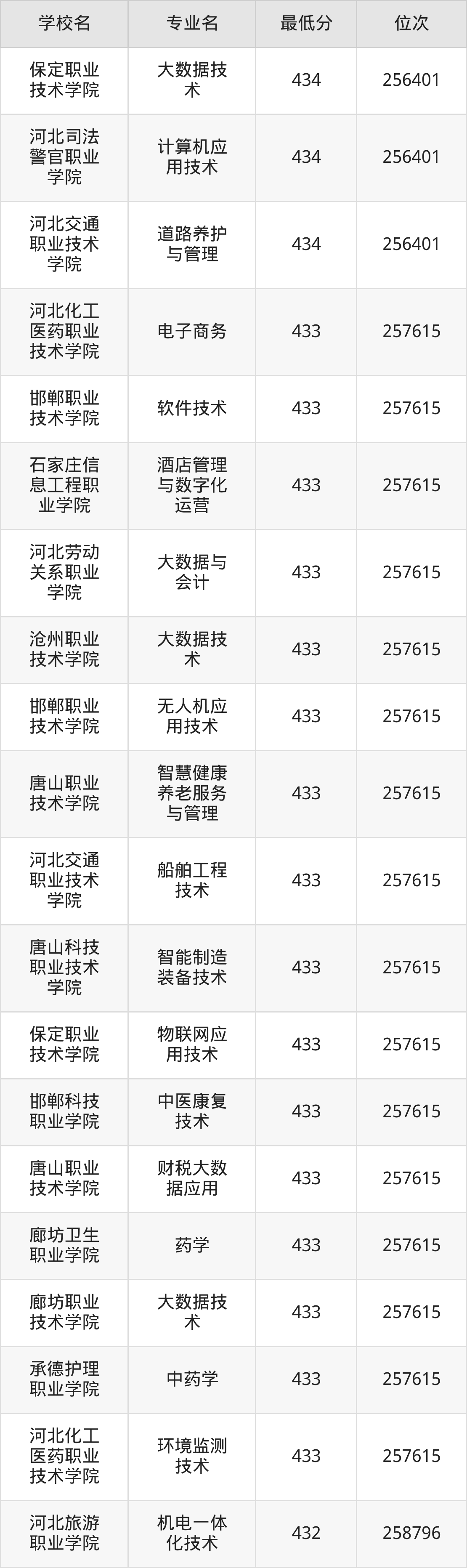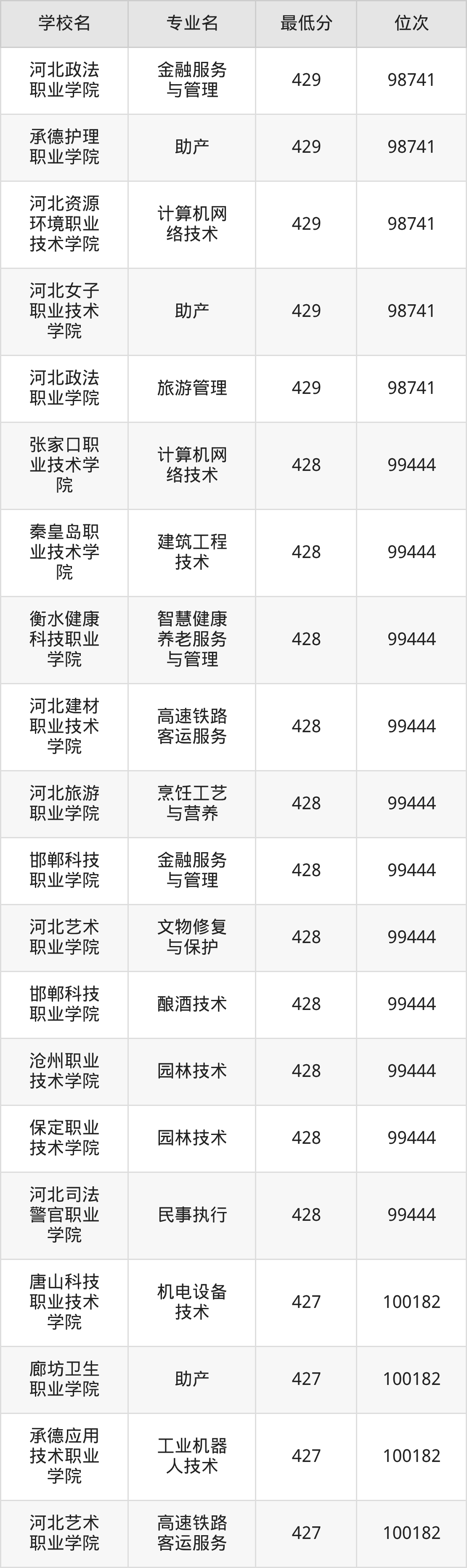 (3)河北建材职业技术学院:2025年公办大专分数线383分到451分,位次区间是305728名到235189名,招生专业有17个,最低为工程造价、最高为机电一体化技术。