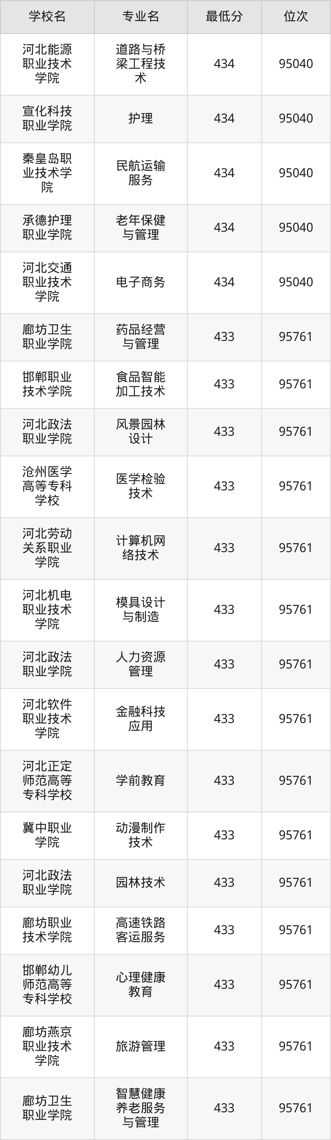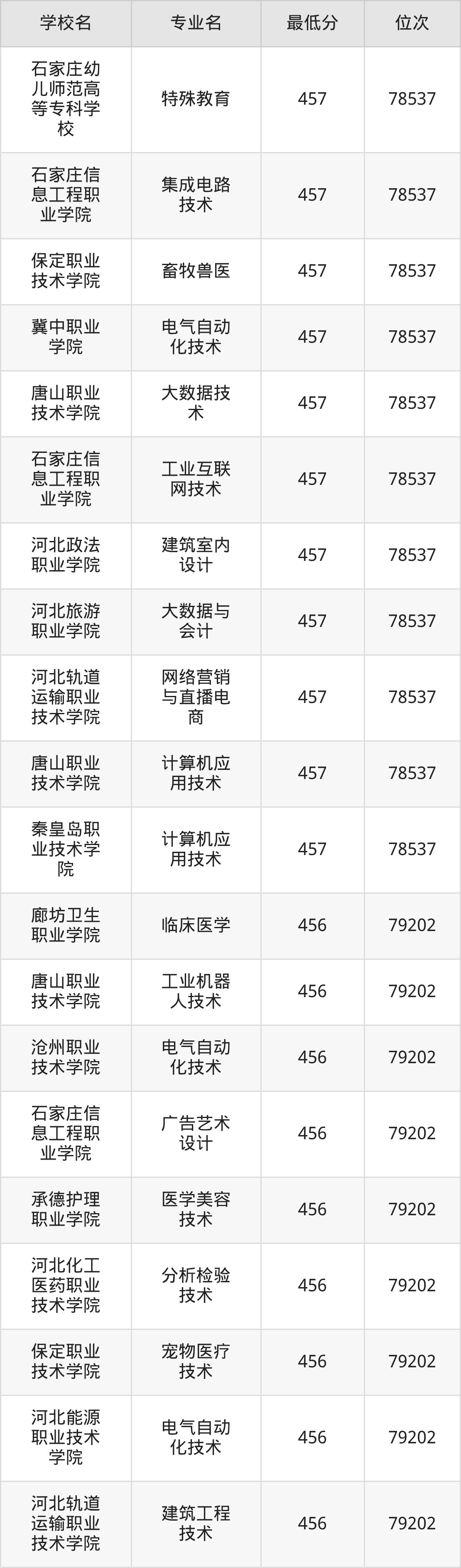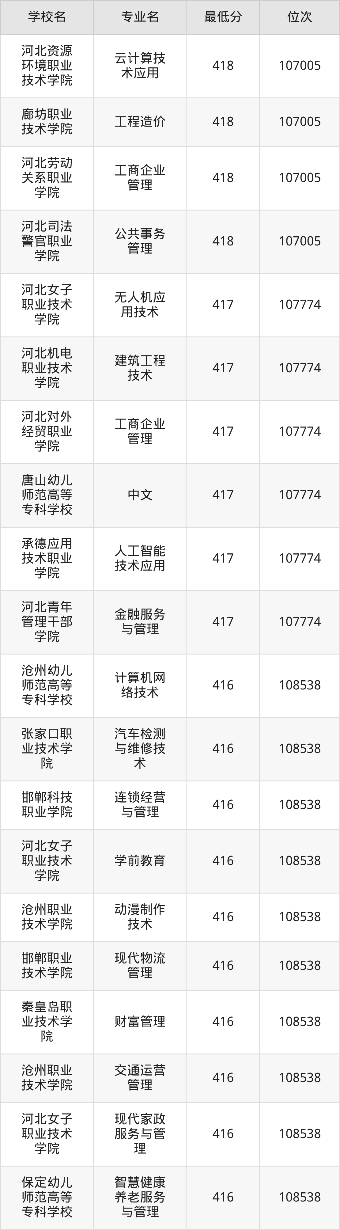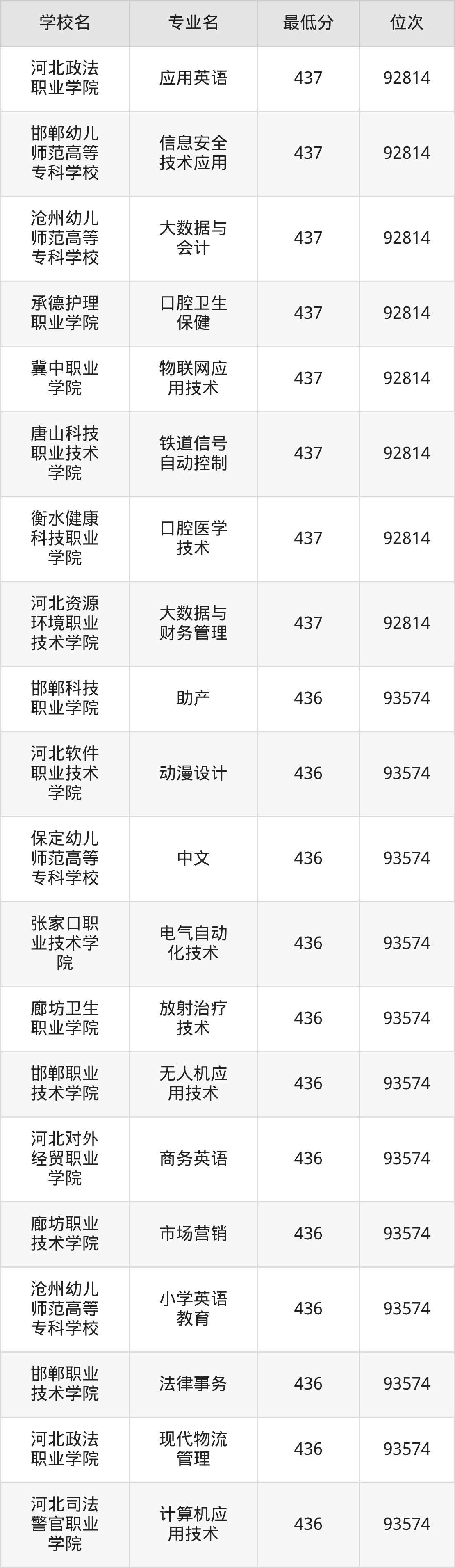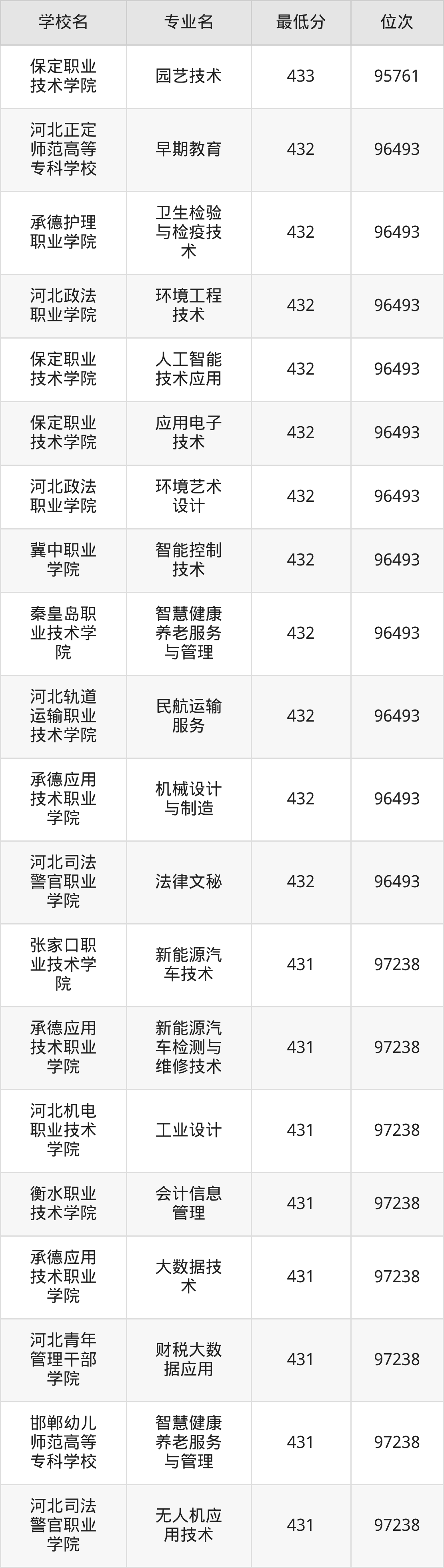(3)河北建材职业技术学院:2025年公办大专分数线383分到451分,位次区间是305728名到235189名,招生专业有17个,最低为工程造价、最高为机电一体化技术。