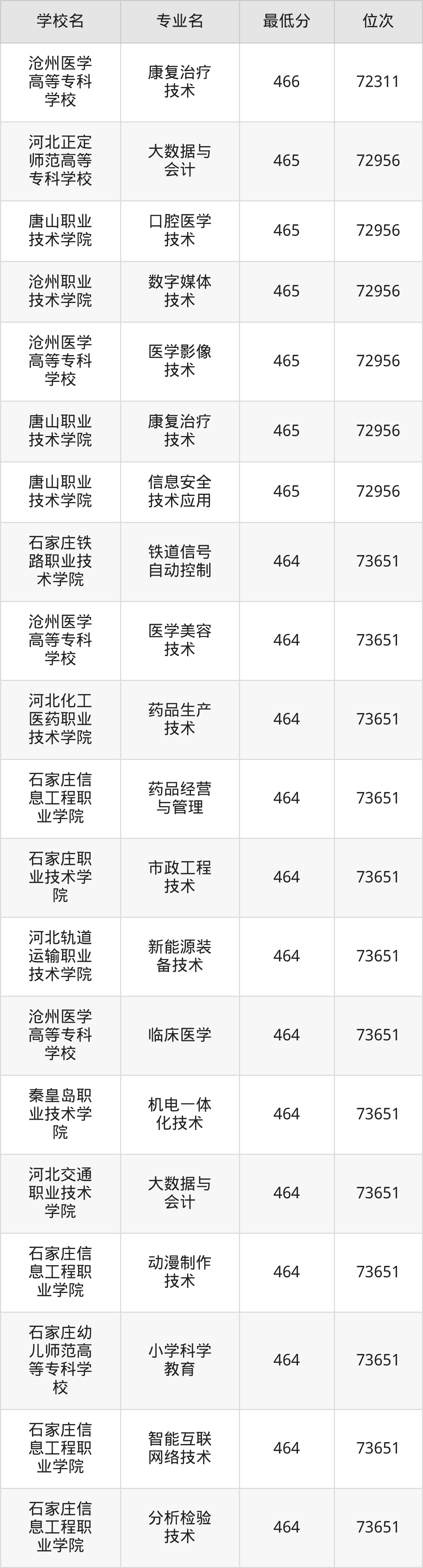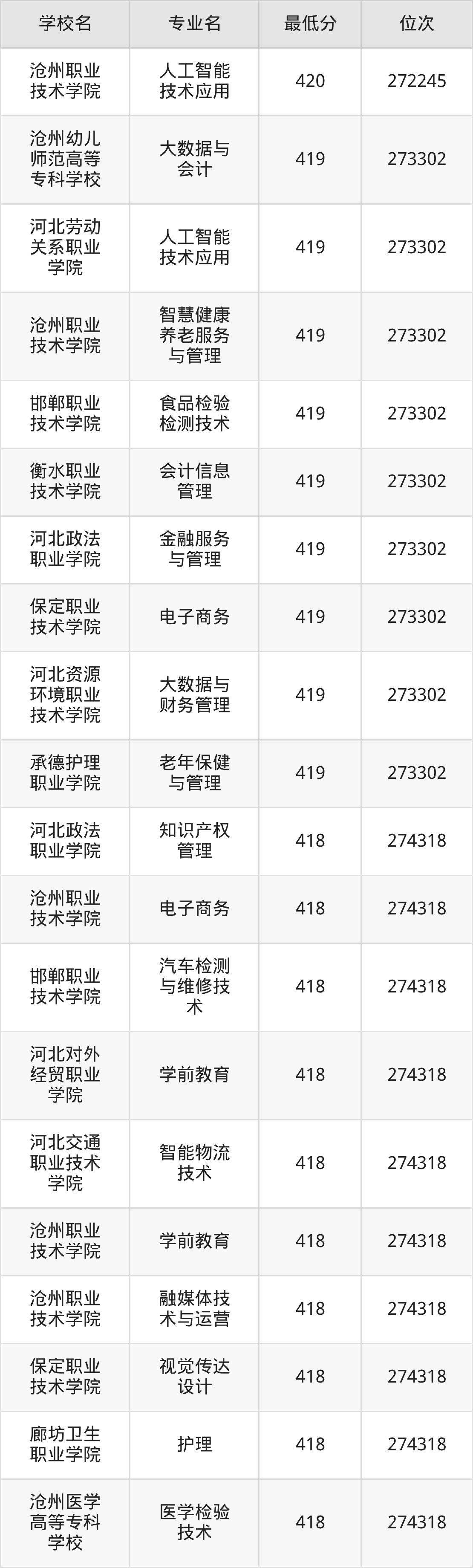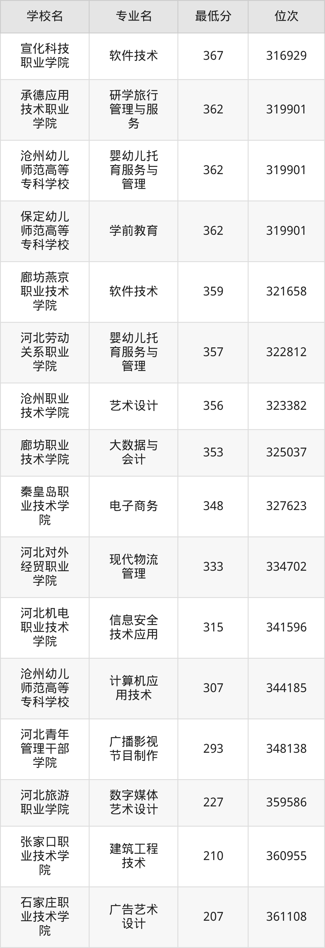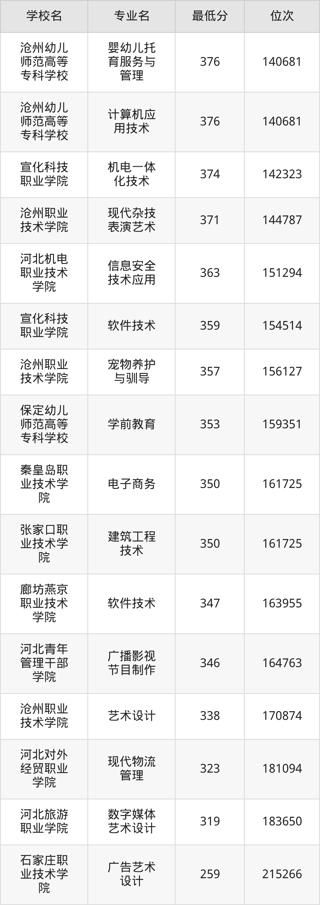 (3)沧州职业技术学院:2025年公办大专分数线338分到465分,位次区间是170874名到72956名,招生专业有36个,最低为艺术设计、最高为数字媒体技术。