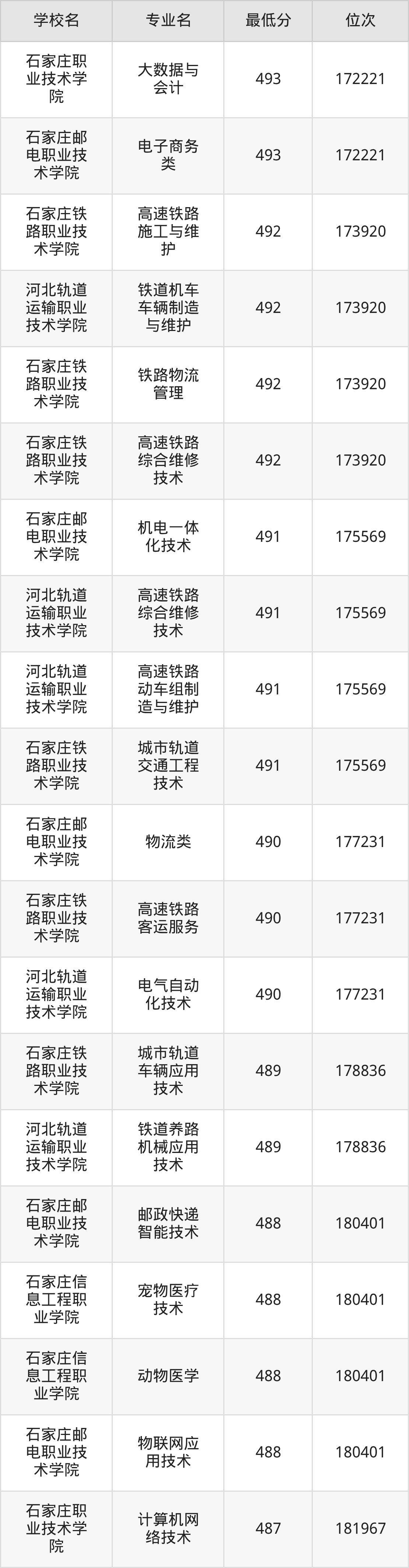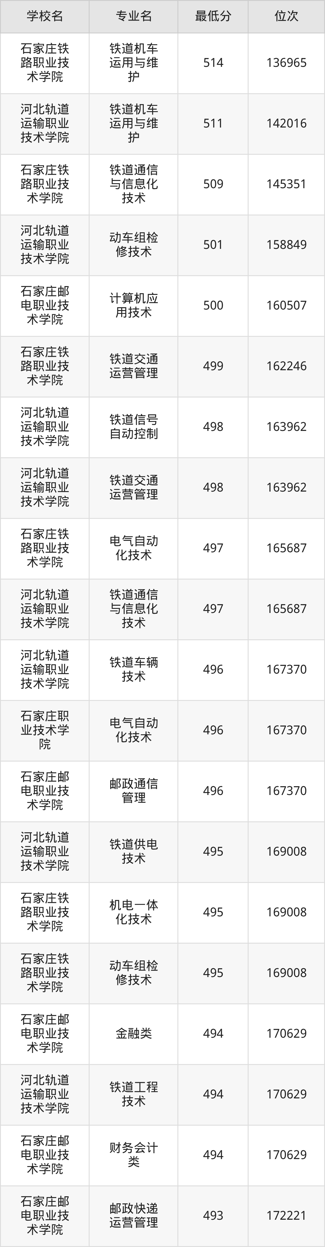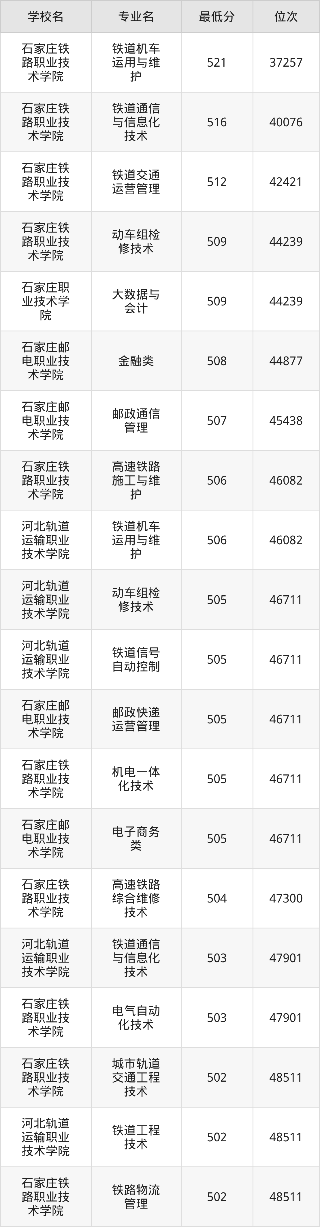 (6)石家庄铁路职业技术学院:2025年公办大专分数线437分到514分,位次区间是252764名到136965名,招生专业有28个,最低为道路与桥梁工程技术、最高为铁道机车运用与维护。
