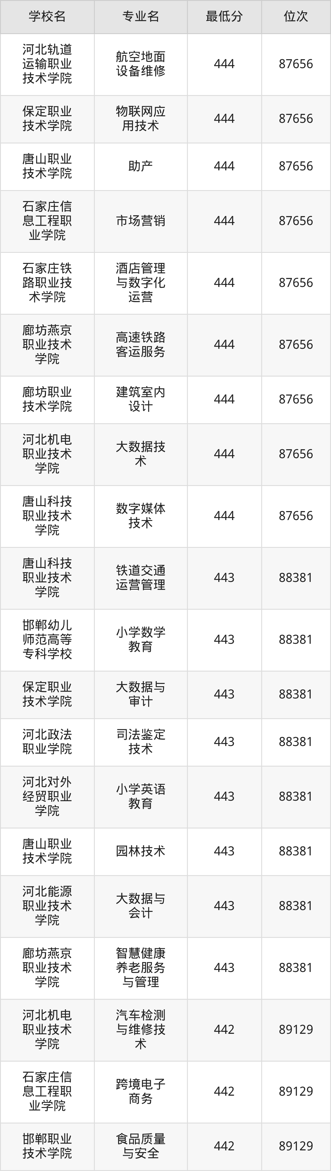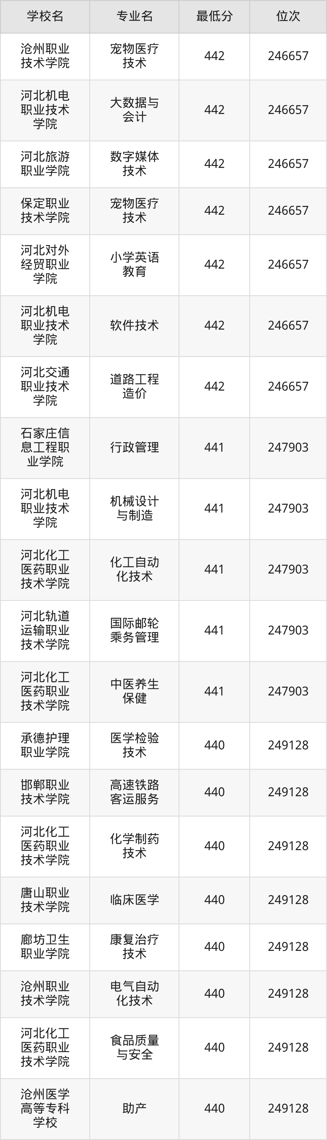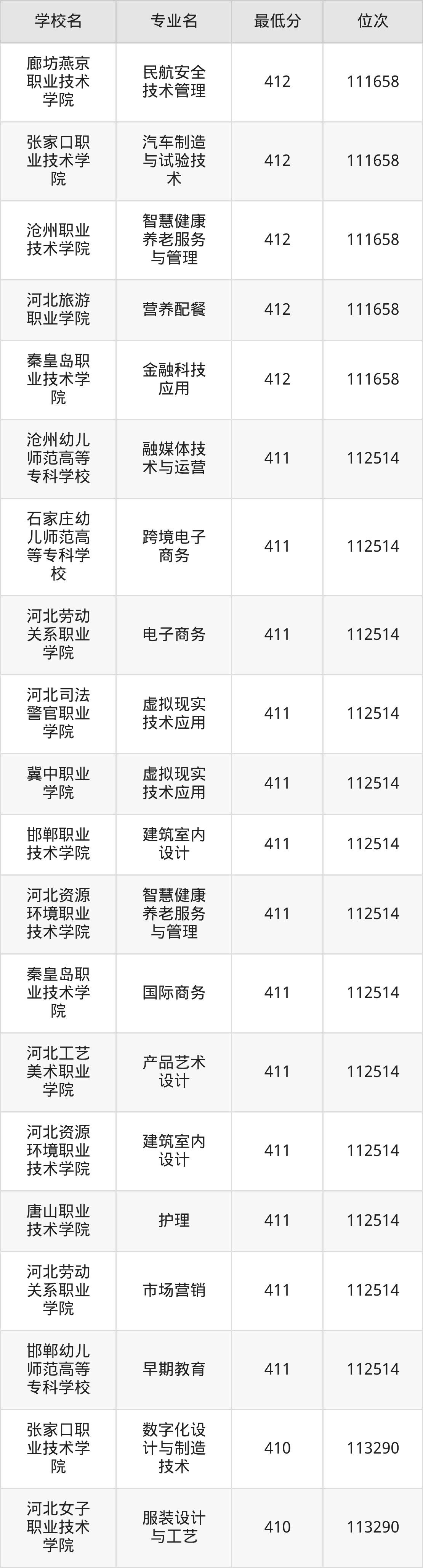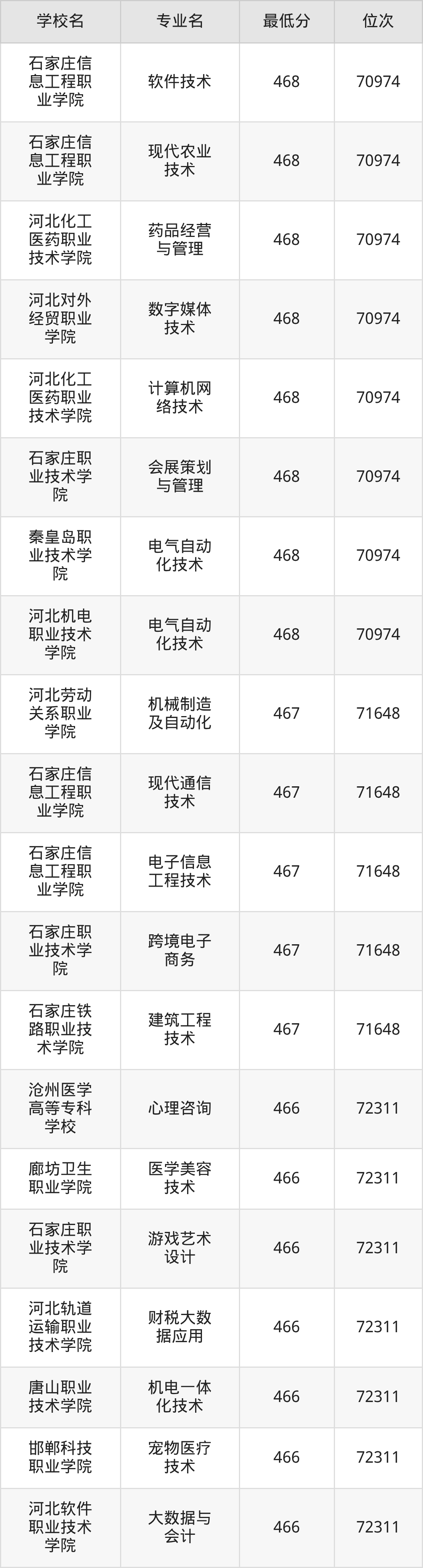 (2)邯郸科技职业学院:2025年公办大专分数线412分到466分,位次区间是111658名到72311名,招生专业有23个,最低为材料工程技术、最高为宠物医疗技术。