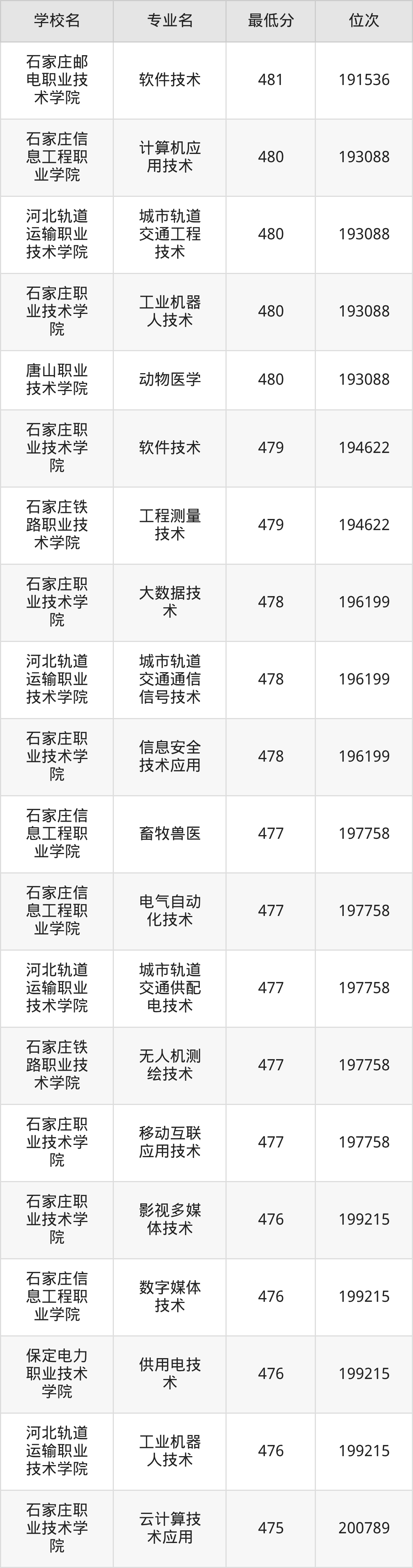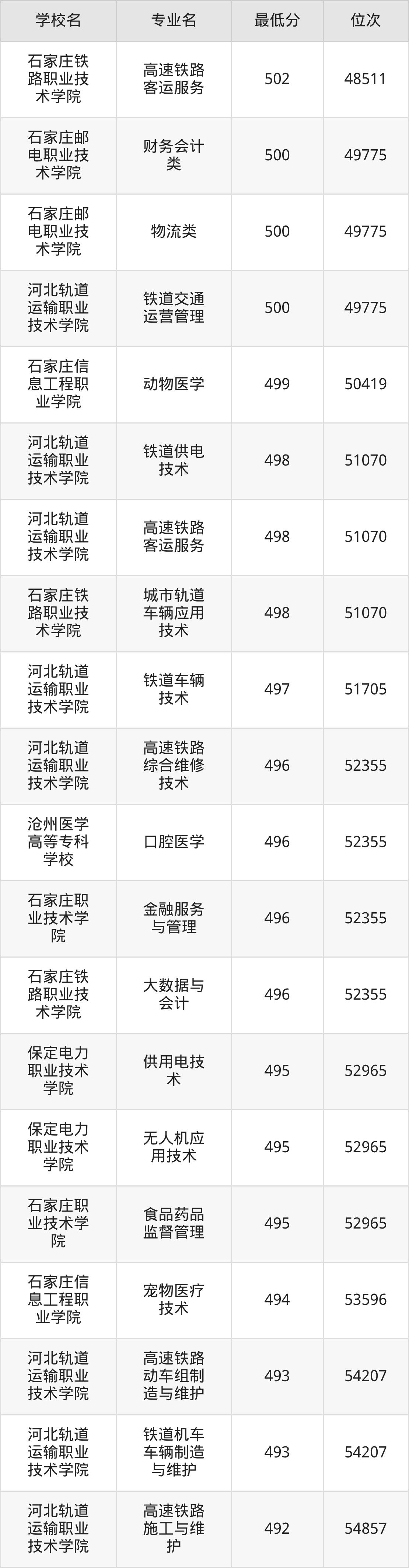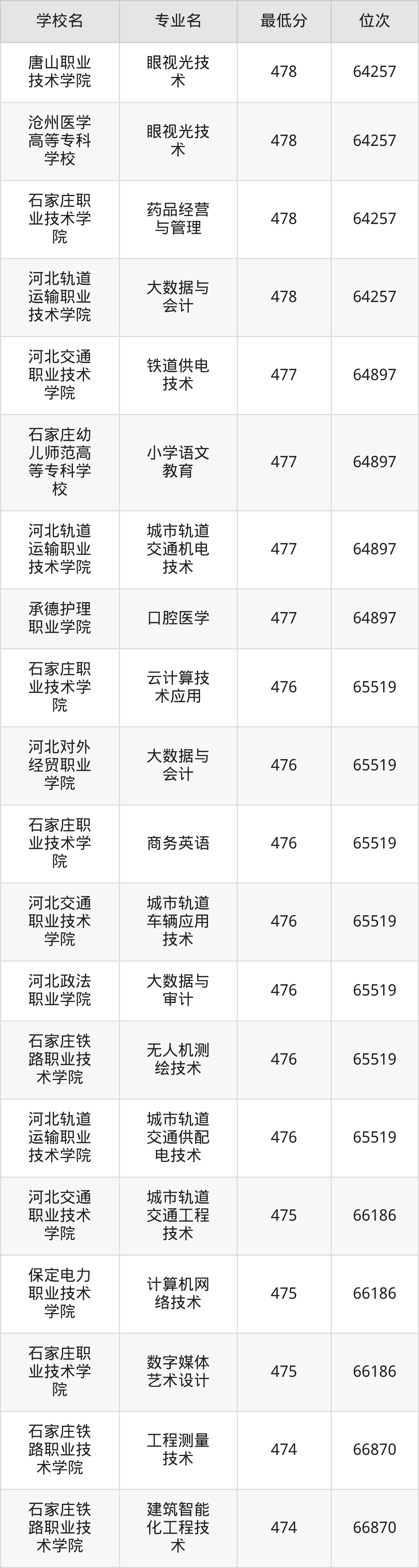 (1)唐山职业技术学院:2025年公办大专分数线394分到480分,位次区间是297095名到193088名,招生专业有39个,最低为护理、最高为动物医学。