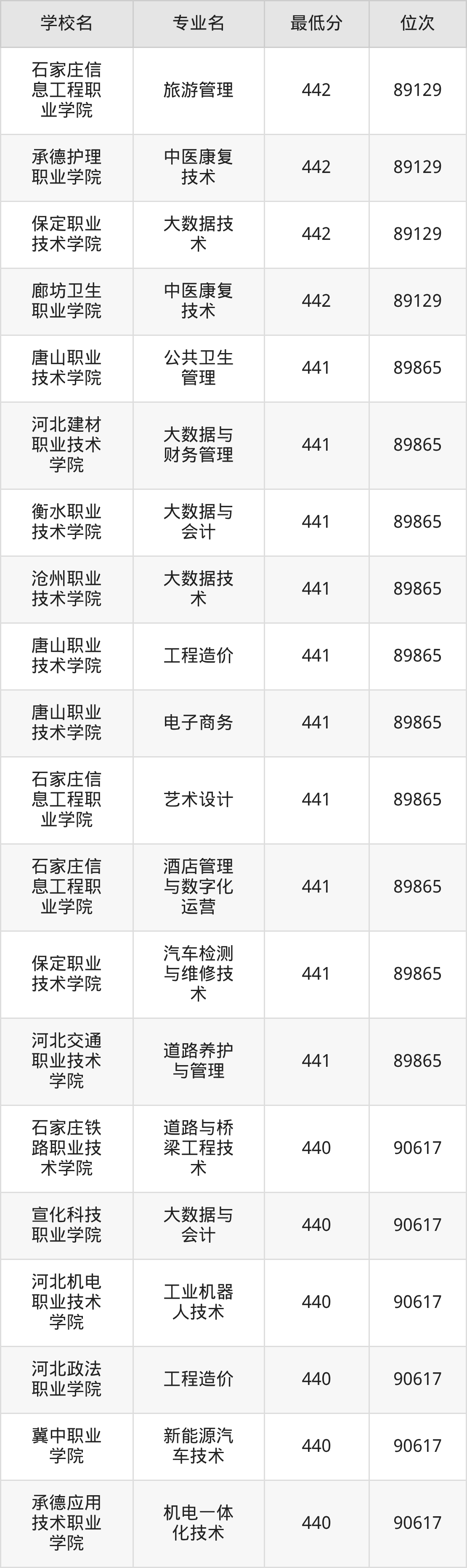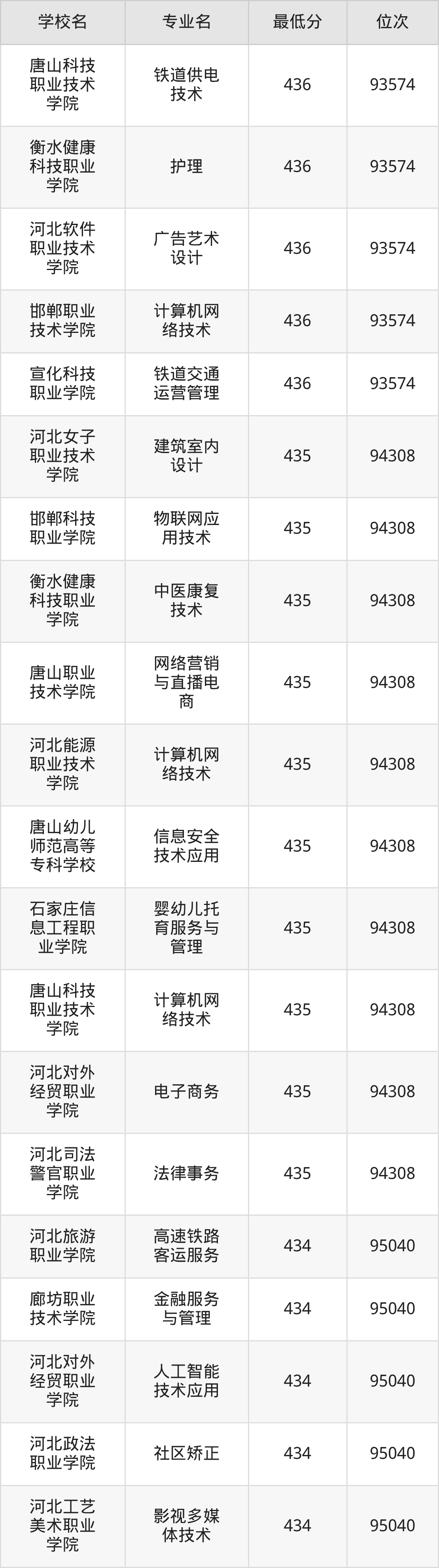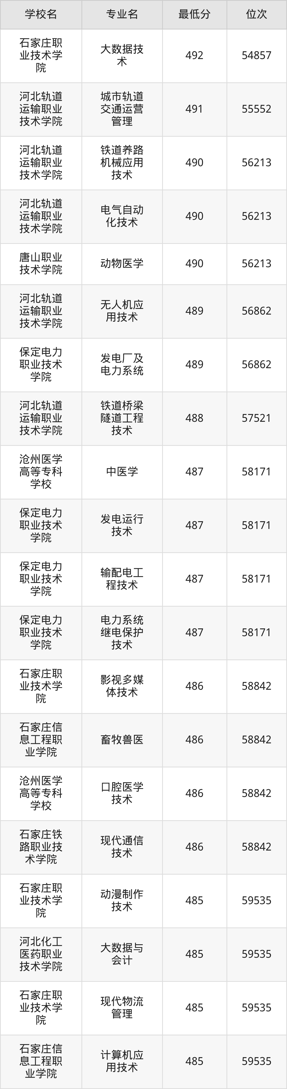 (1)唐山职业技术学院:2025年公办大专分数线394分到480分,位次区间是297095名到193088名,招生专业有39个,最低为护理、最高为动物医学。