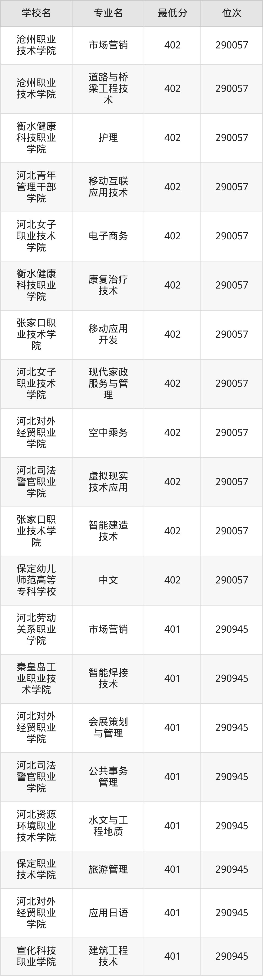 (2)河北正定师范高等专科学校:2025年公办大专分数线400分到456分,位次区间是291853名到228462名,招生专业有9个,最低为工程造价、最高为护理、计算机应用技术。