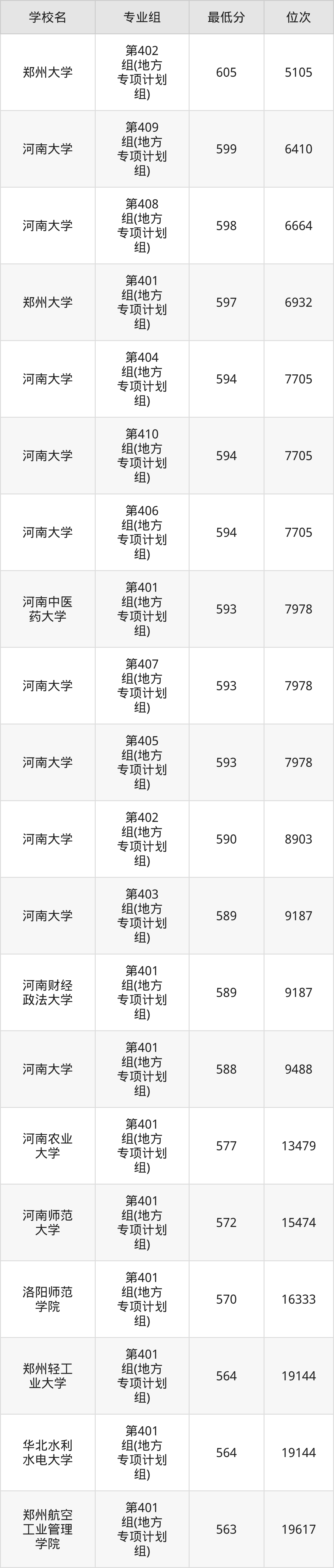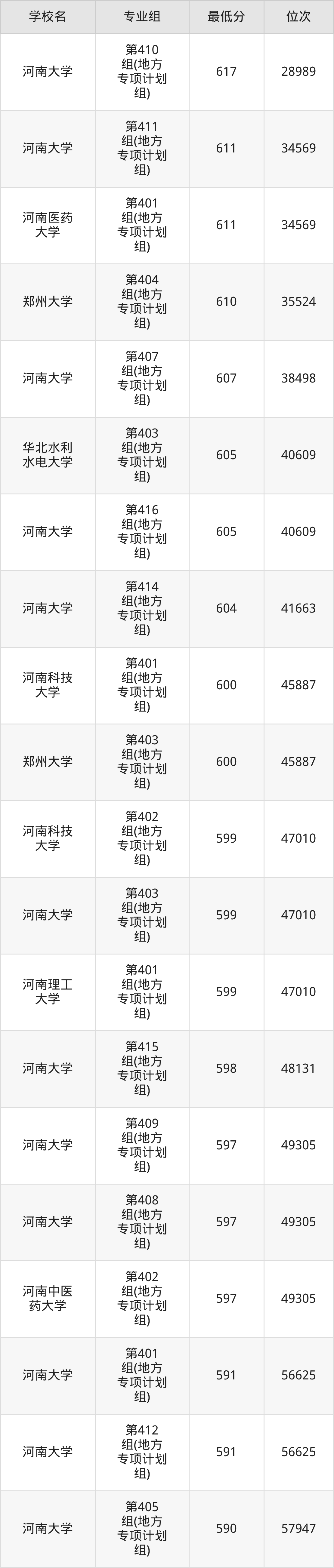 (1)河南科技大学:2025年地方专项计划分数线599分到600分,位次区间是47010名到45887名,招生专业组有2个,最低为第402组(地方专项计划组)、最高为第401组(地方专项计划组)。