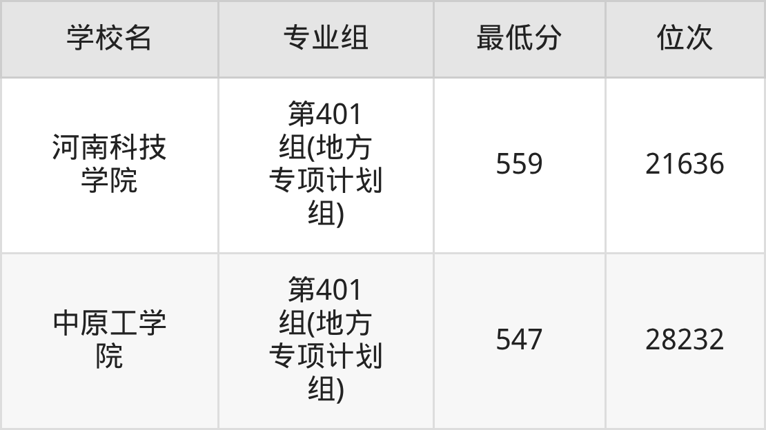 (6)河南科技学院:2025年地方专项计划分数线559分,位次是21636名,招生专业组有1个,最低为第401组(地方专项计划组)。