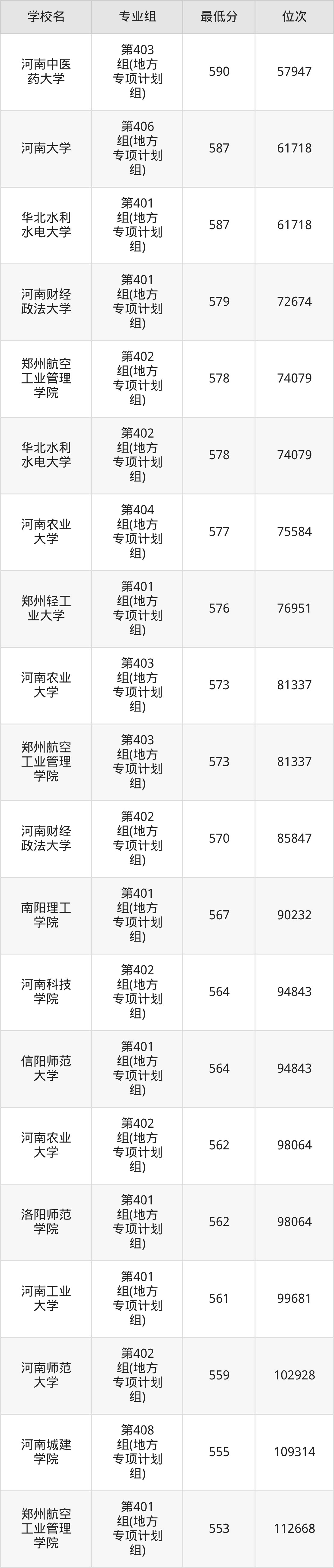 (2)河南农业大学:2025年地方专项计划分数线577分,位次是13479名,招生专业组有1个,最低为第401组(地方专项计划组)。