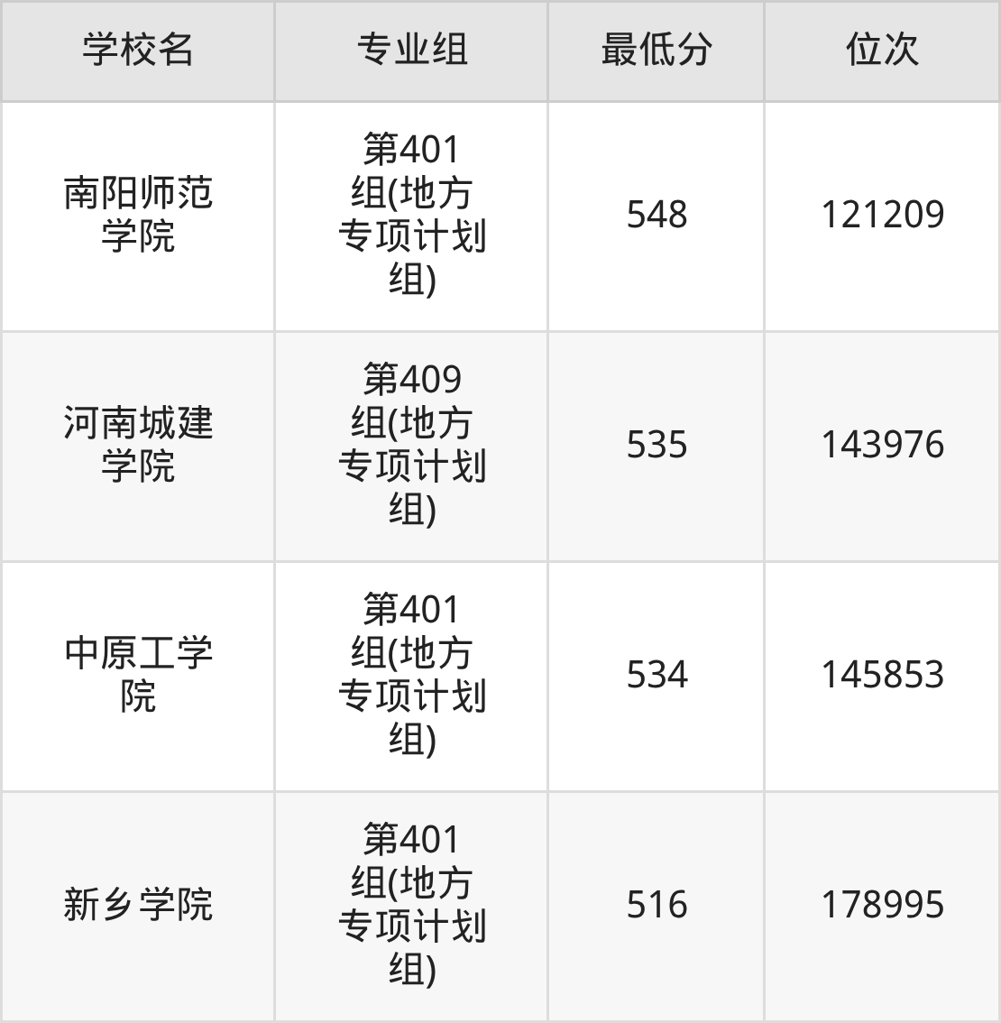 (5)河南城建学院:2025年地方专项计划分数线535分到555分,位次区间是143976名到109314名,招生专业组有2个,最低为第409组(地方专项计划组)、最高为第408组(地方专项计划组)。