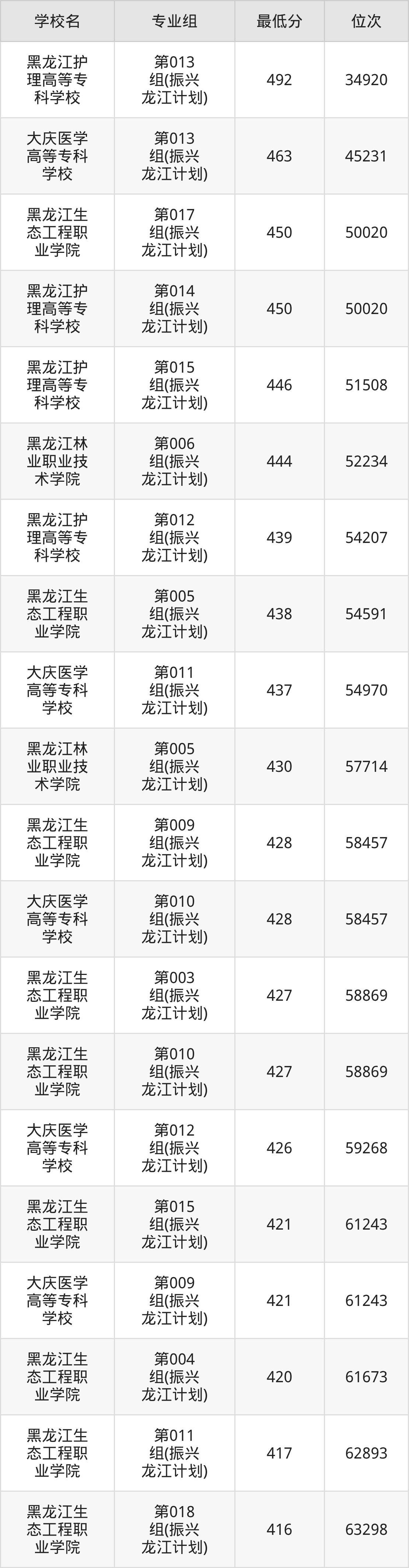 (4)黑龙江护理高等专科学校:2025年公办大专分数线312分到492分,位次区间是100523名到34920名,招生专业组有6个,最低为第011组、最高为第013组(振兴龙江计划)。