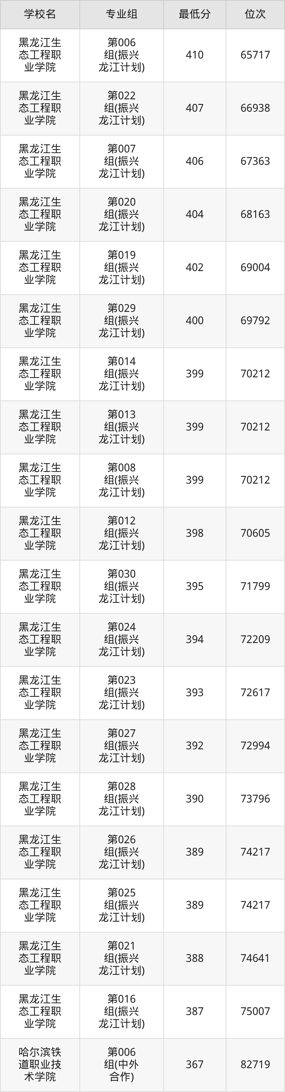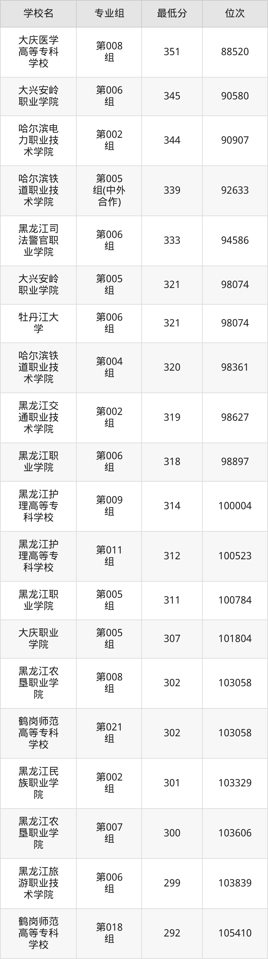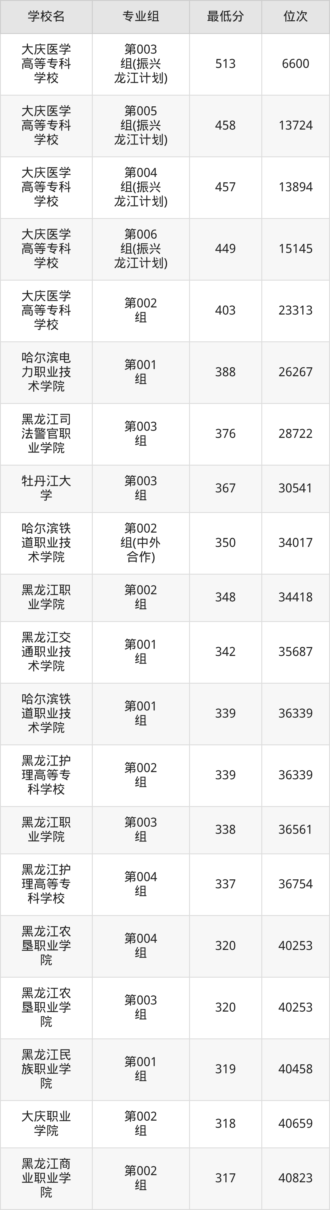 (3)黑龙江民族职业学院:2025年公办大专分数线319分,位次是40458名,招生专业组有1个,最低为第001组。