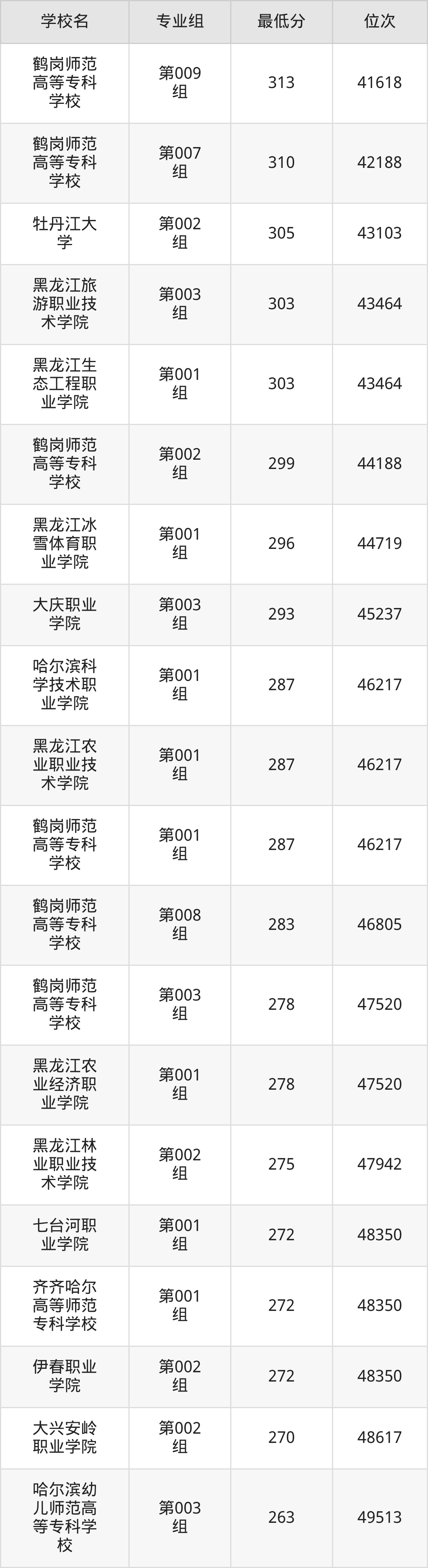 (4)黑龙江冰雪体育职业学院:2025年公办大专分数线296分,位次是44719名,招生专业组有1个,最低为第001组。