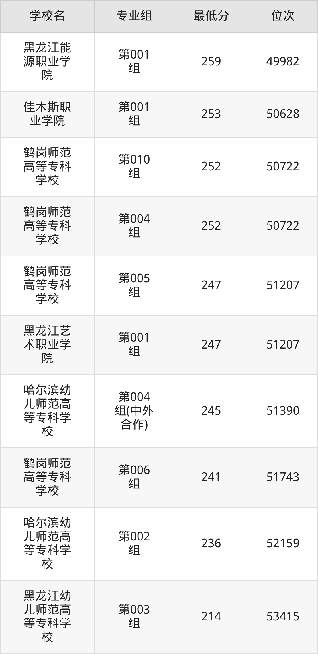 2025年黑龙江公办大专历史类最低录取分数线是214分,位次排名是53415名,对应收分最低的是黑龙江幼儿师范高等专科学校(第003组)。录取分数线最高的是大庆医学高等专科学校第003组(振兴龙江计划),2025年最低分513分、位次是6600名。