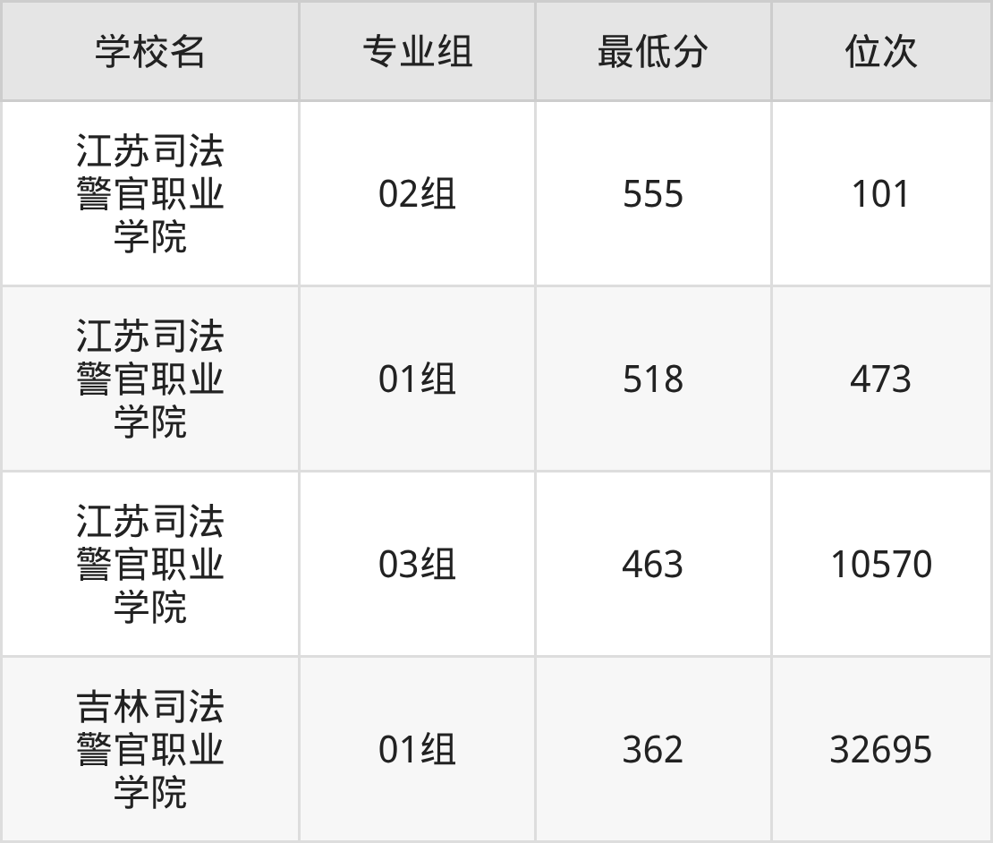 (1)江苏司法警官职业学院:2025年司法类分数线463分到555分,位次区间是10570名到101名,招生专业组有3个,最低为03组、最高为02组。