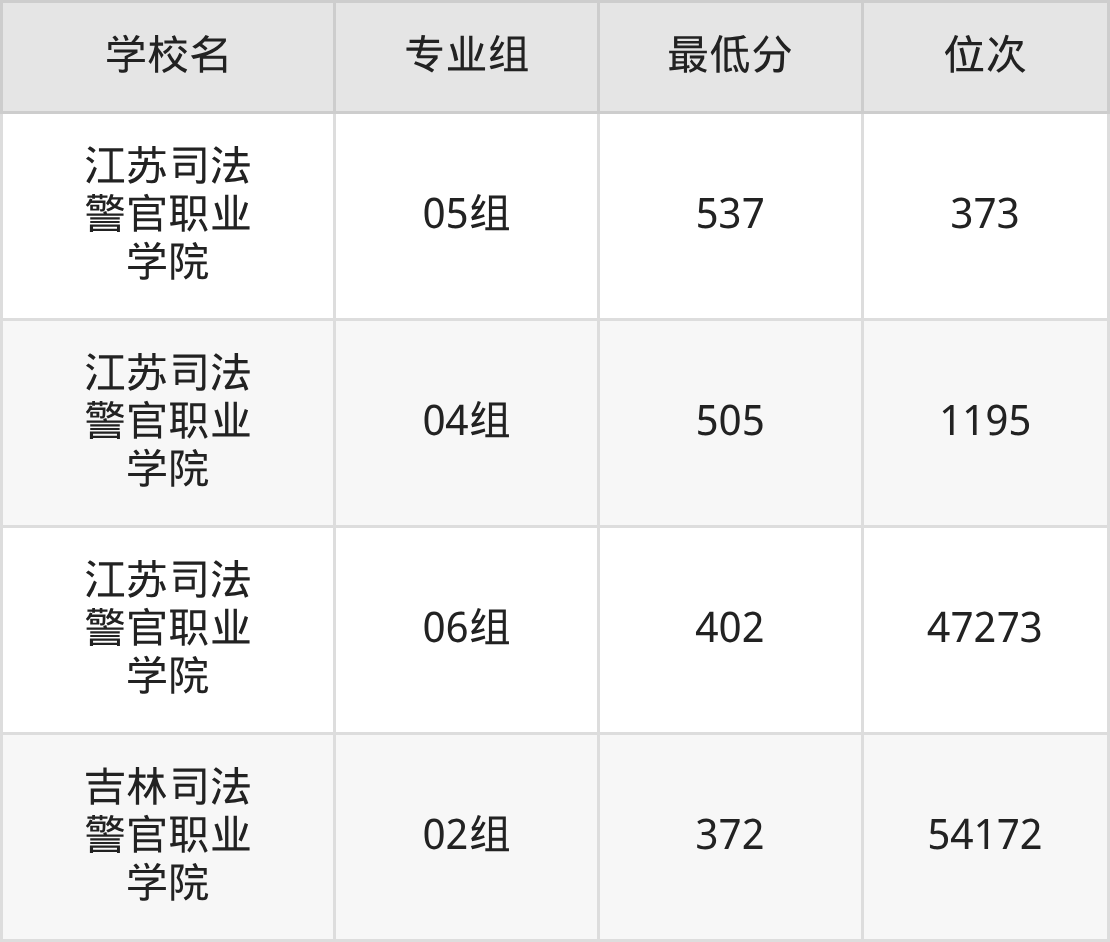(1)江苏司法警官职业学院:2025年司法类分数线402分到537分,位次区间是47273名到373名,招生专业组有3个,最低为06组、最高为05组。