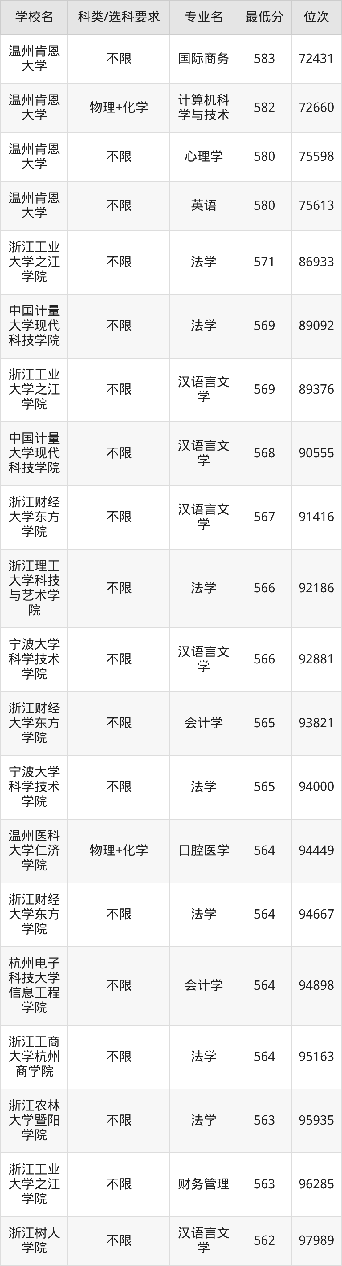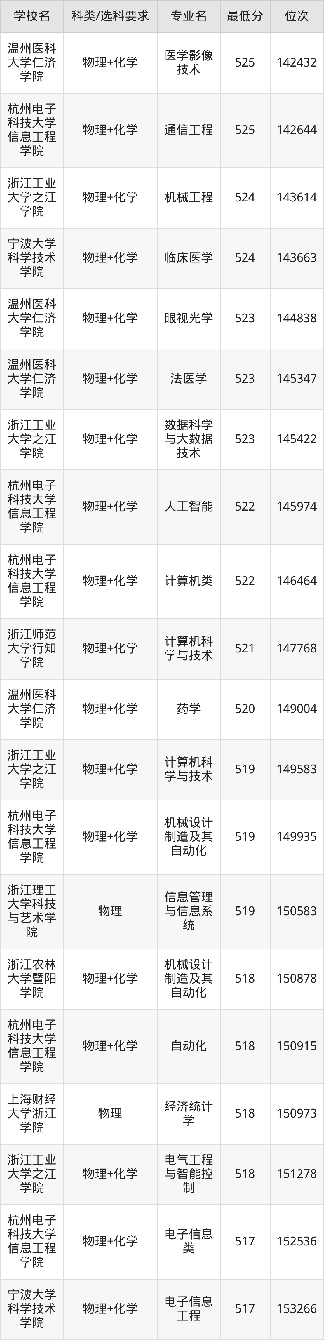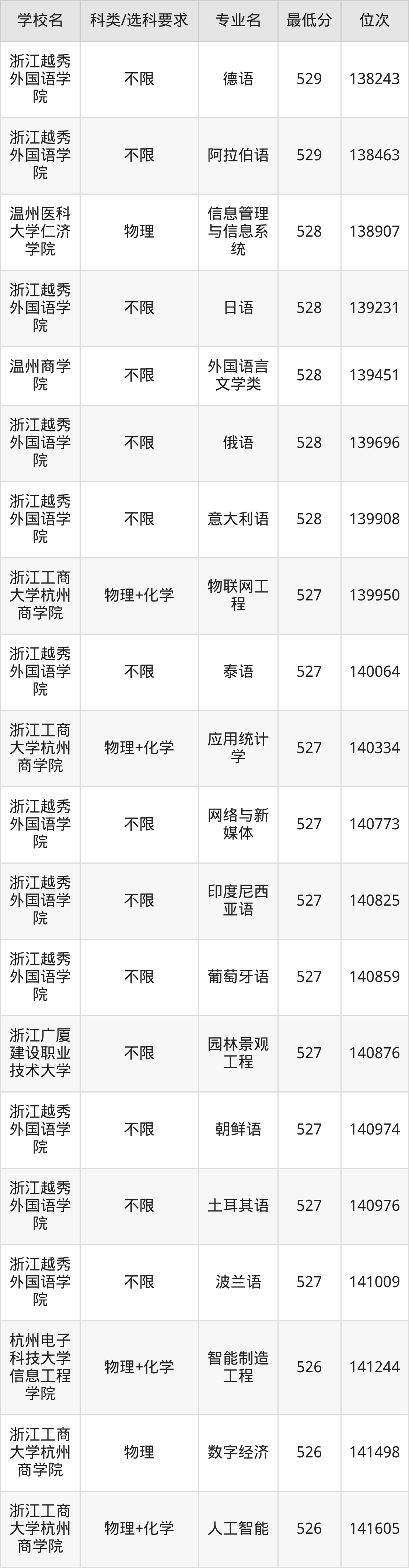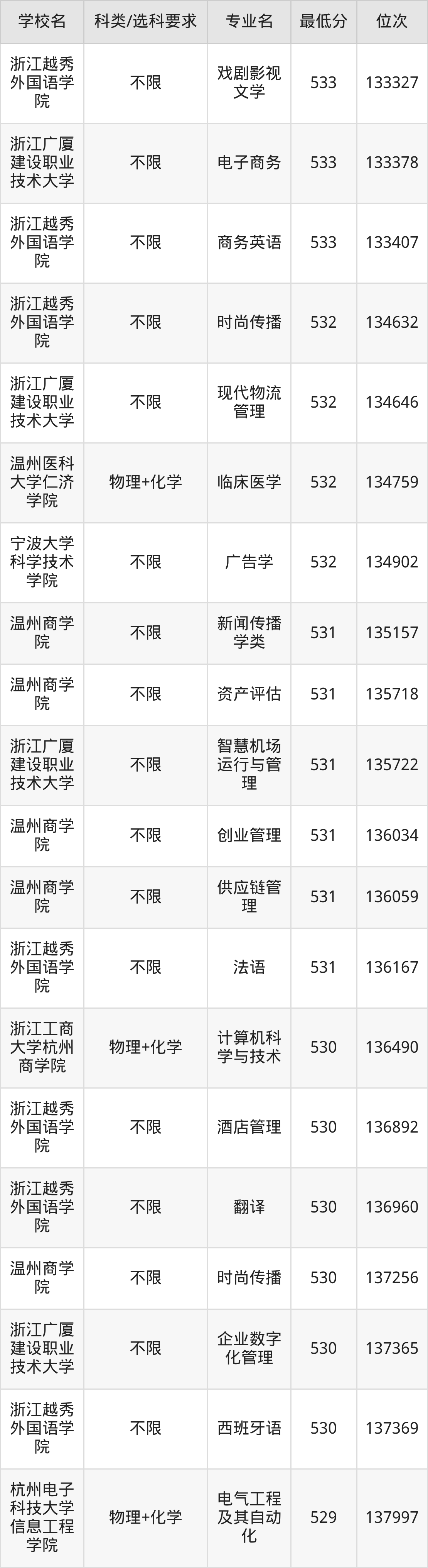 (1)浙江工商大学杭州商学院:2025年民办本科分数线526分到564分,位次区间是141605名到95163名,招生专业有25个,最低为人工智能、最高为法学。