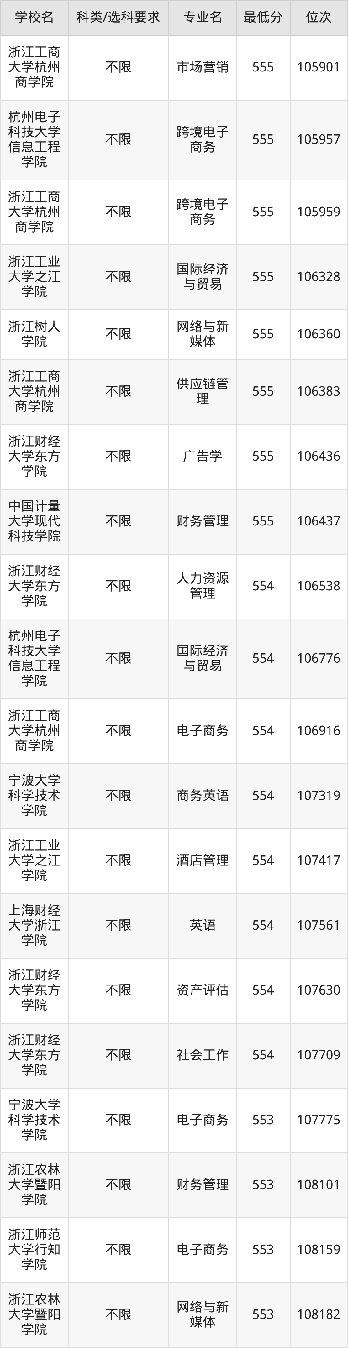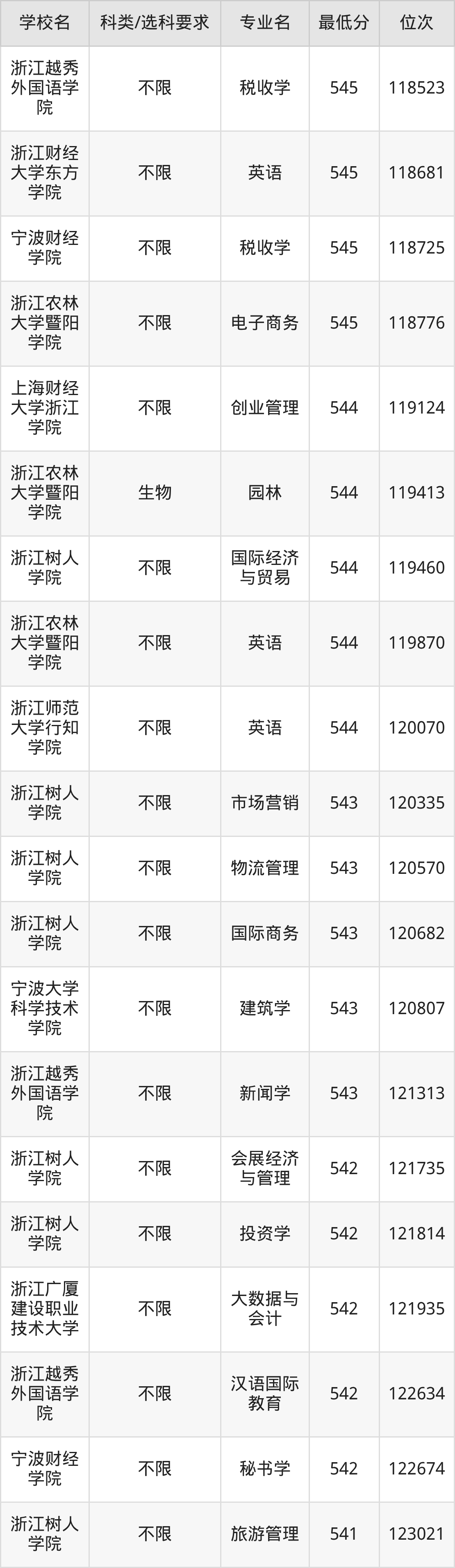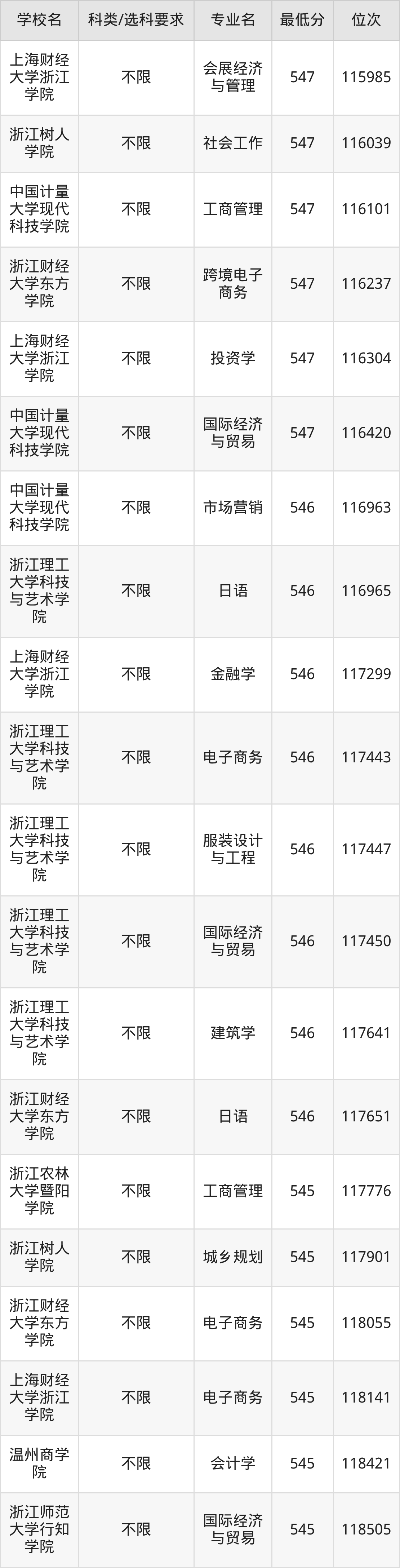 (1)浙江工商大学杭州商学院:2025年民办本科分数线526分到564分,位次区间是141605名到95163名,招生专业有25个,最低为人工智能、最高为法学。