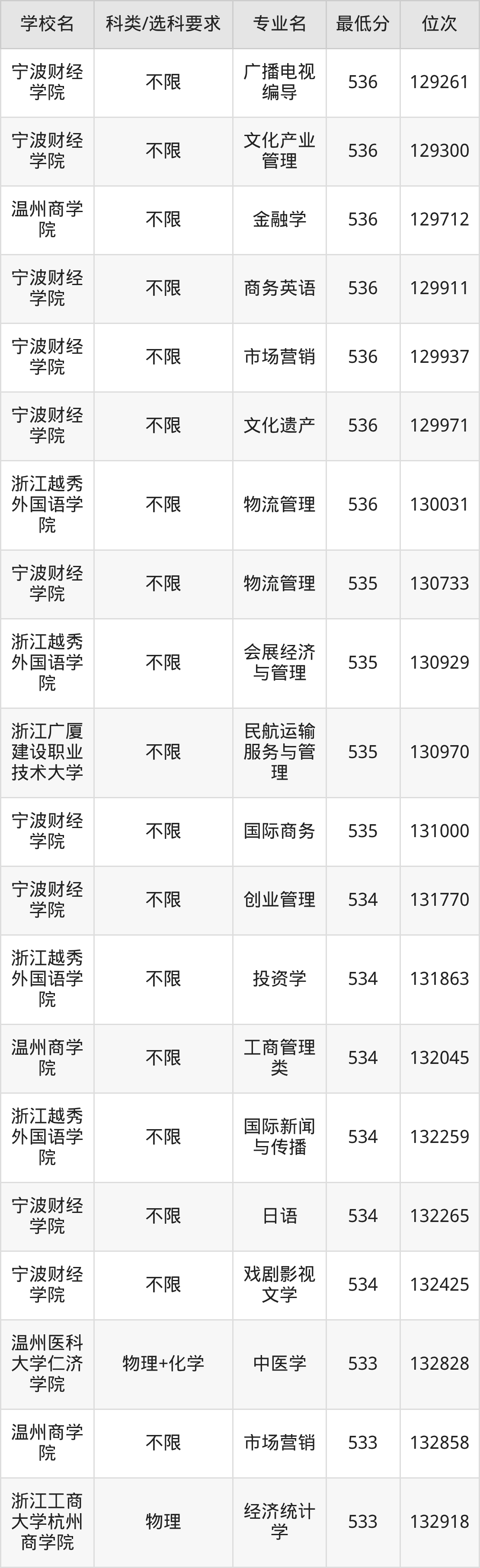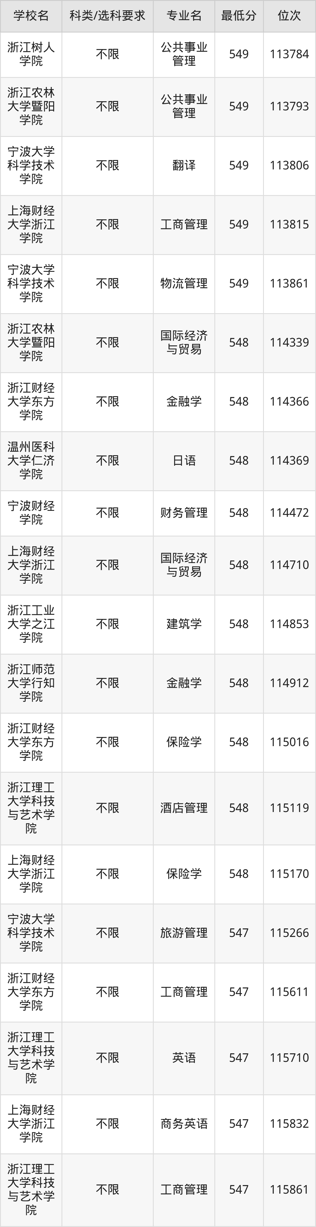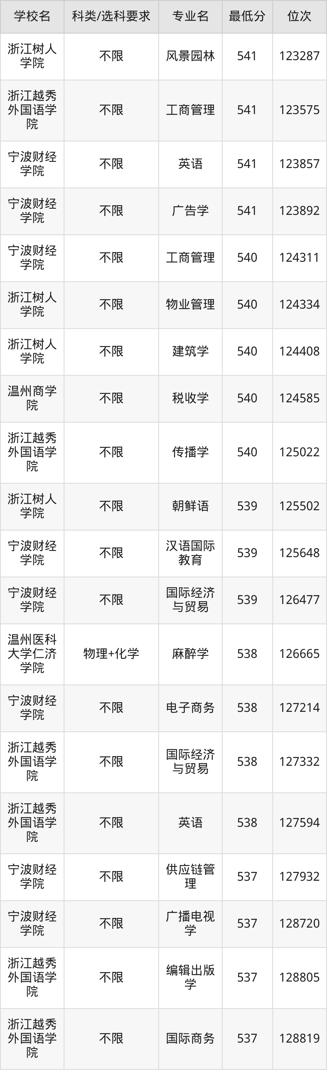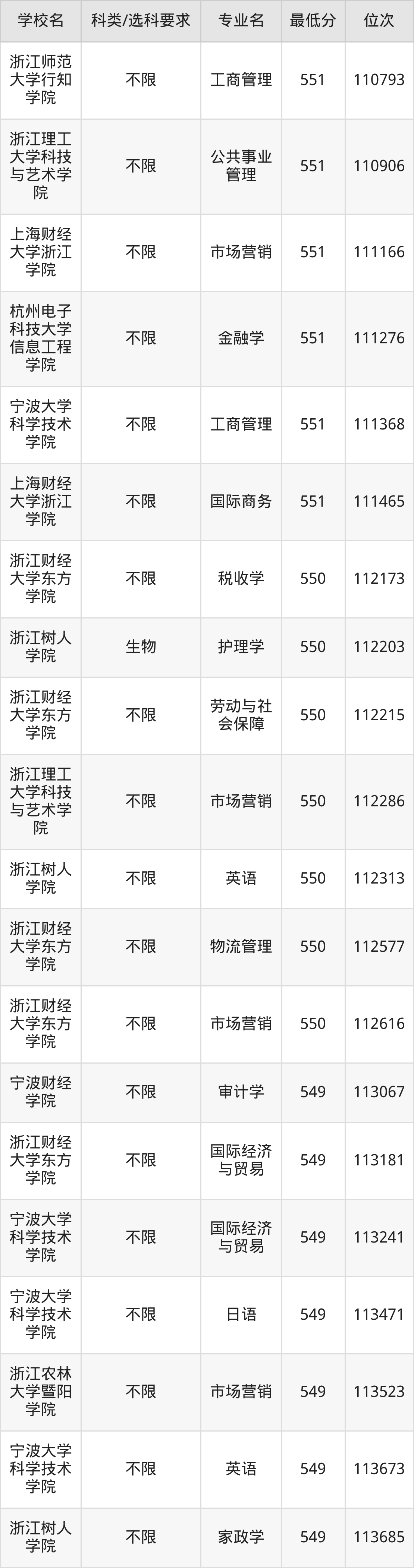 (1)浙江工商大学杭州商学院:2025年民办本科分数线526分到564分,位次区间是141605名到95163名,招生专业有25个,最低为人工智能、最高为法学。