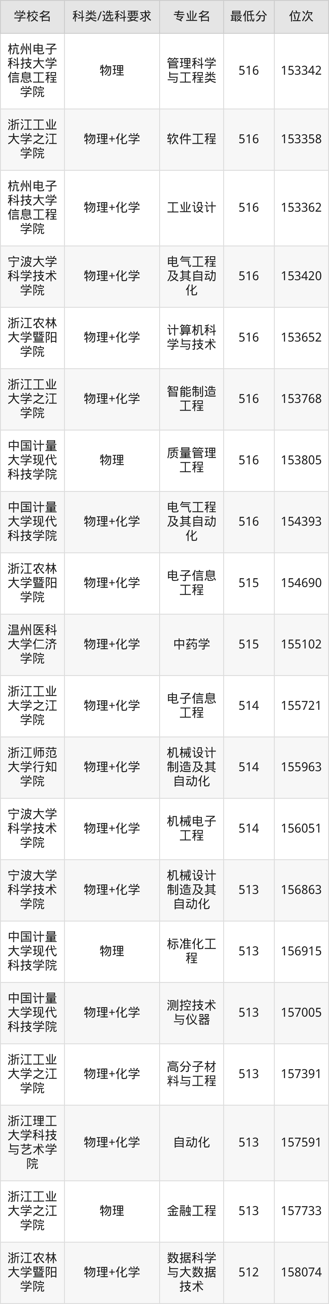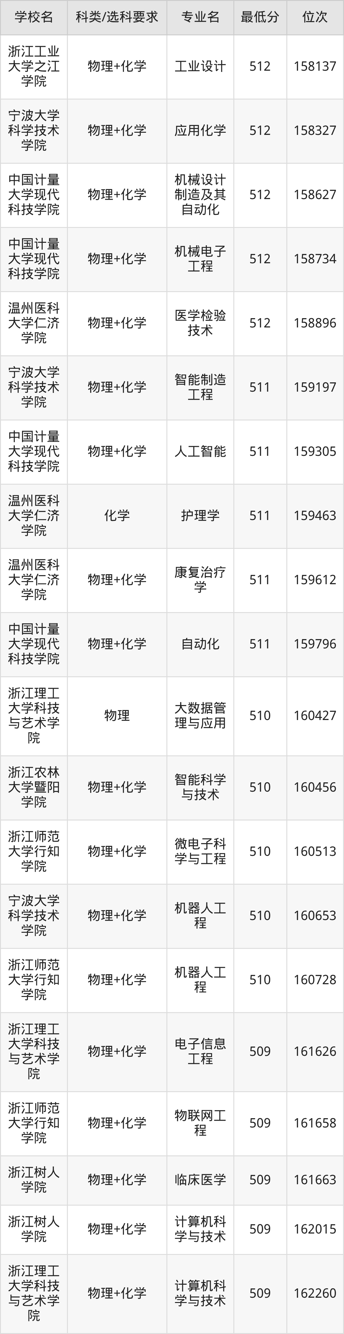 (6)浙江工业大学之江学院:2025年民办本科分数线512分到571分,位次区间是158137名到86933名,招生专业有26个,最低为工业设计、最高为法学。