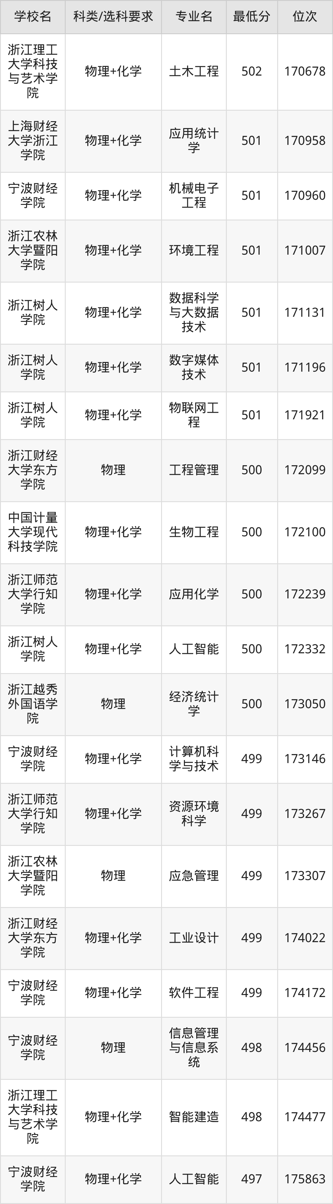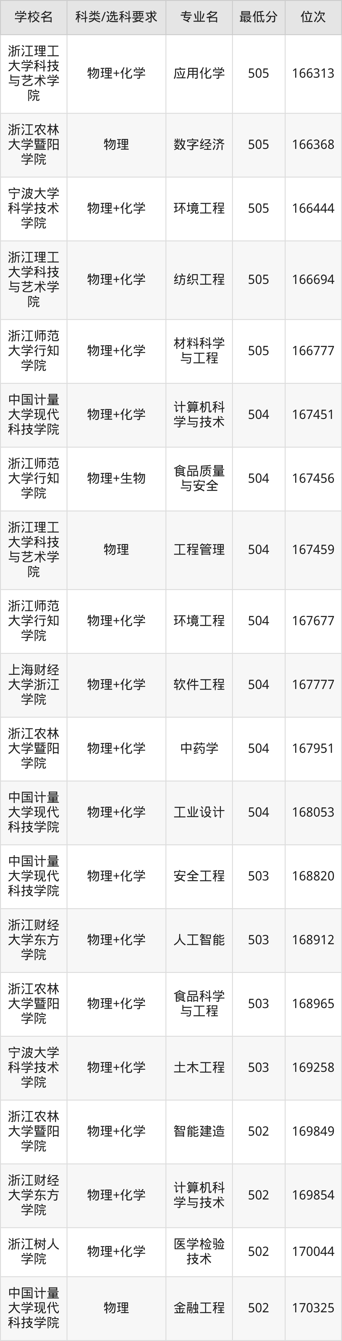 (2)浙江农林大学暨阳学院:2025年民办本科分数线499分到563分,位次区间是173307名到95935名,招生专业有23个,最低为应急管理、最高为法学。