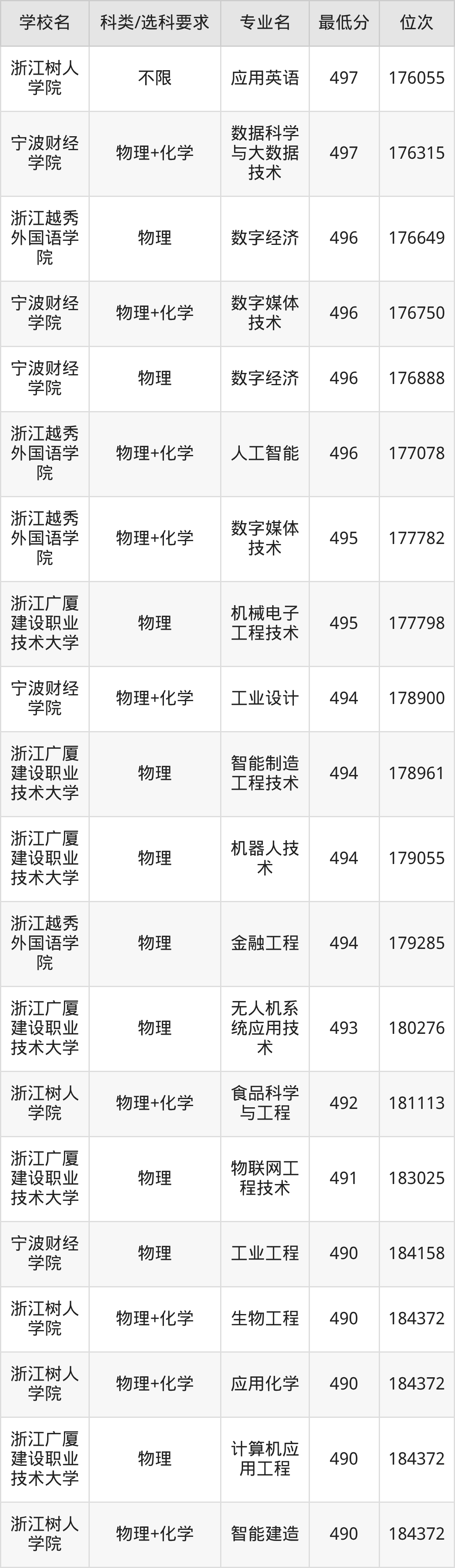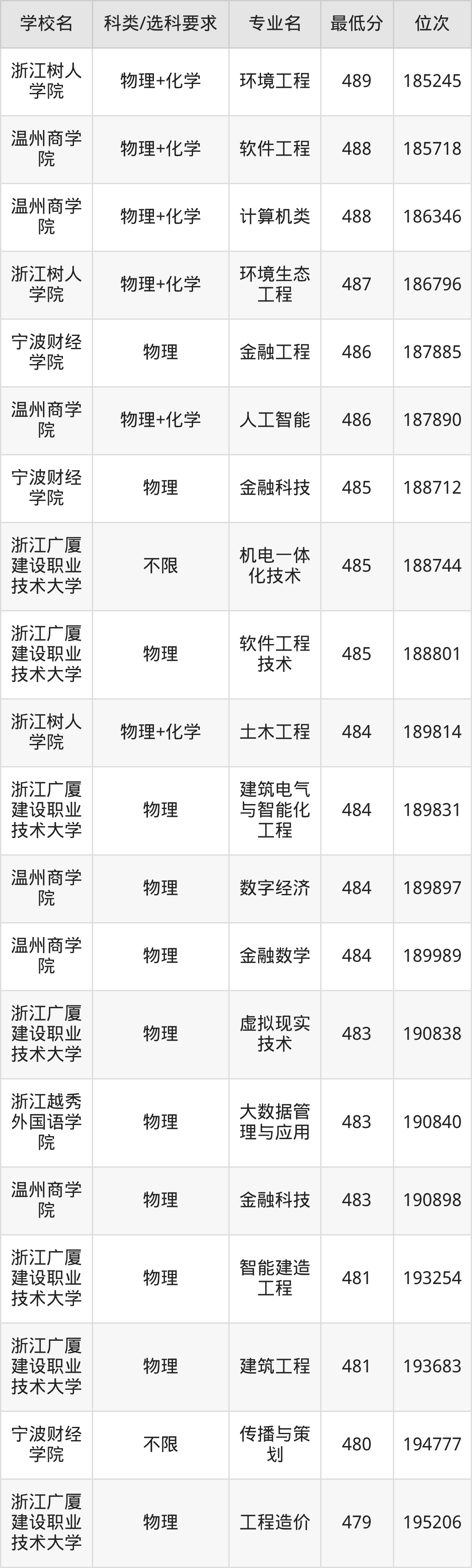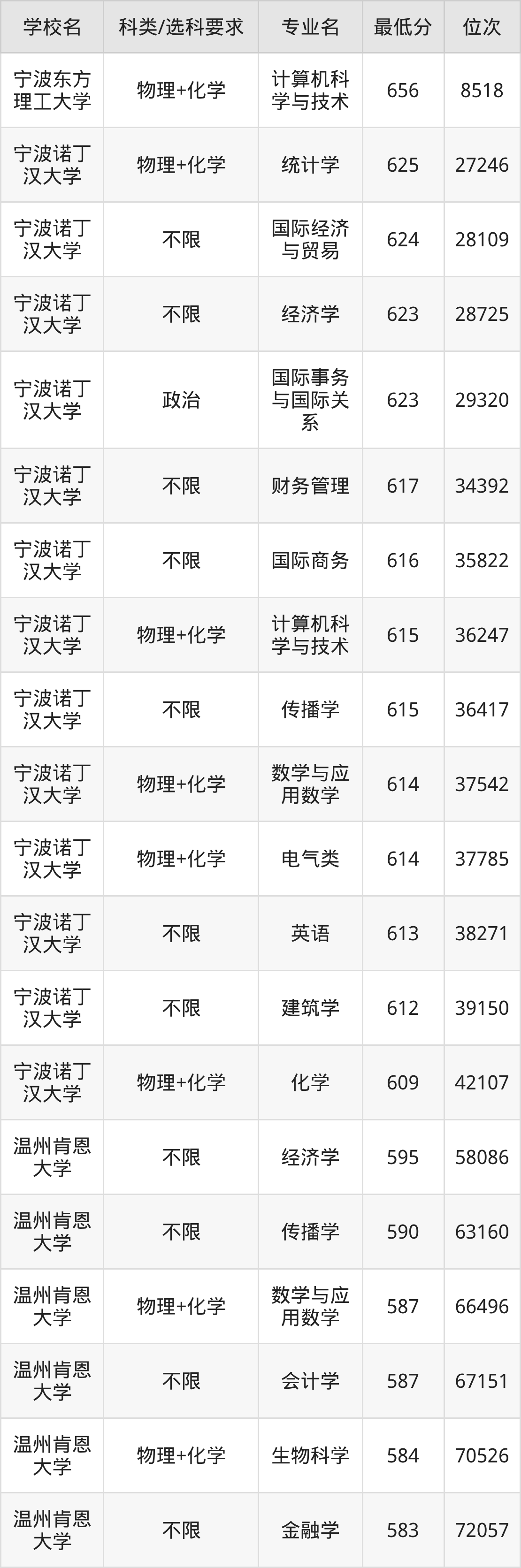 2025年浙江民办本科最低录取分数线是379分,位次排名是264112名,对应收分最低的是温州商学院(国际金融专业)。录取分数线最高的是宁波东方理工大学计算机科学与技术专业,2025年最低分656分、位次是8518名。