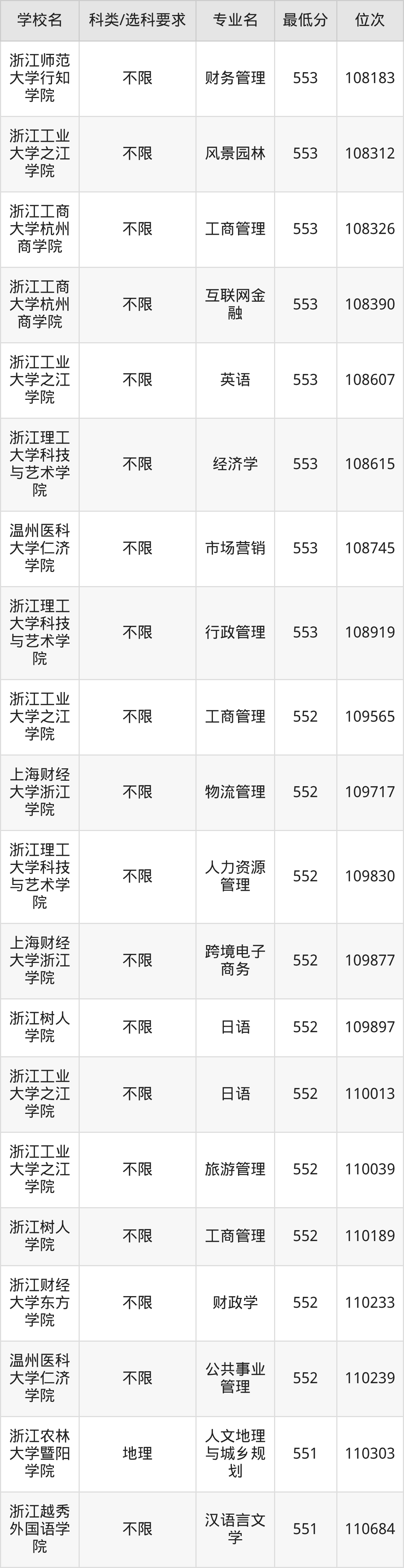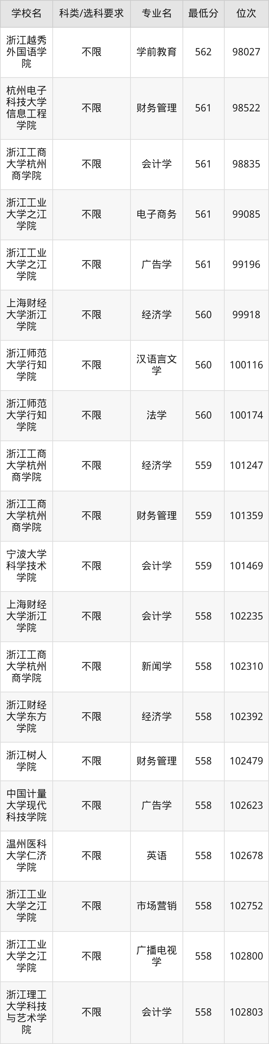 (4)浙江师范大学行知学院:2025年民办本科分数线499分到560分,位次区间是173267名到100116名,招生专业有24个,最低为资源环境科学、最高为汉语言文学。
