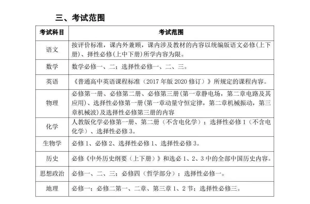 新高考模式首秀:物理科目涵盖必修第一册至第三册及选择性必修内容,其他科目范围明确,避免盲目复习。