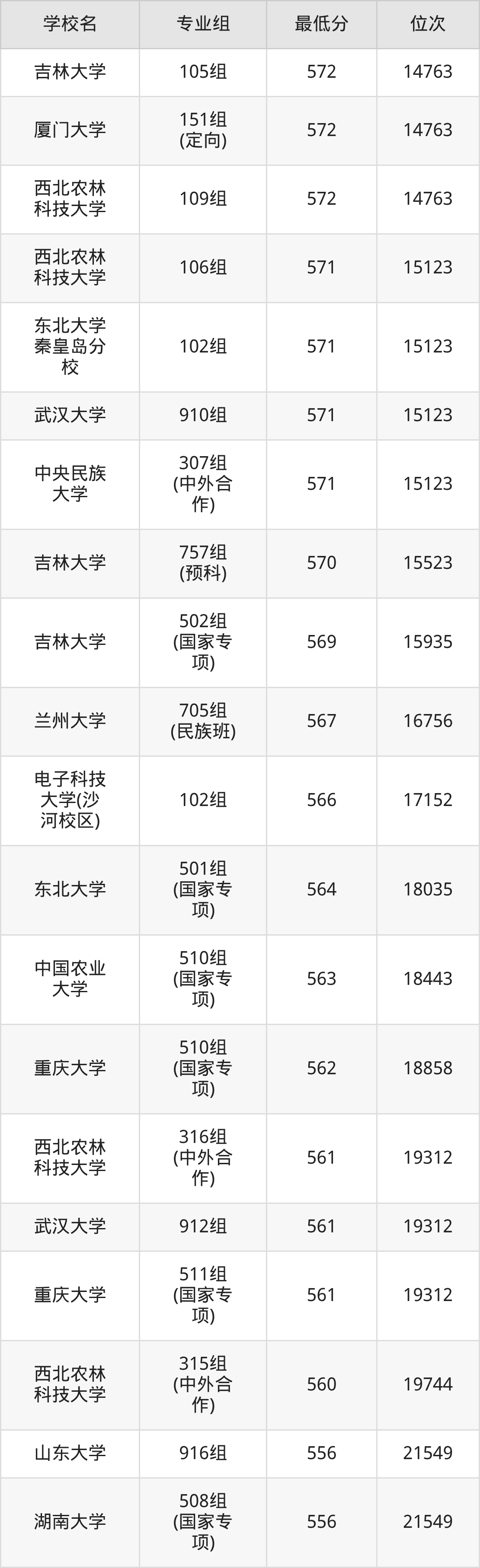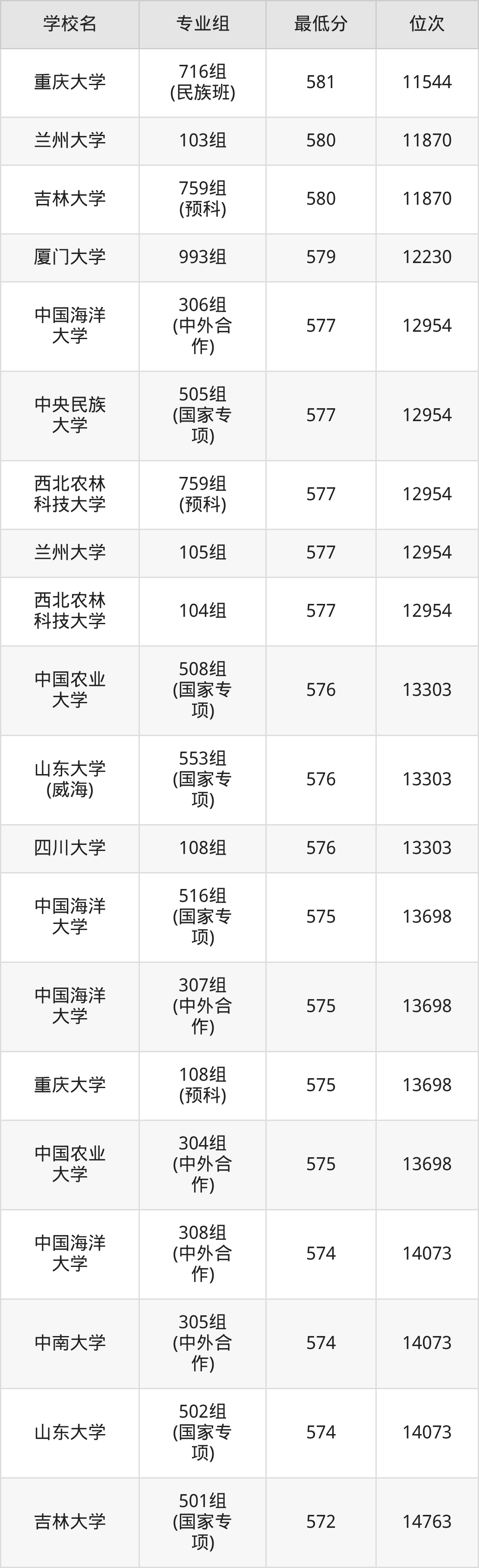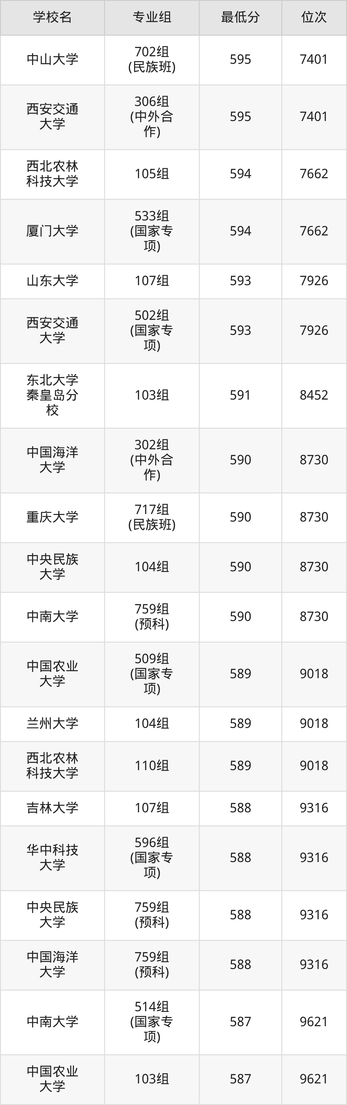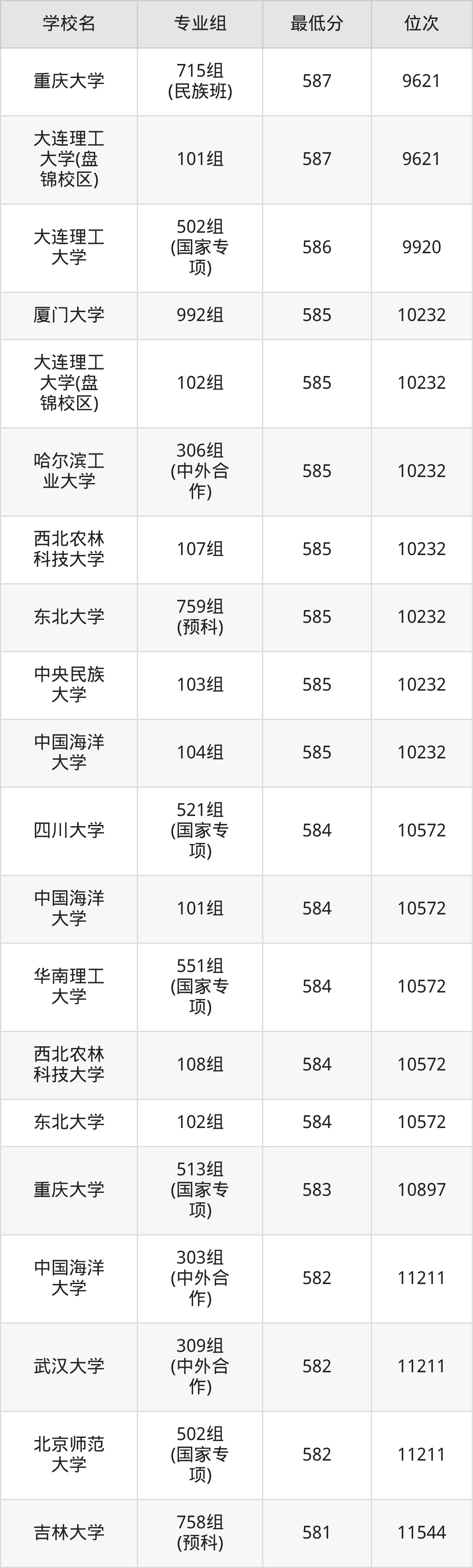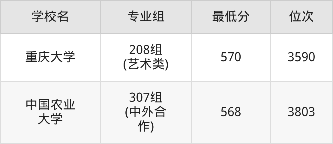 (2)中国农业大学:2025年985分数线568分到603分,位次区间是3803名到1103名,招生专业组有3个,最低为307组(中外合作)、最高为105组。