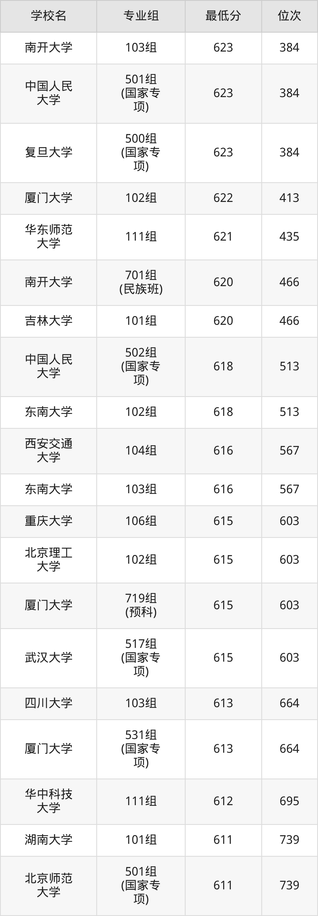 (1)南开大学:2025年985分数线623分到629分,位次区间是2353名到1708名,招生专业组有2个,最低为102组、最高为101组。